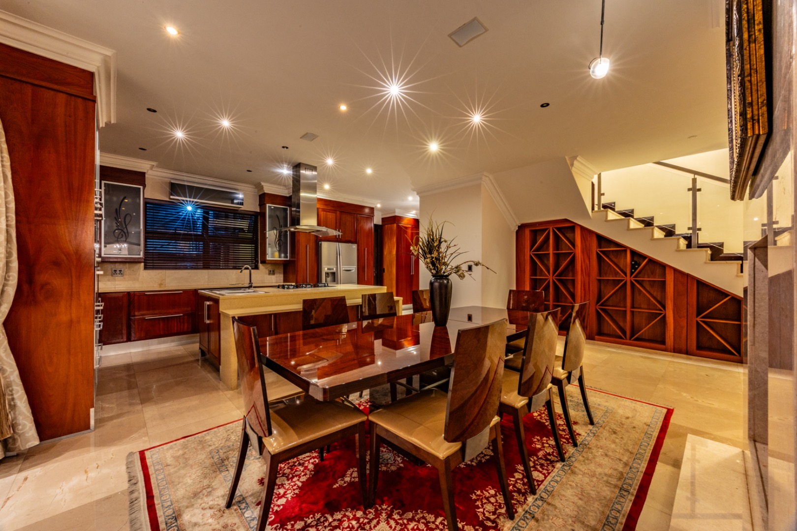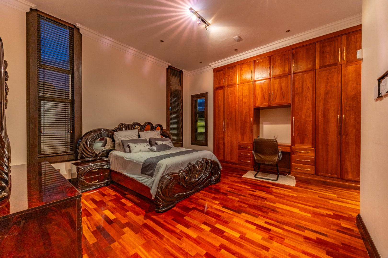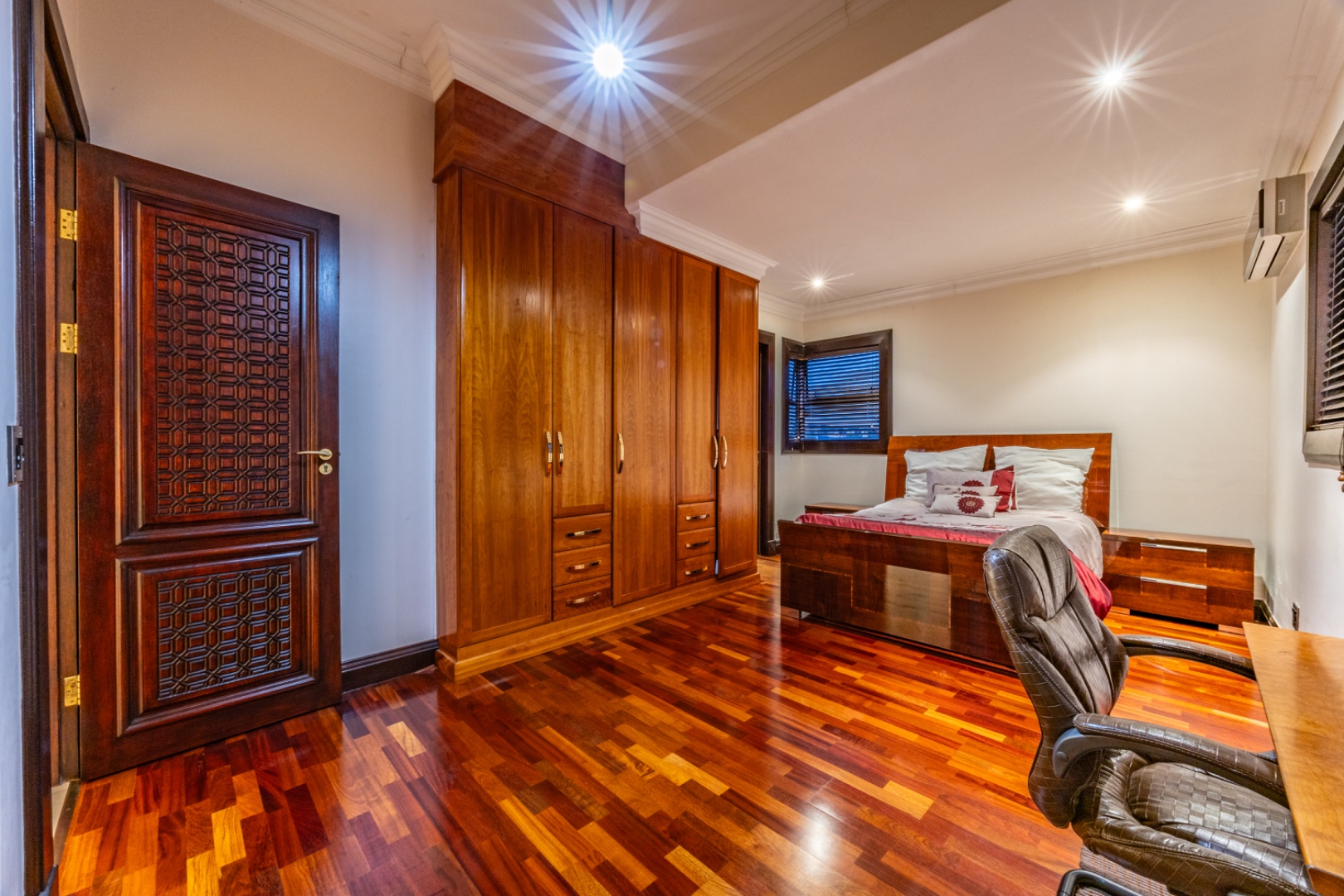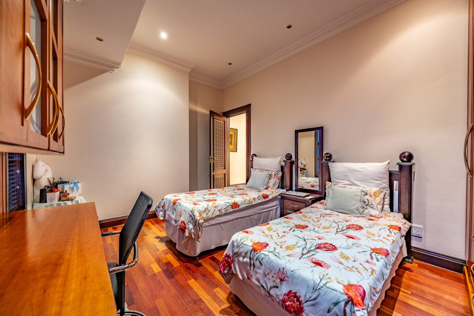 This remarkable home offers 7 spacious bedrooms and 9 bathrooms, with 6 bedrooms featuring private en-suite bathrooms, heated towel rails and high-end sanitary finishes. Wooden flooring in the bedrooms, carved wooden doors and marble finishes throughout the home add warmth and sophistication.