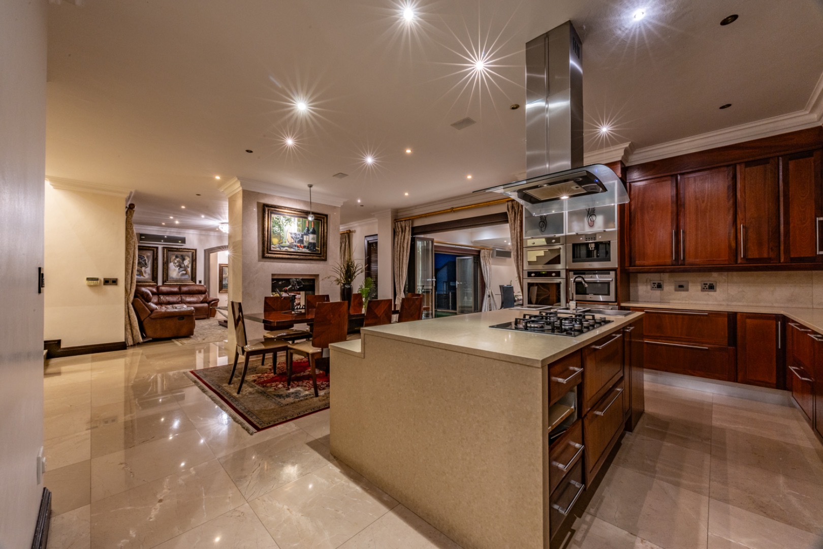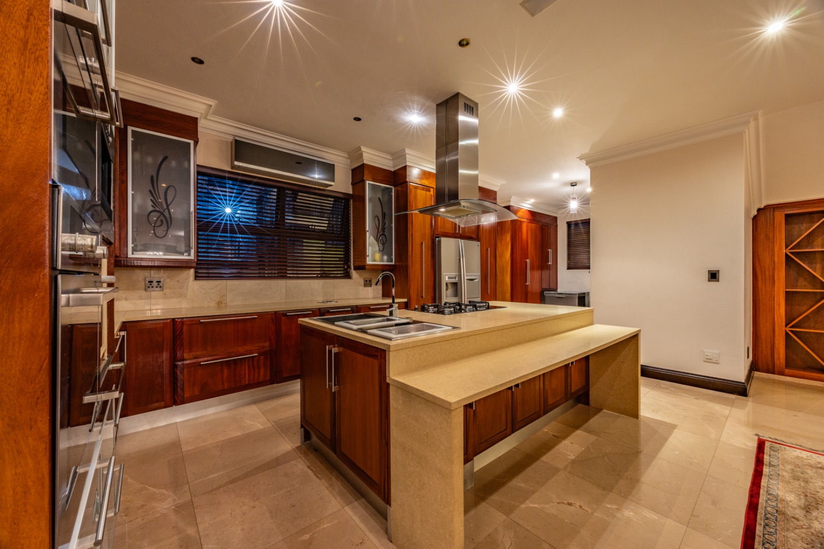 - Large island workspace with extractor fan