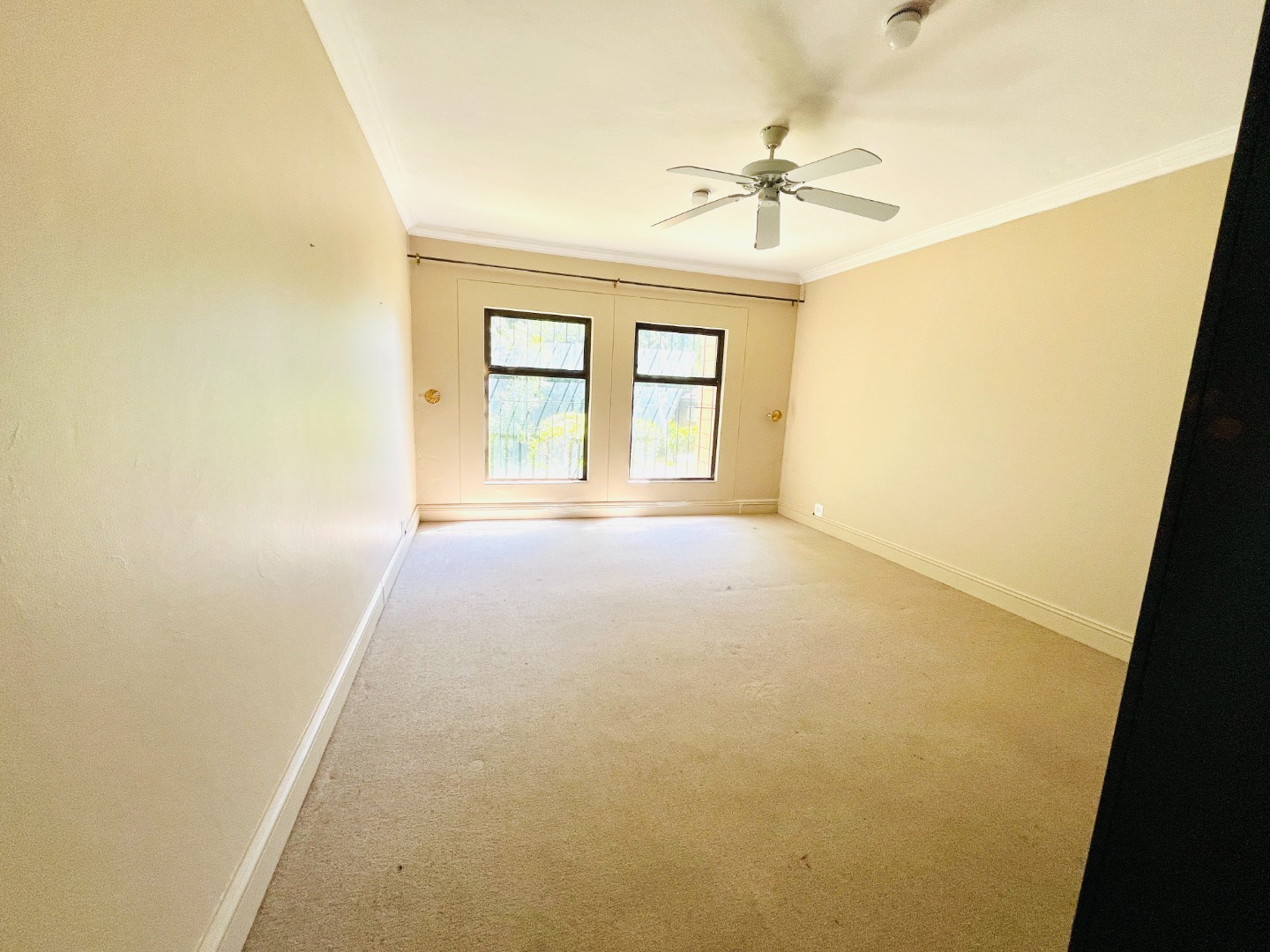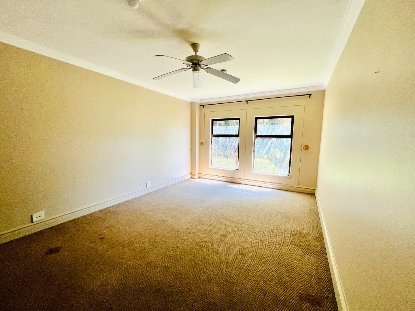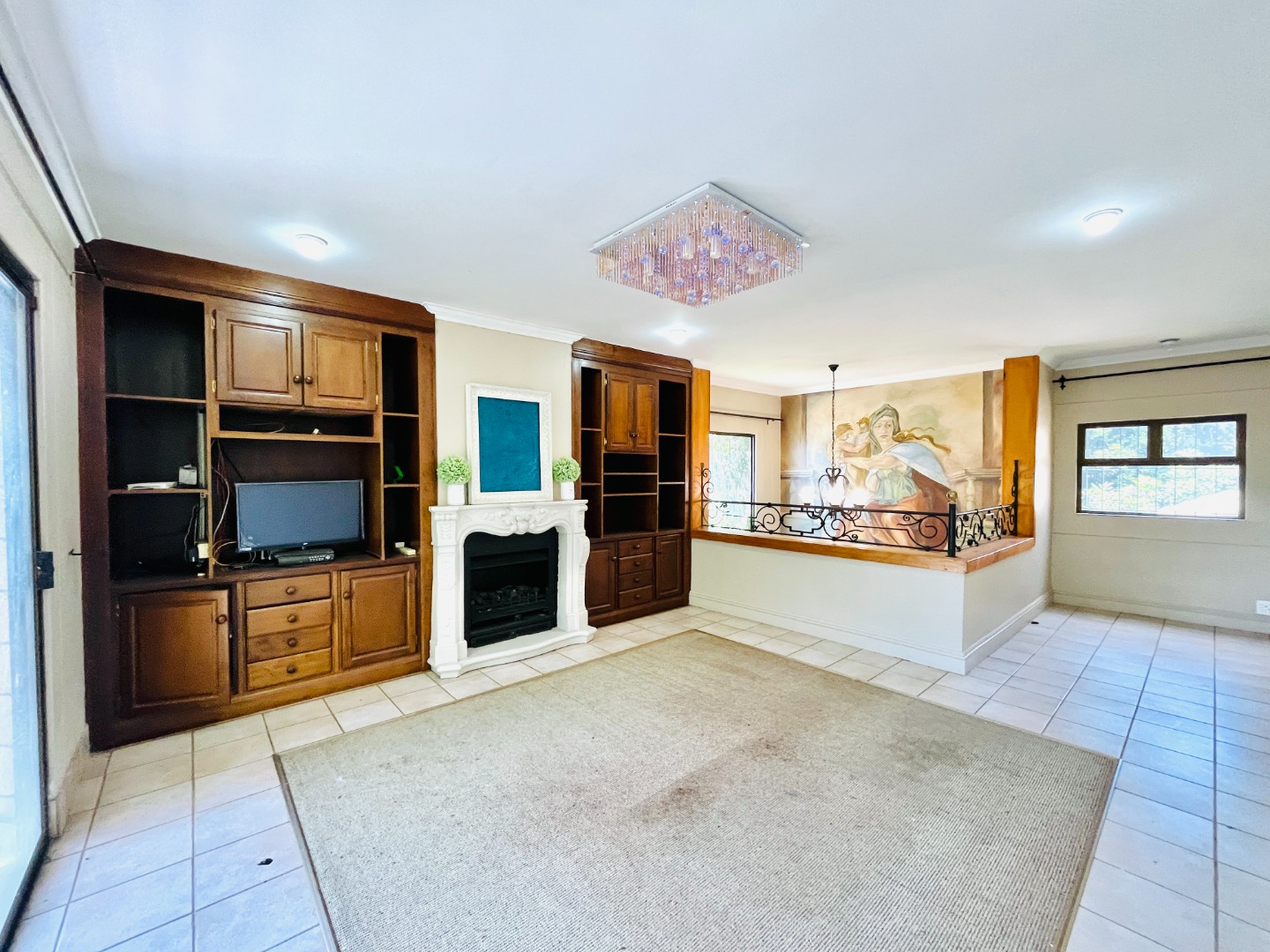 The two ground-floor bedrooms are spacious, fitted with built-in cupboards, and large enough to accommodate king-sized beds. These rooms share a full bathroom with a separate toilet. Upstairs, the main bedroom offers a private retreat with a full en-suite bathroom, walk-in cupboards, and a ceiling fan. The upper level also includes a comfortable pyjama lounge with a gas fireplace, ideal for cozy winter evenings, as well as a spacious balcony overlooking the beautifully landscaped garden.