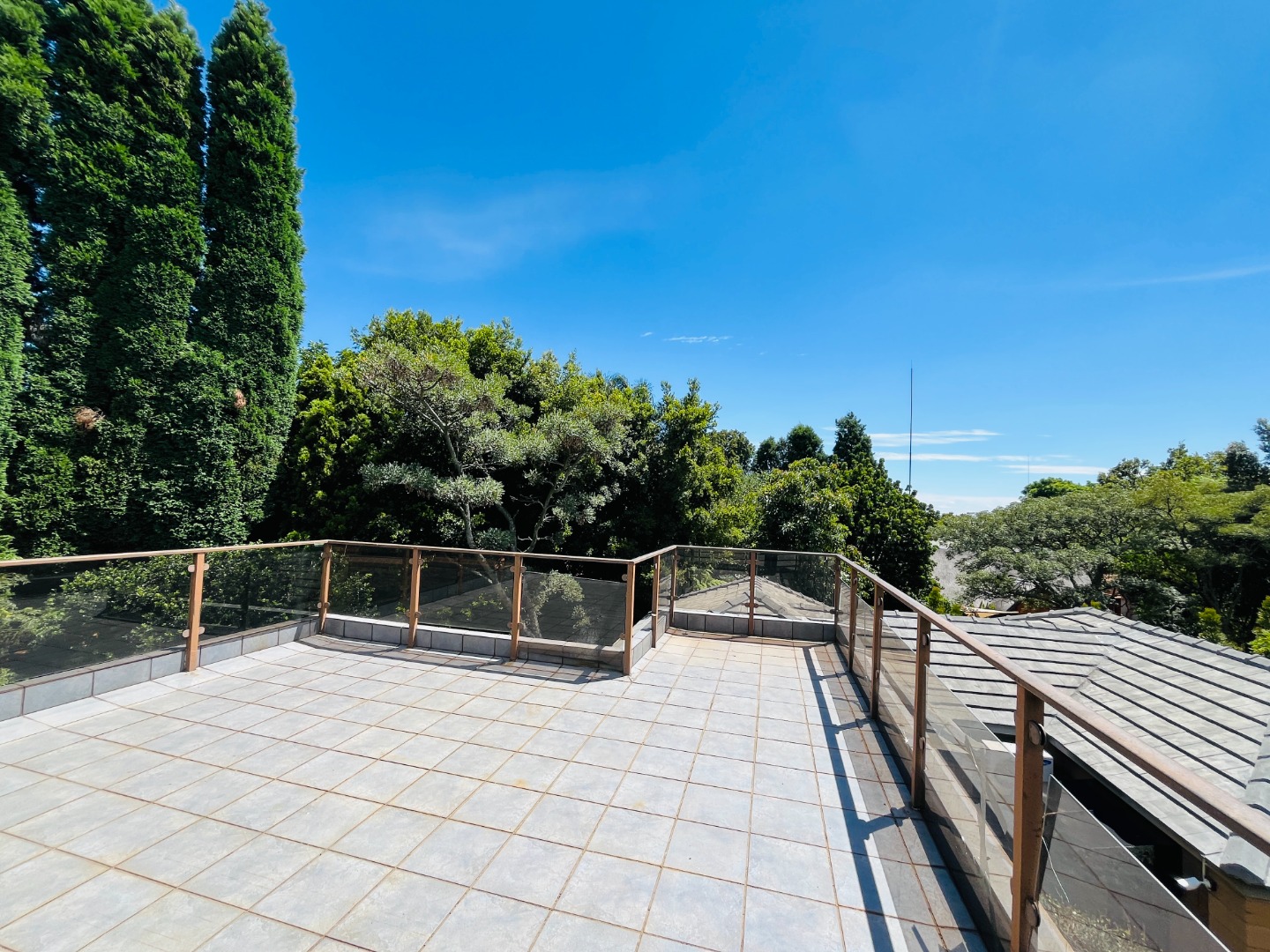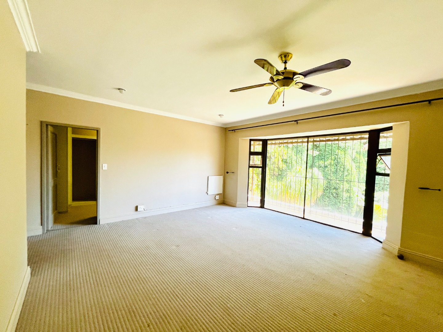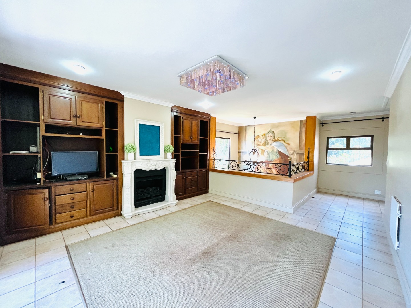 The two ground-floor bedrooms are spacious, fitted with built-in cupboards, and large enough to accommodate king-sized beds. These rooms share a full bathroom with a separate toilet. Upstairs, the main bedroom offers a private retreat with a full en-suite bathroom, walk-in cupboards, and a ceiling fan. The upper level also includes a comfortable pyjama lounge with a gas fireplace, ideal for cozy winter evenings, as well as a spacious balcony overlooking the beautifully landscaped garden.