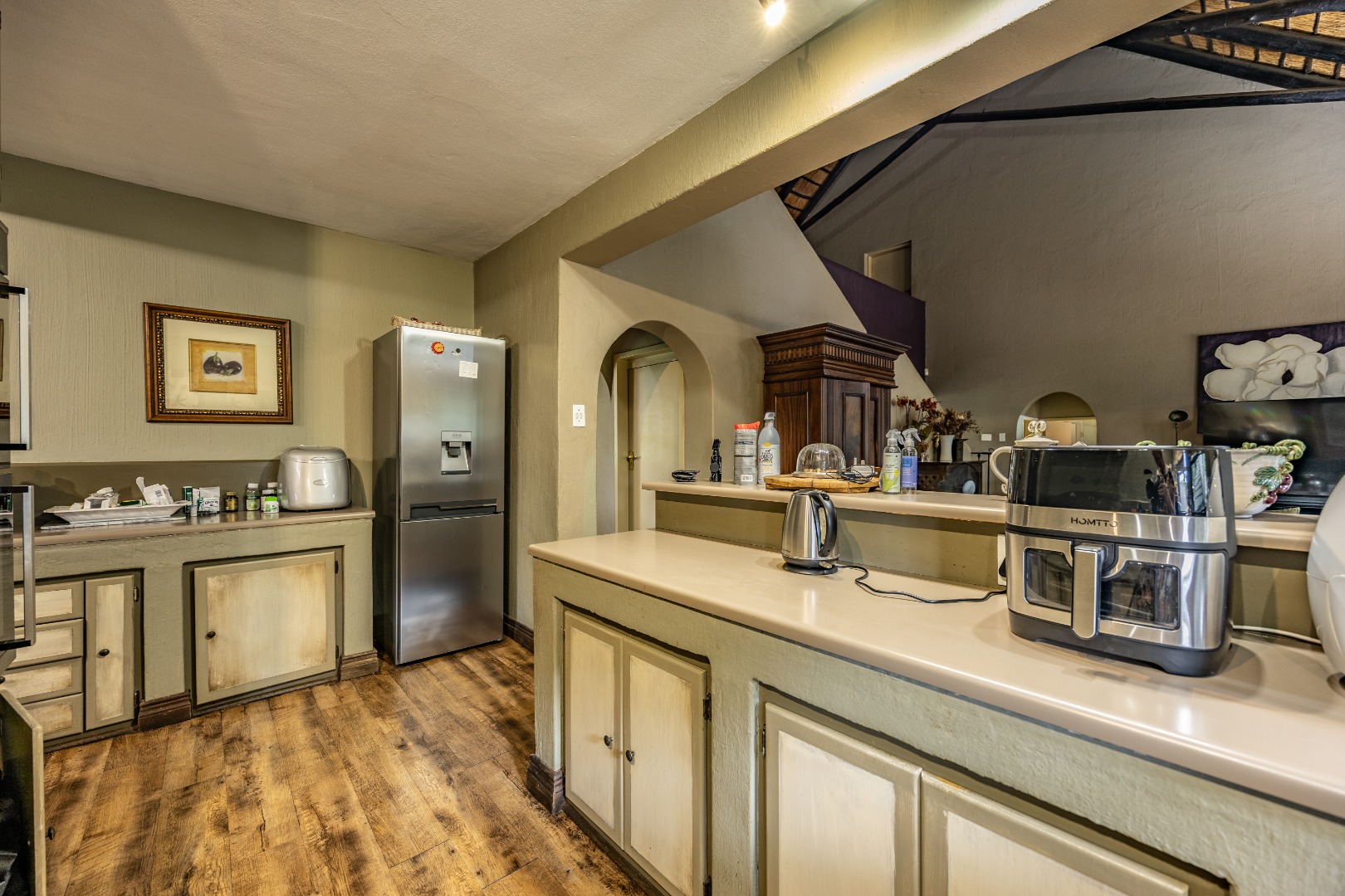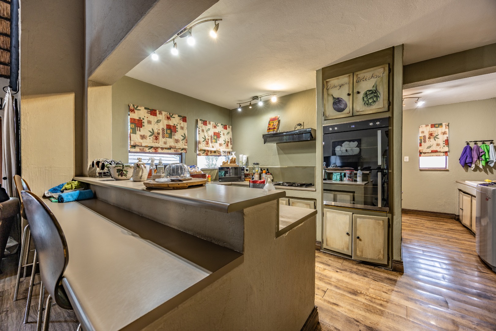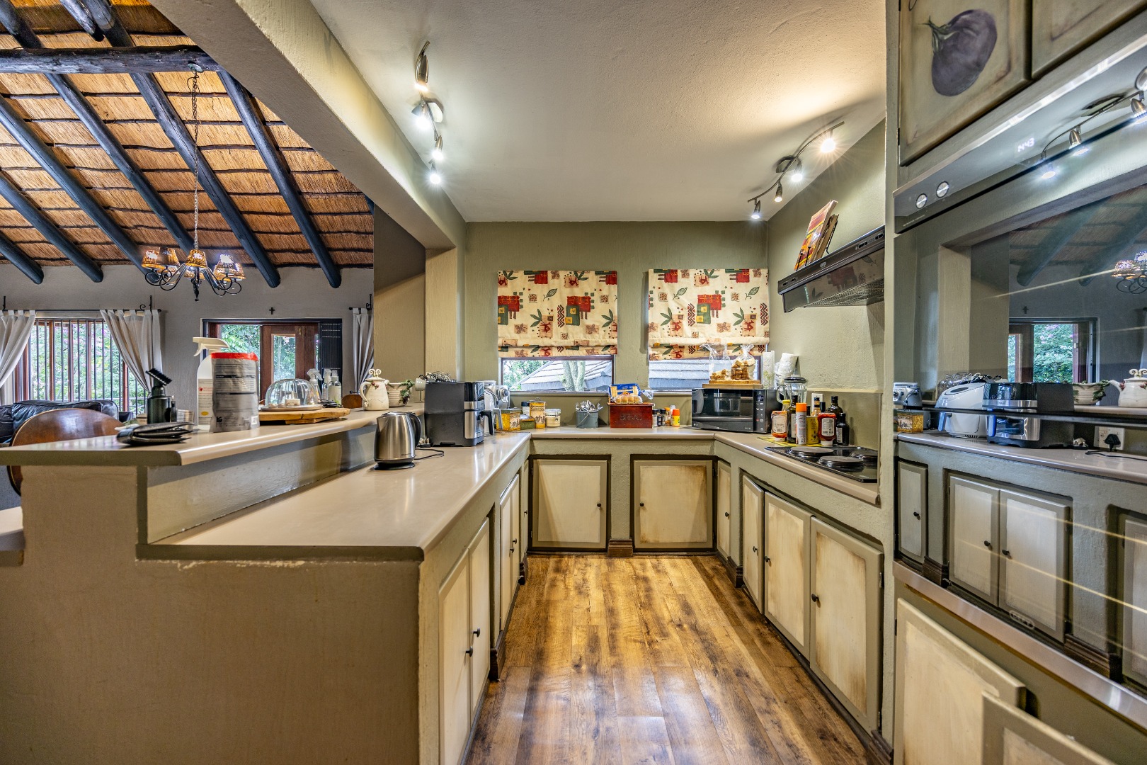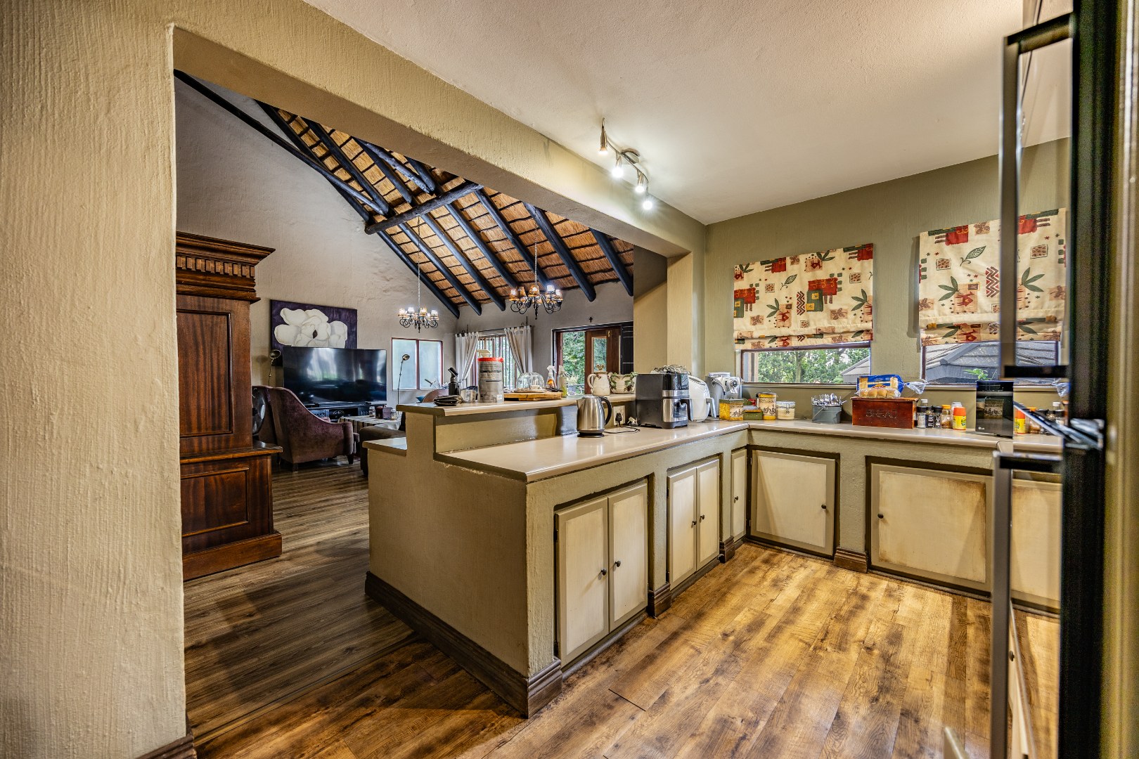 The open-plan kitchen is both practical and inviting, featuring a breakfast counter and a scullery with space for four appliances. Additional conveniences include extra storage neatly tucked away under the staircase and an inverter system that keeps the electricity running for up to eight hours. Outdoors, the courtyard offers a domestic room with shower and toilet, a pizza oven with boma for entertaining, and a garden gate for easy access by domestic or garden services.