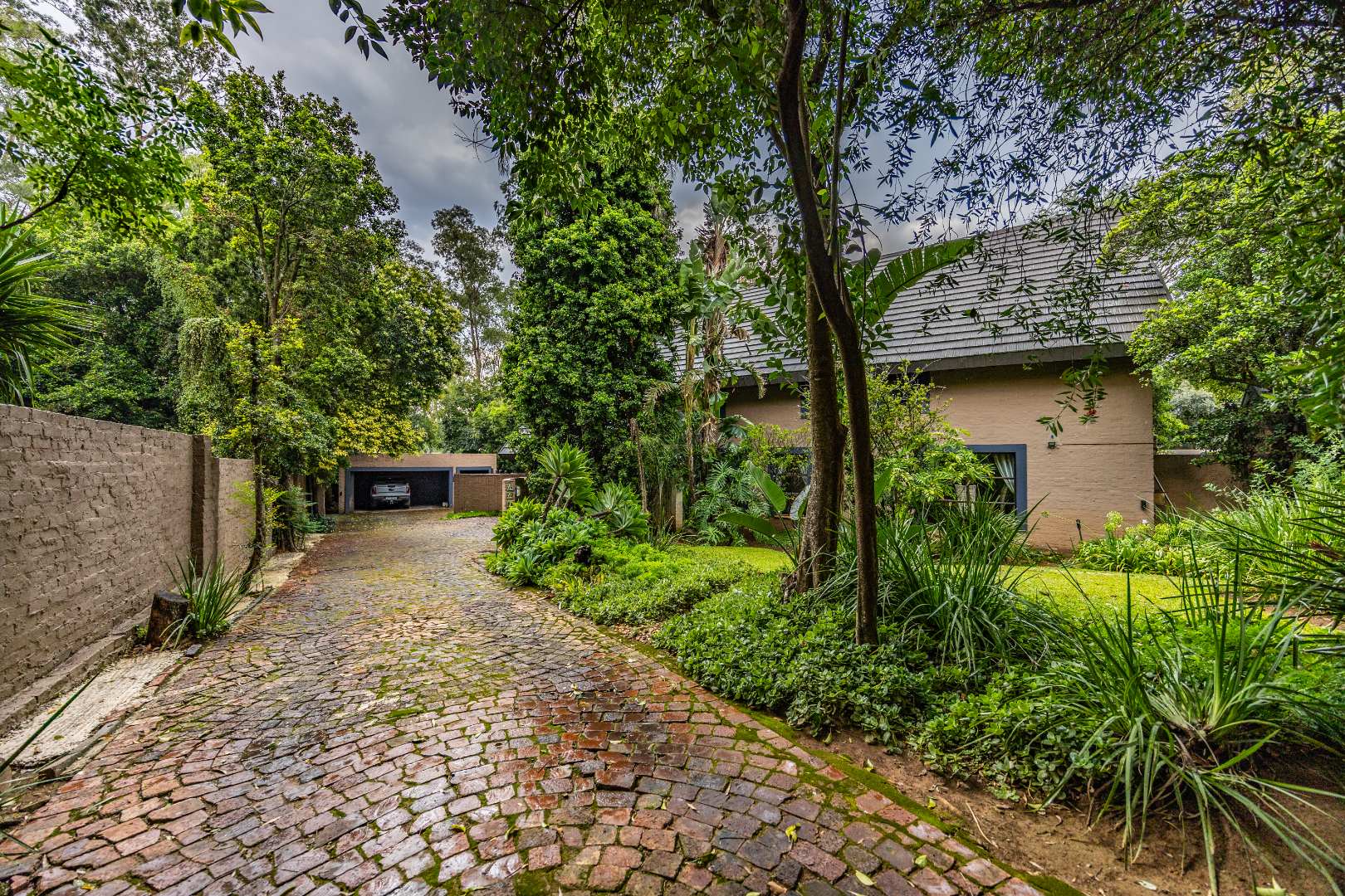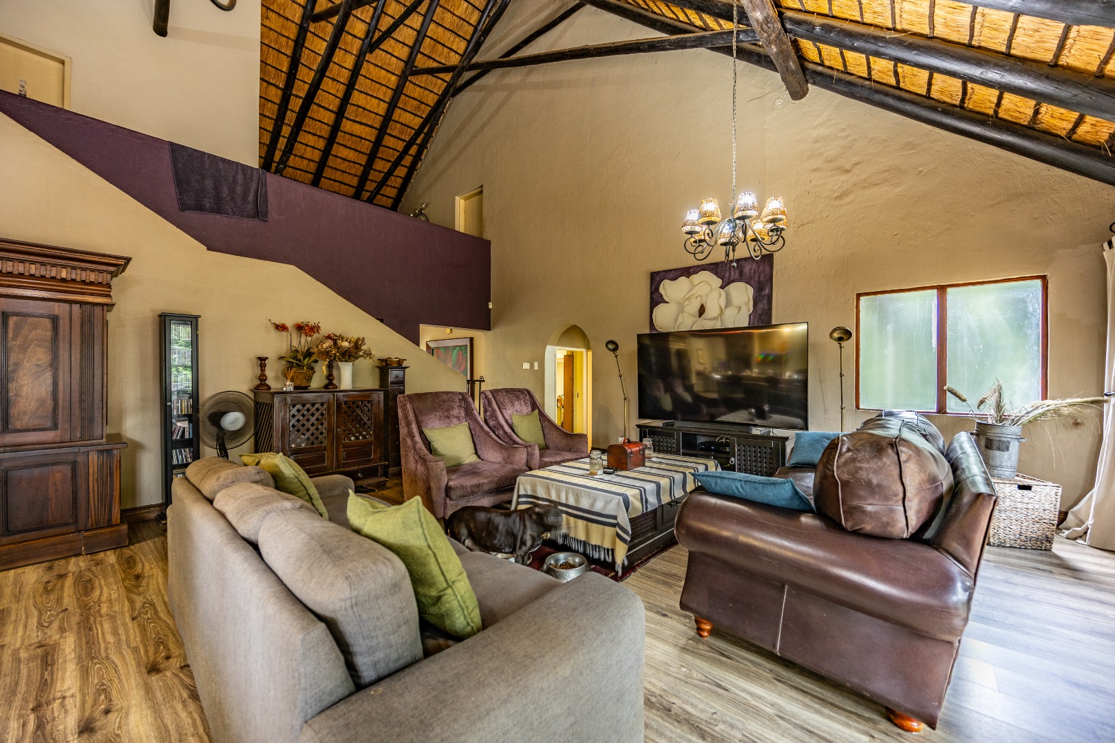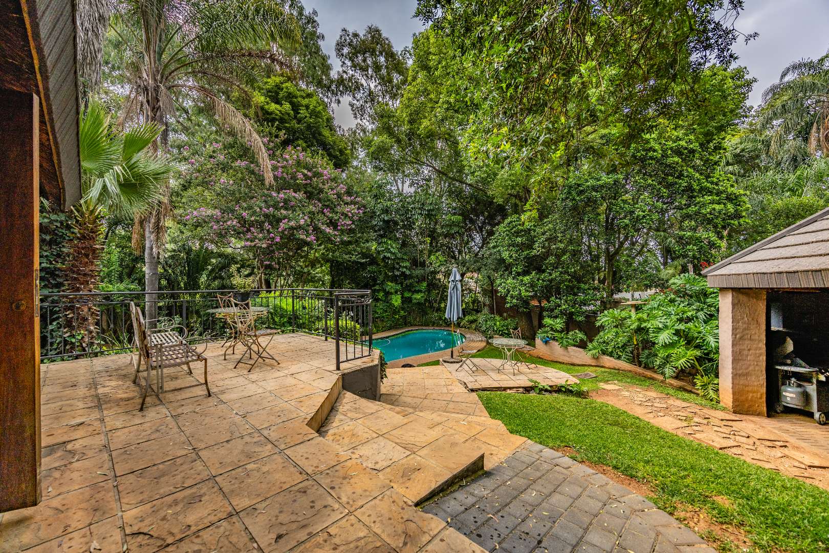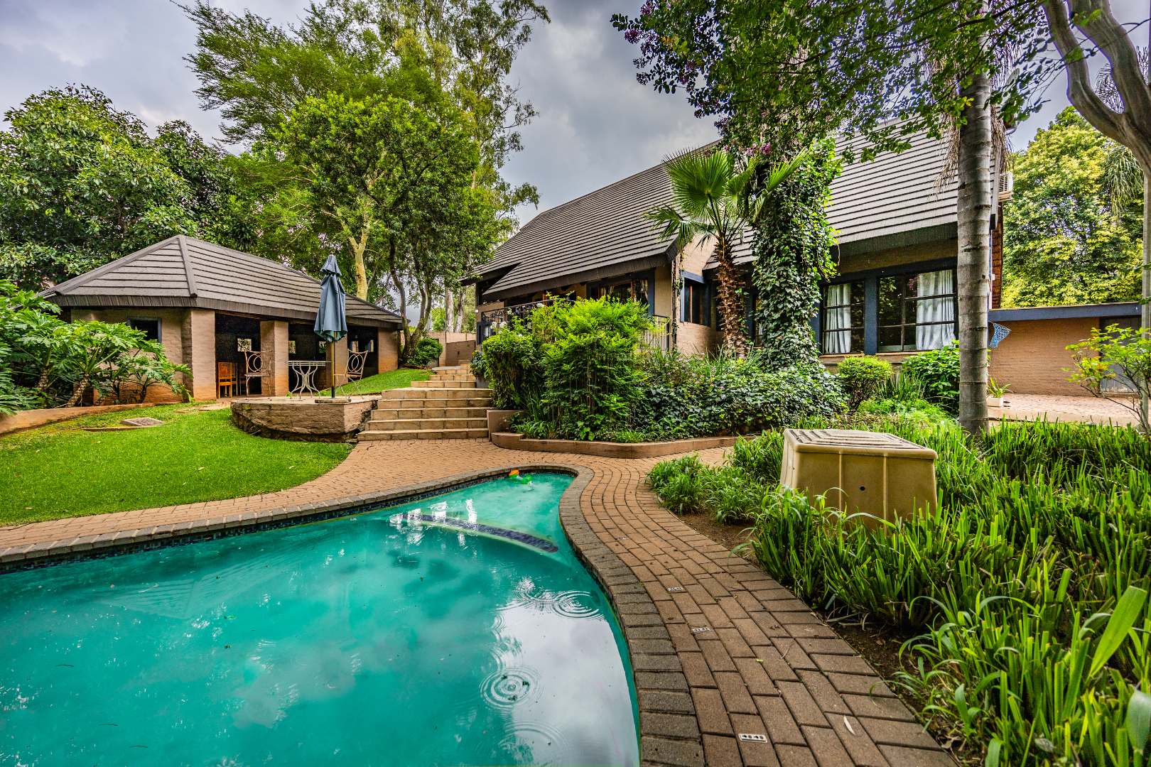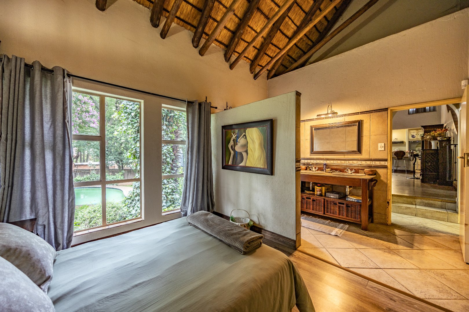 The open-plan kitchen is both practical and inviting, featuring a breakfast counter and a scullery with space for four appliances. Additional conveniences include extra storage neatly tucked away under the staircase and an inverter system that keeps the electricity running for up to eight hours. Outdoors, the courtyard offers a domestic room with shower and toilet, a pizza oven with boma for entertaining, and a garden gate for easy access by domestic or garden services.