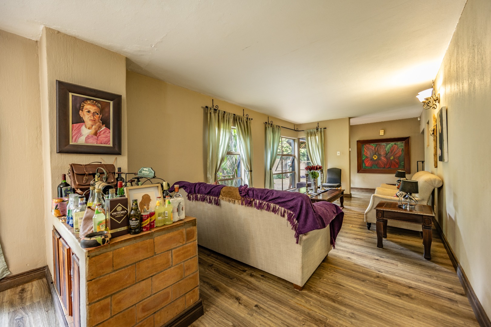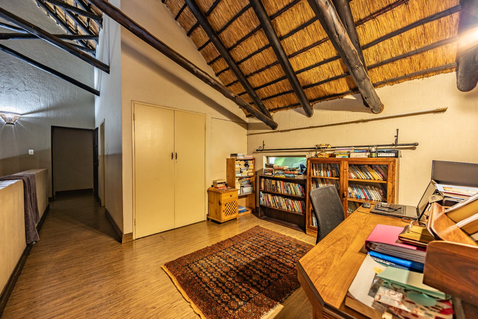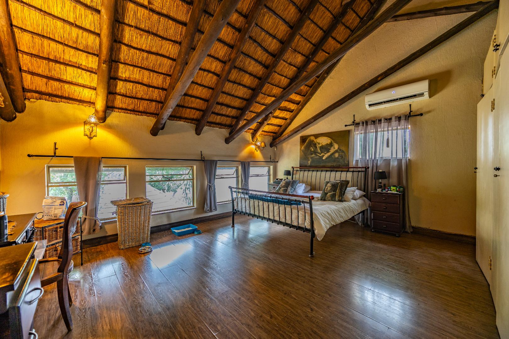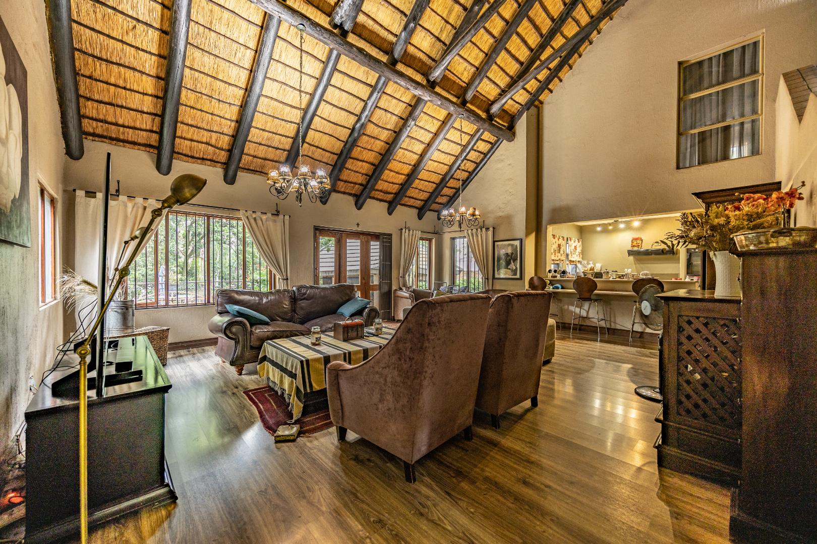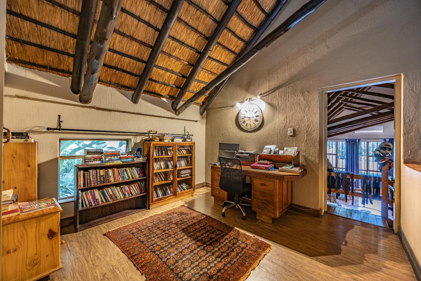 Upstairs you’ll find a study nook, three bedrooms, and a family bathroom. The main bedroom and second bedroom include built-in cupboards, while the first bedroom features wooden floors and no built-in cupboards. Air-conditioning is installed in all rooms, and the home is secured with an alarm system and security gates at the bedroom area. With an estimated 450m² under roof, the property is completed by a lapa and swimming pool, making it an ideal home for comfortable living and effortless entertaining.