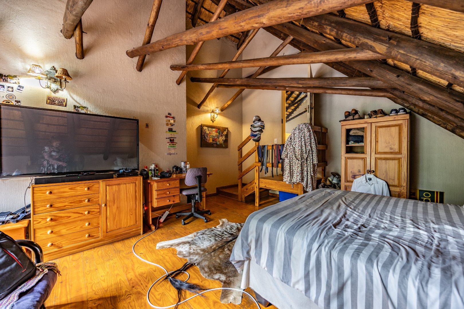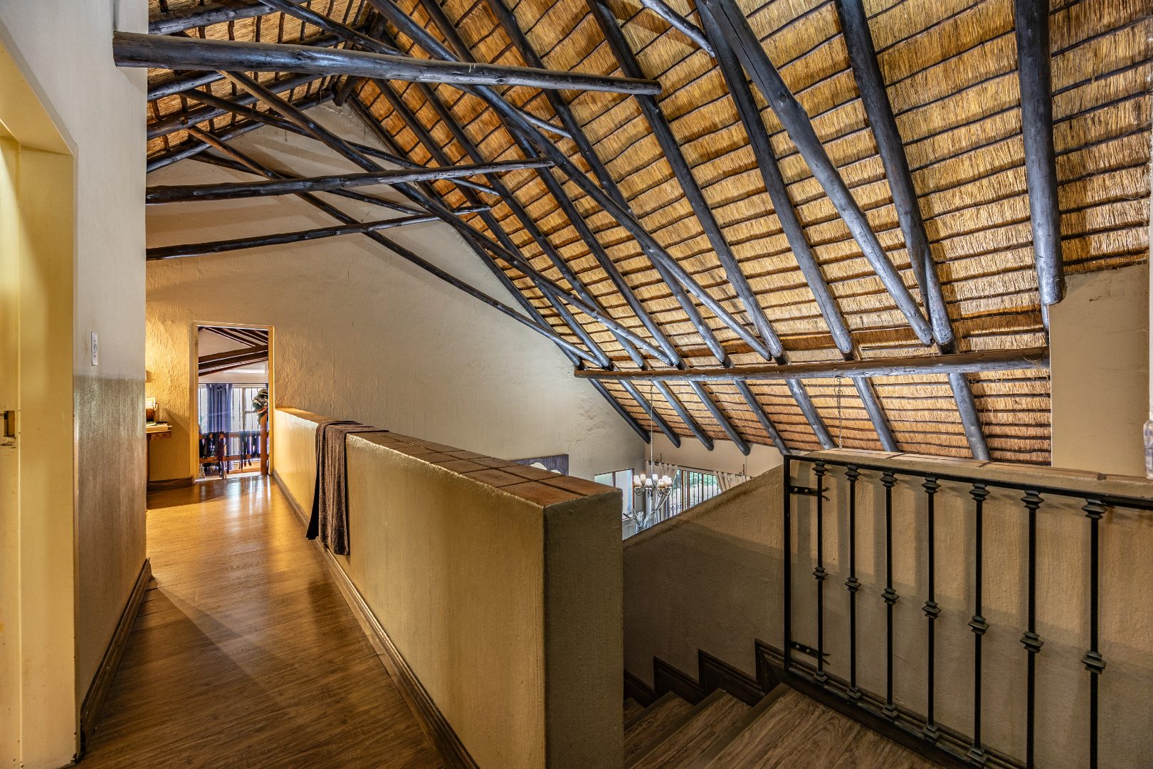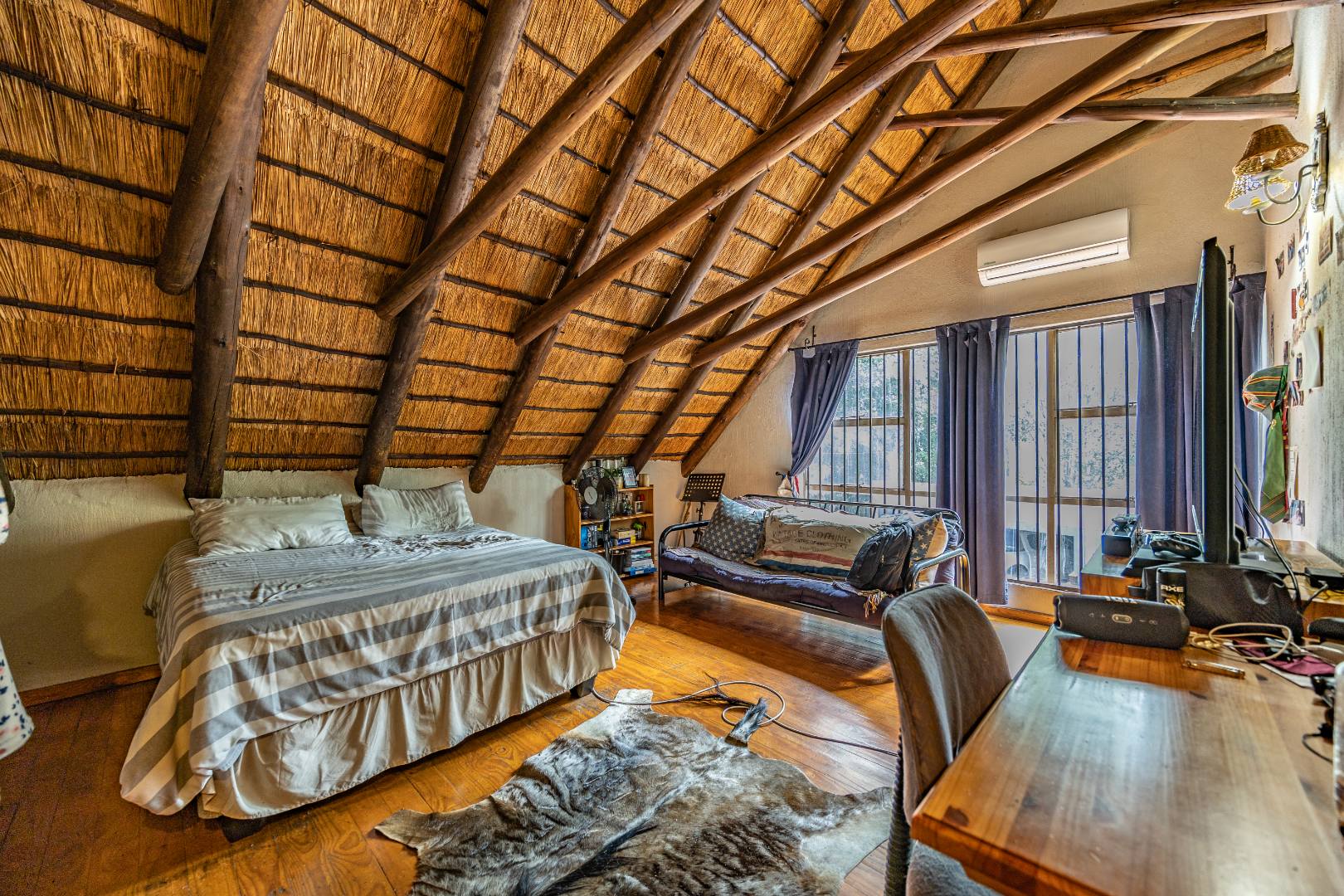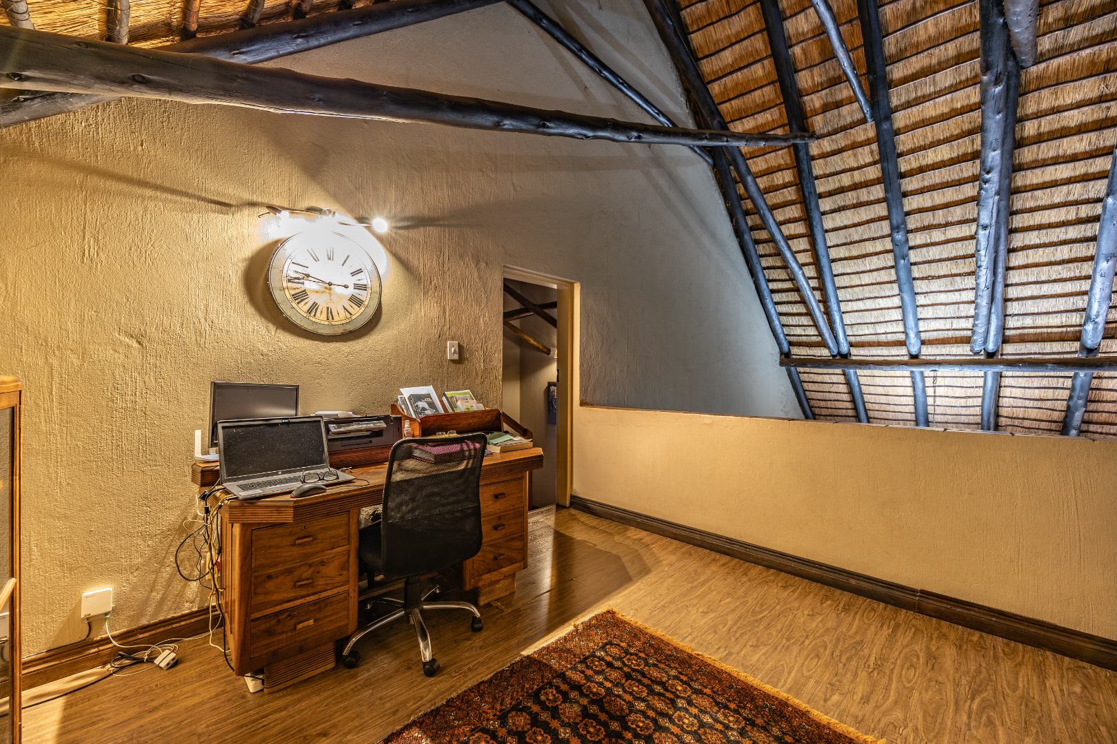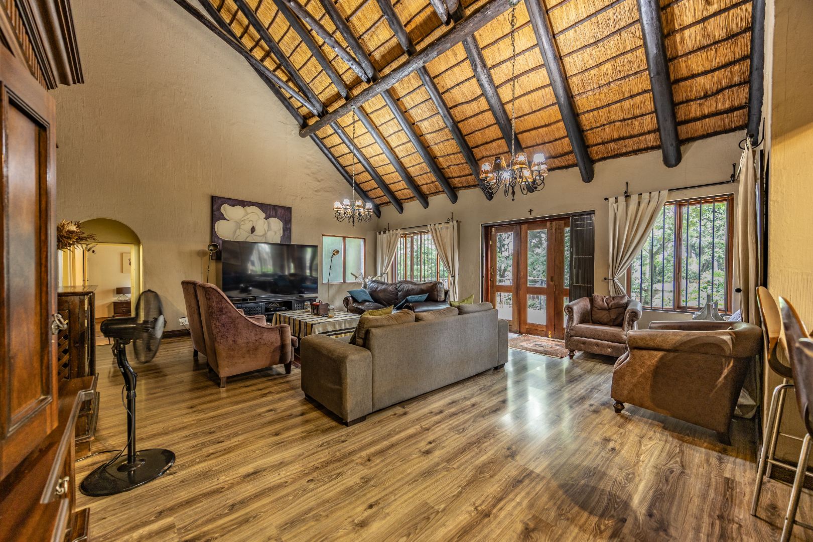 Upstairs you’ll find a study nook, three bedrooms, and a family bathroom. The main bedroom and second bedroom include built-in cupboards, while the first bedroom features wooden floors and no built-in cupboards. Air-conditioning is installed in all rooms, and the home is secured with an alarm system and security gates at the bedroom area. With an estimated 450m² under roof, the property is completed by a lapa and swimming pool, making it an ideal home for comfortable living and effortless entertaining.