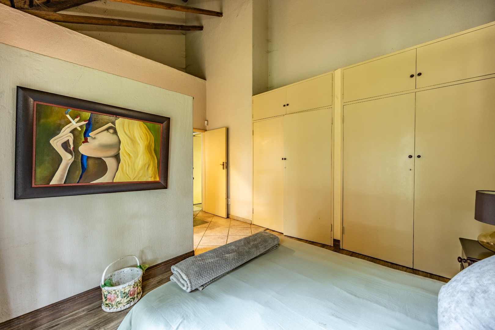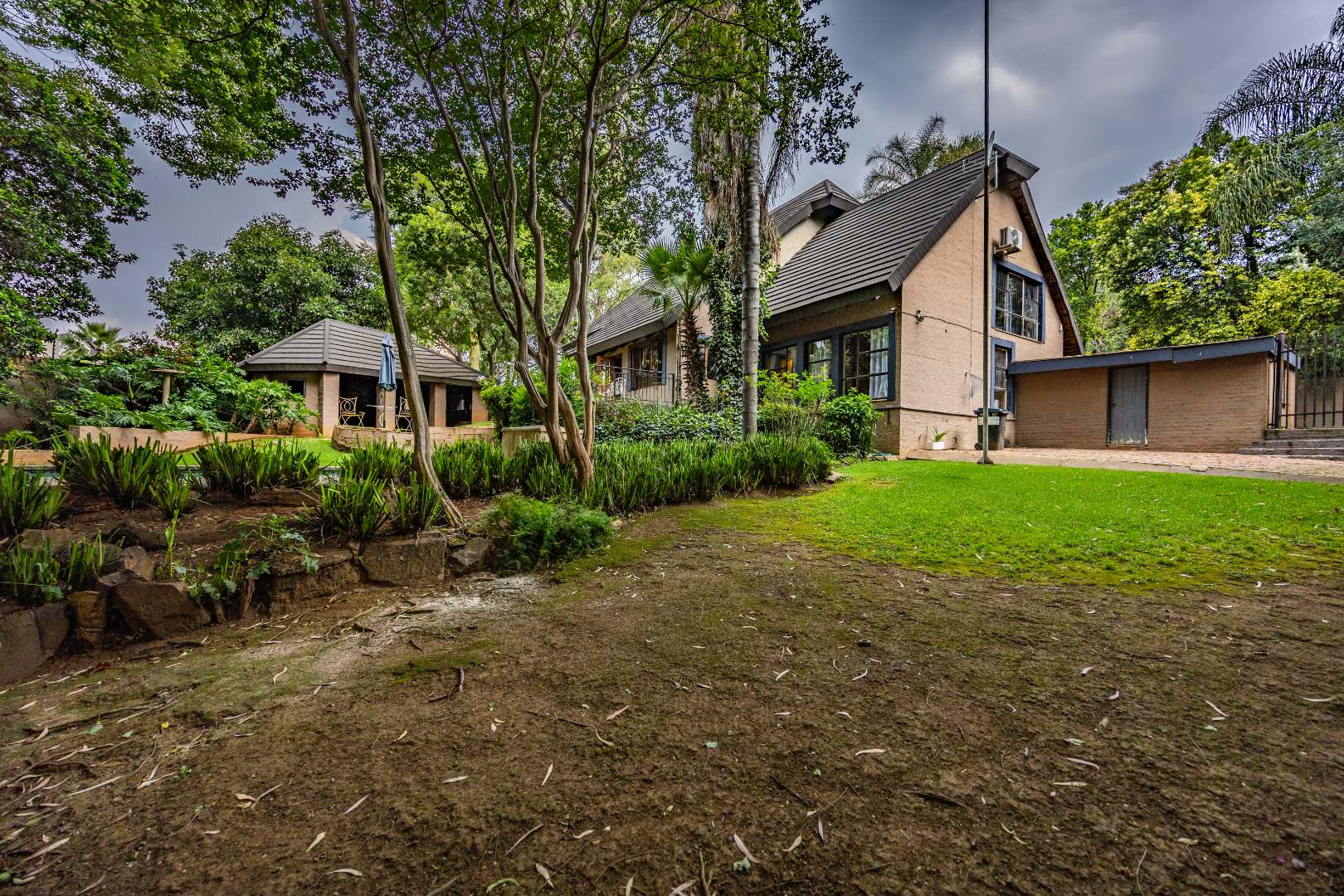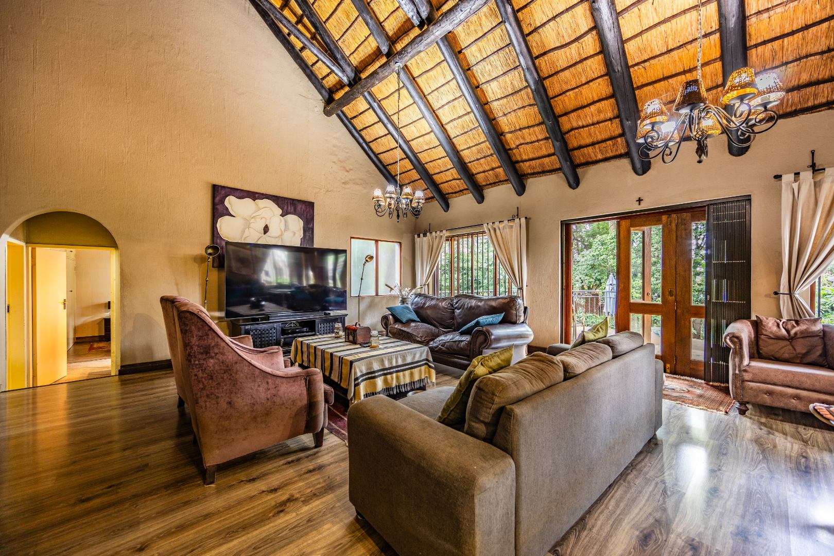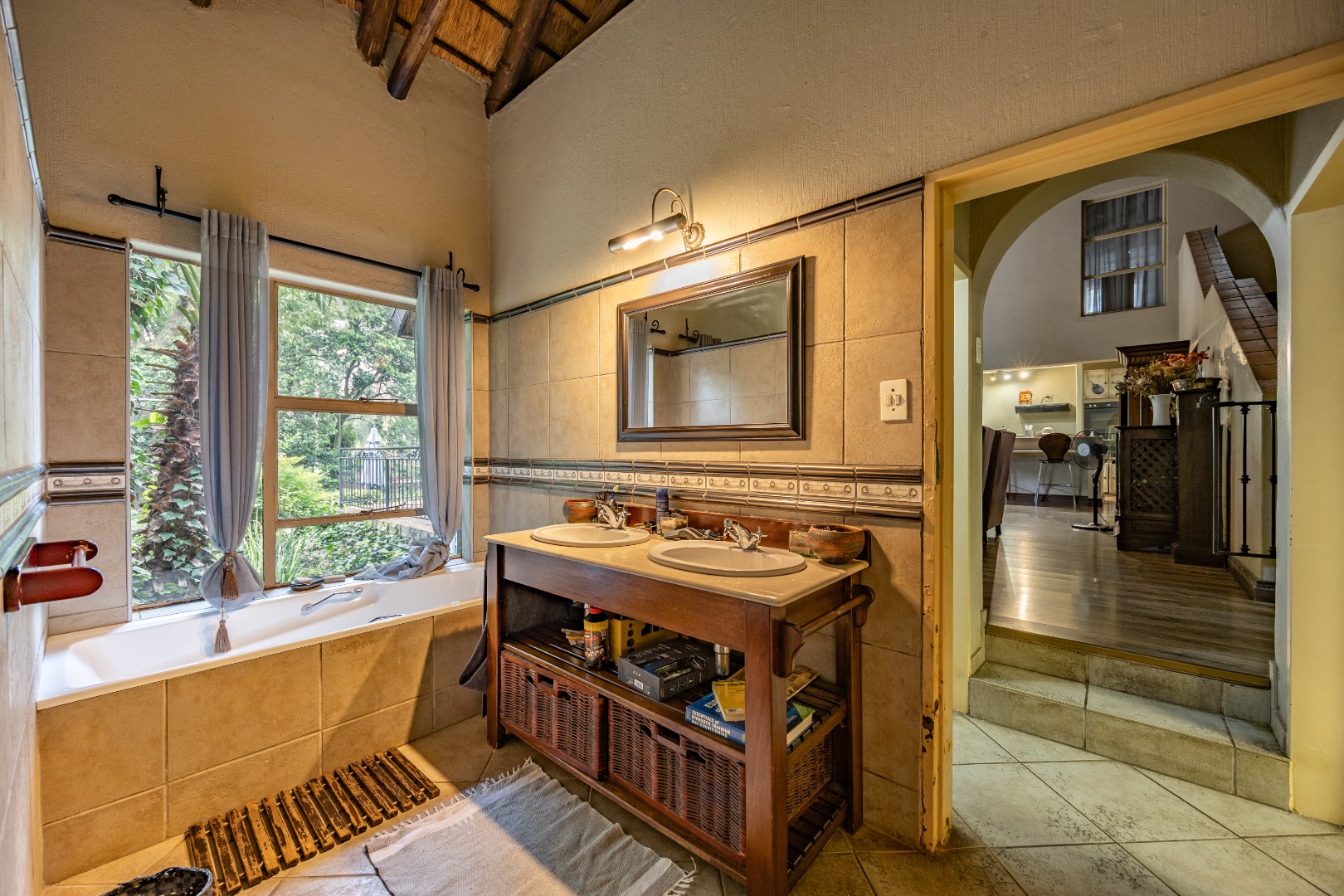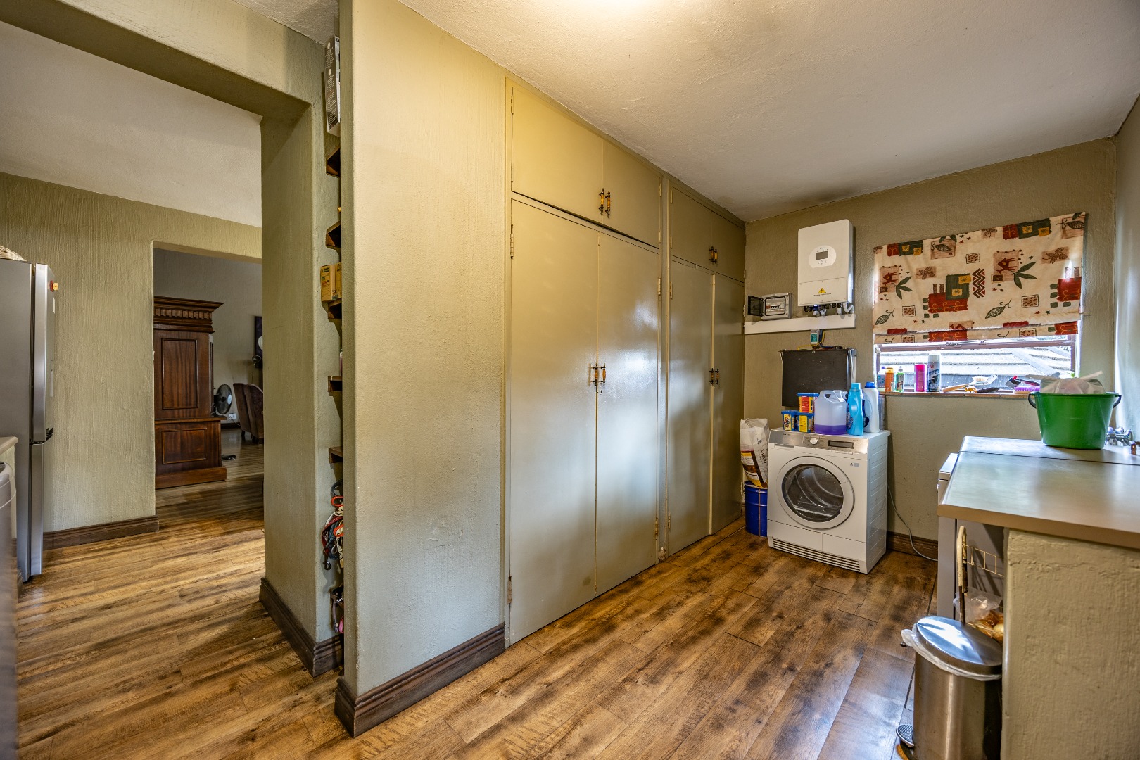 This well-designed home offers a welcoming entrance that opens to a formal lounge and dining area with laminated flooring, creating a warm and elegant first impression. On the ground floor you’ll find a guest bedroom with built-in cupboards and a full en-suite bathroom with bath and double basin, as well as a separate guest toilet. An extra-large room with doors leading outside provides versatile space, ideal for storage or conversion to suit your needs. The large living area flows effortlessly to the outdoors, perfect for relaxed family living.
