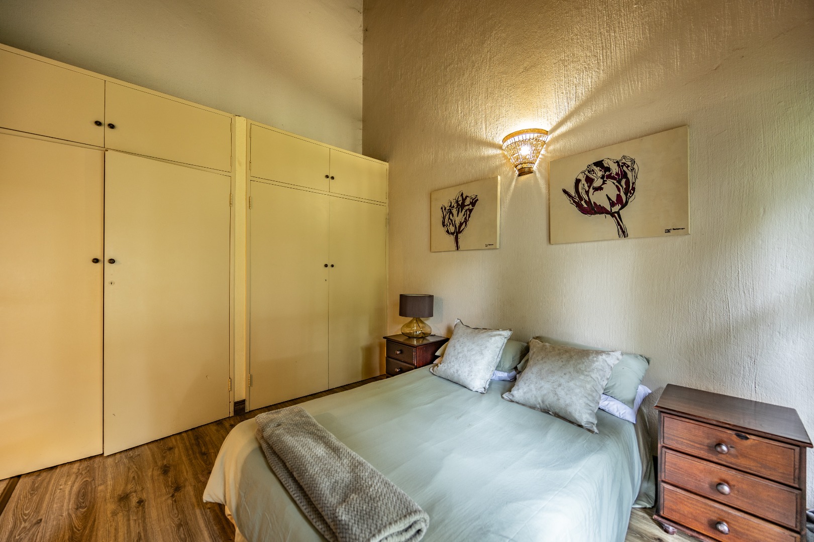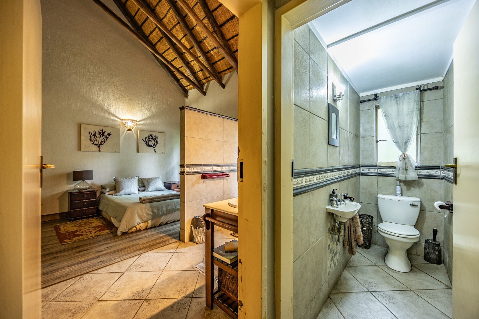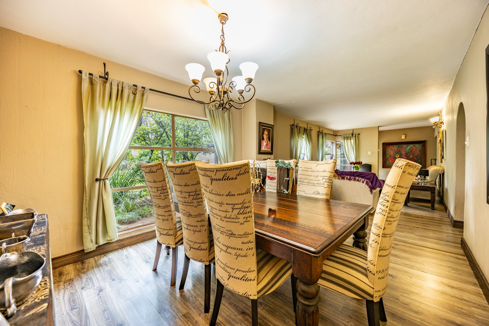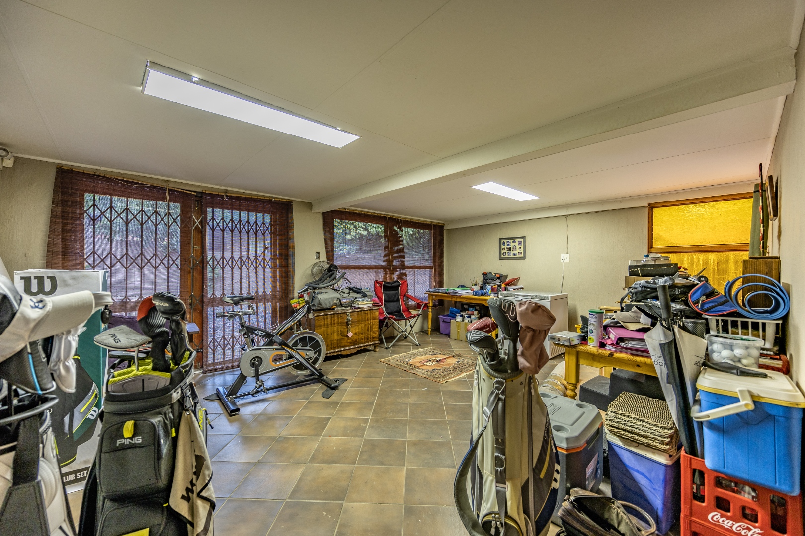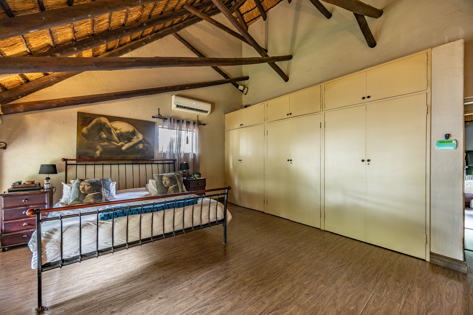 This well-designed home offers a welcoming entrance that opens to a formal lounge and dining area with laminated flooring, creating a warm and elegant first impression. On the ground floor you’ll find a guest bedroom with built-in cupboards and a full en-suite bathroom with bath and double basin, as well as a separate guest toilet. An extra-large room with doors leading outside provides versatile space, ideal for storage or conversion to suit your needs. The large living area flows effortlessly to the outdoors, perfect for relaxed family living.