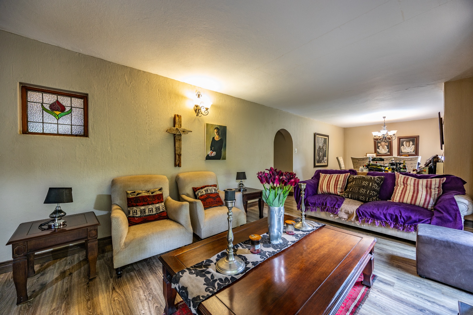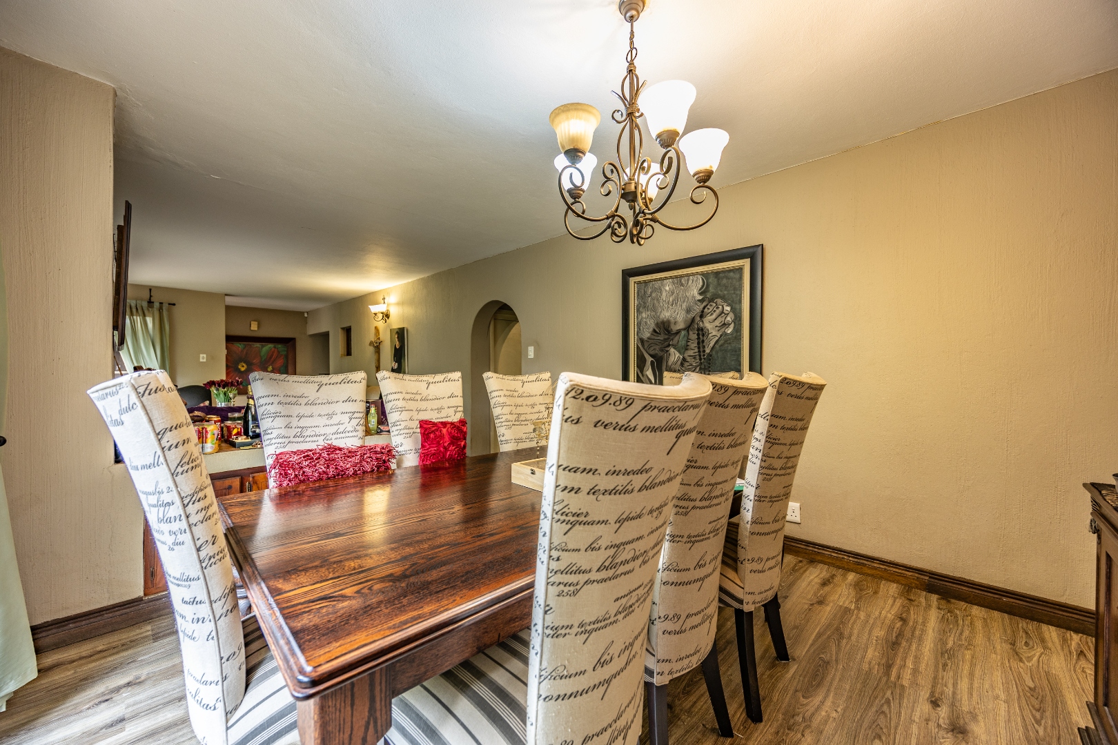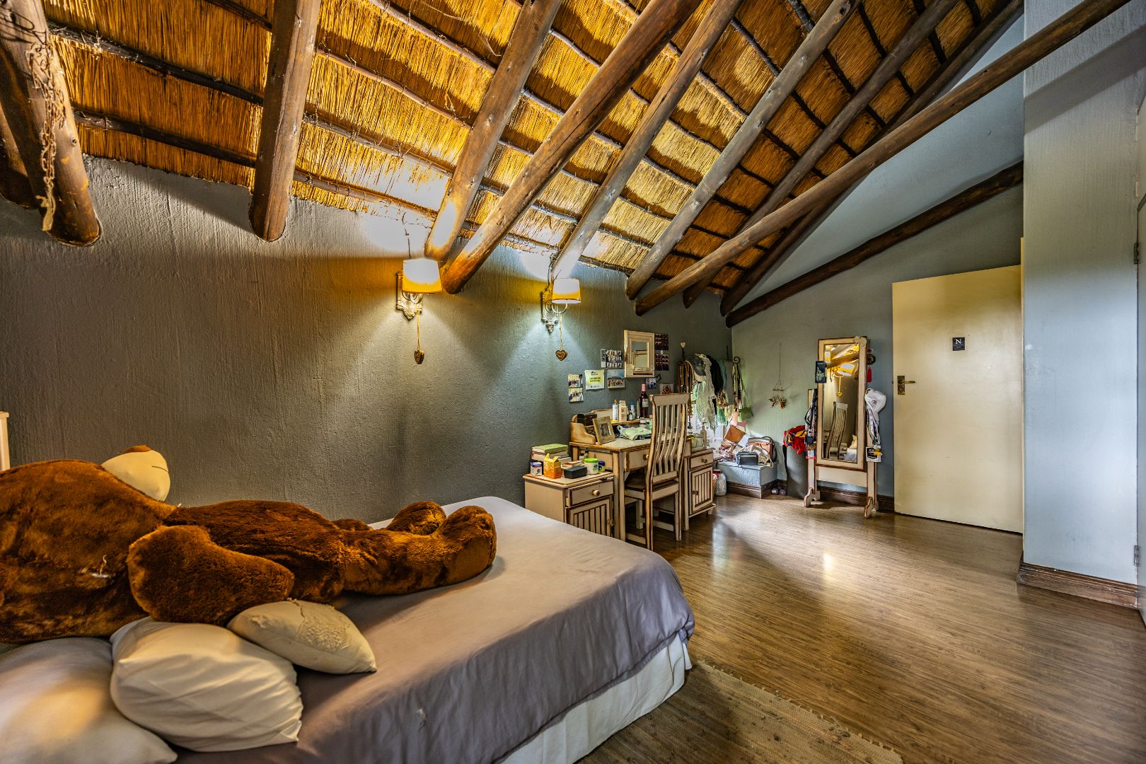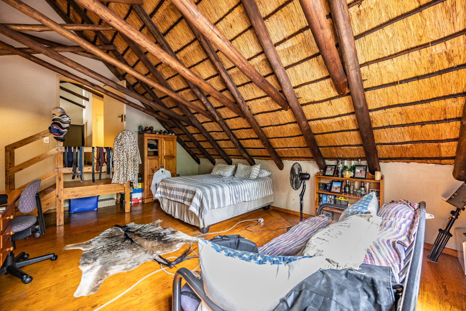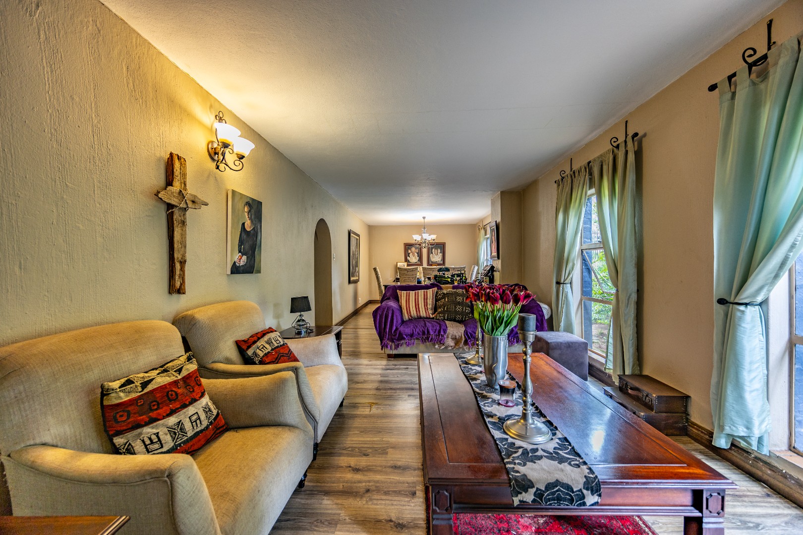 This well-designed home offers a welcoming entrance that opens to a formal lounge and dining area with laminated flooring, creating a warm and elegant first impression. On the ground floor you’ll find a guest bedroom with built-in cupboards and a full en-suite bathroom with bath and double basin, as well as a separate guest toilet. An extra-large room with doors leading outside provides versatile space, ideal for storage or conversion to suit your needs. The large living area flows effortlessly to the outdoors, perfect for relaxed family living.