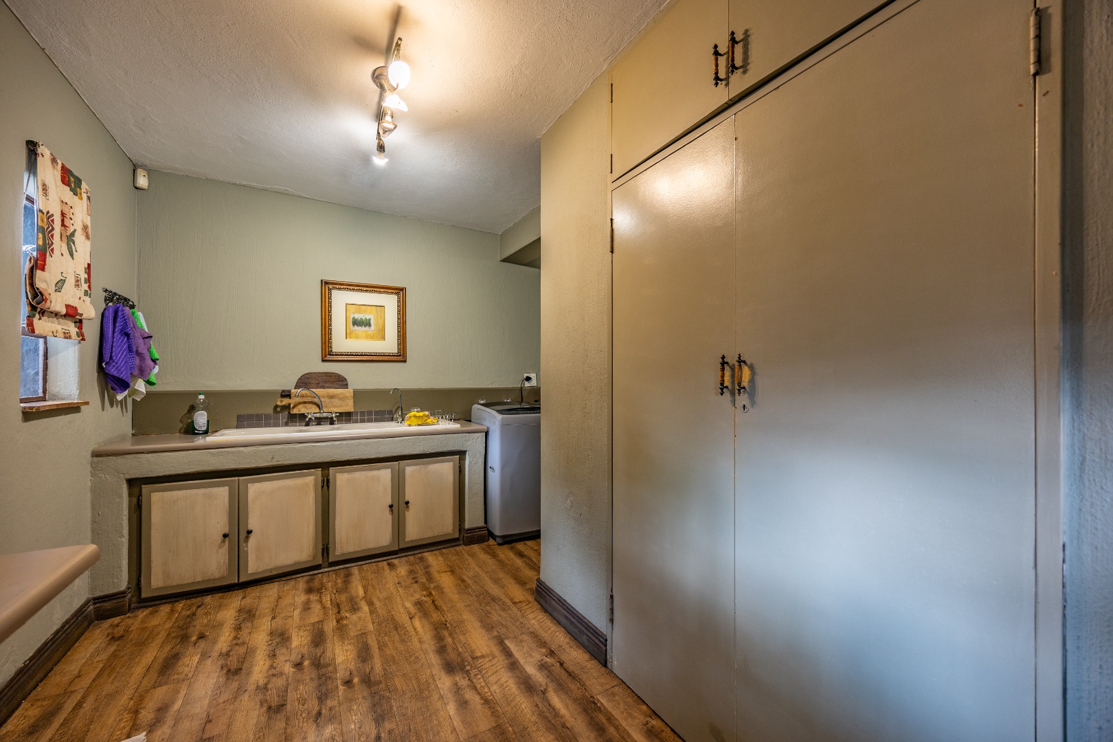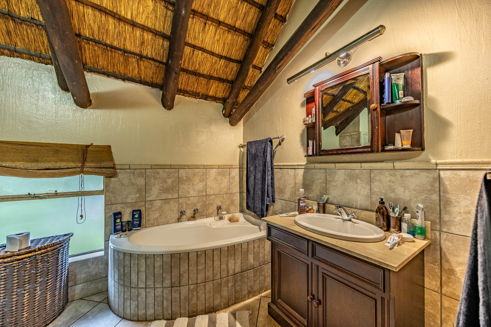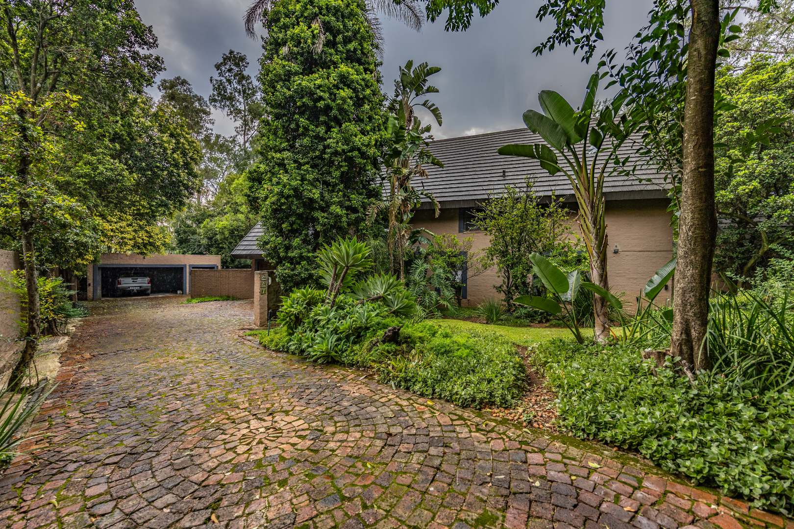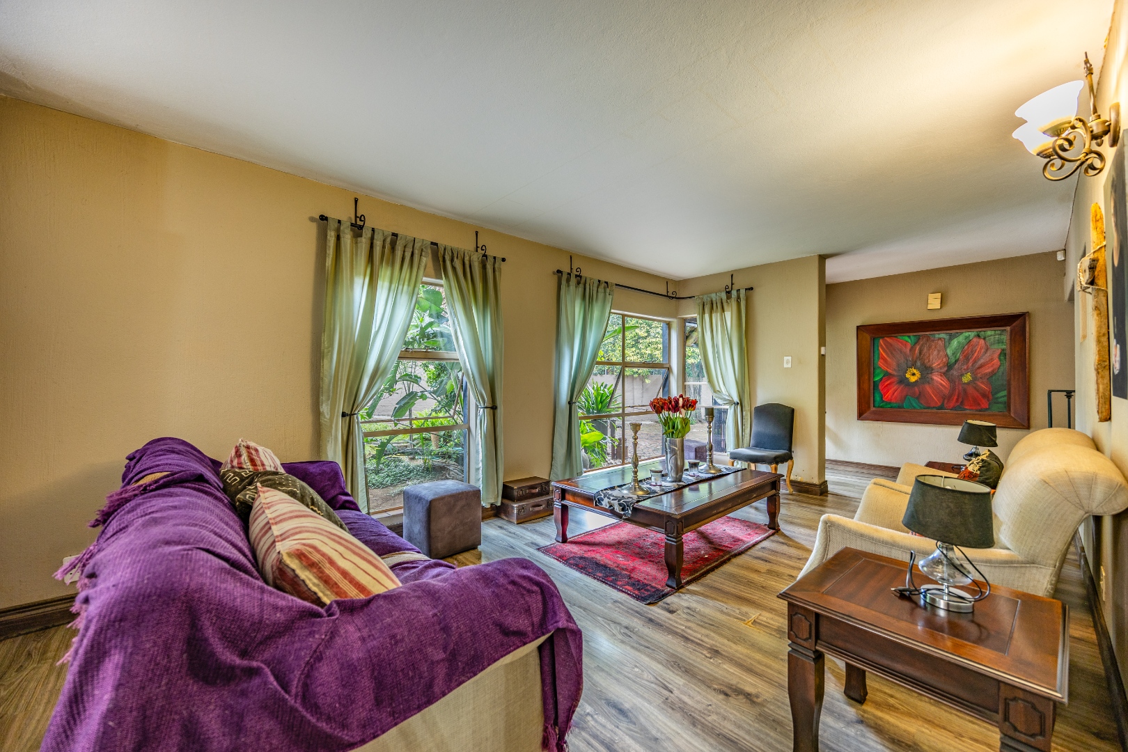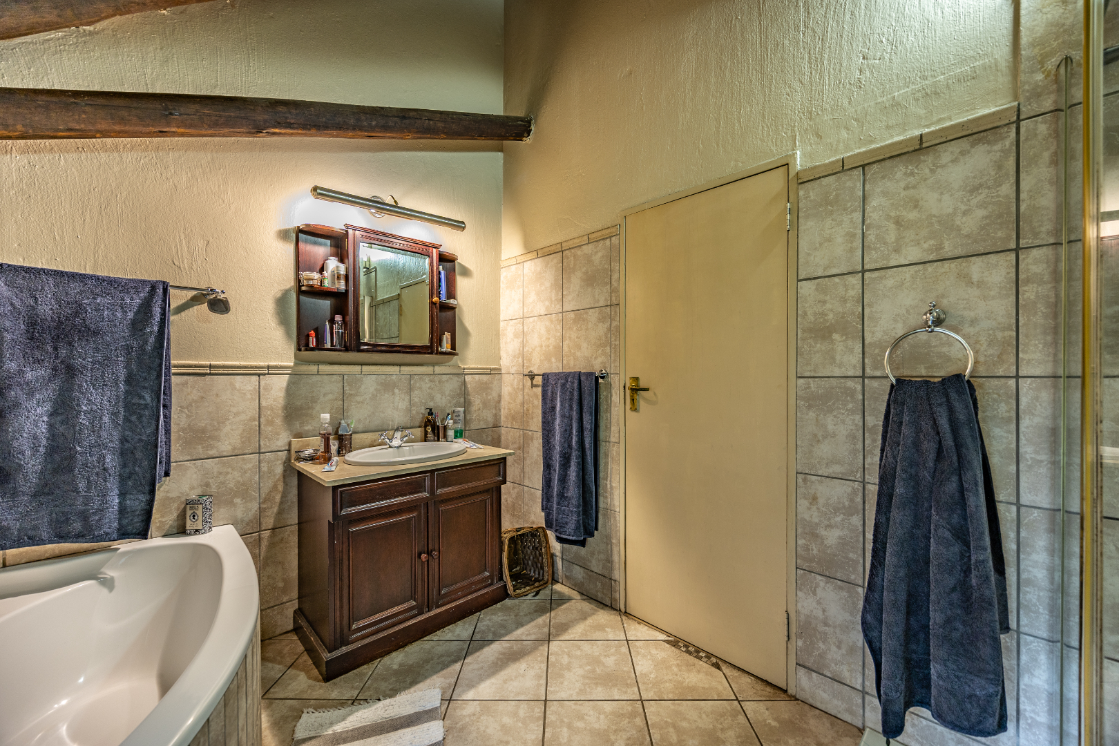 This well-designed home offers a welcoming entrance that opens to a formal lounge and dining area with laminated flooring, creating a warm and elegant first impression. On the ground floor you’ll find a guest bedroom with built-in cupboards and a full en-suite bathroom with bath and double basin, as well as a separate guest toilet. An extra-large room with doors leading outside provides versatile space, ideal for storage or conversion to suit your needs. The large living area flows effortlessly to the outdoors, perfect for relaxed family living.