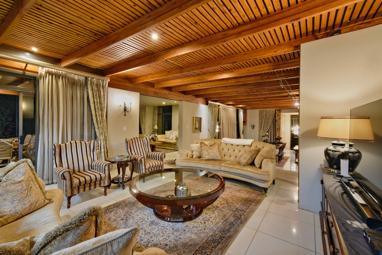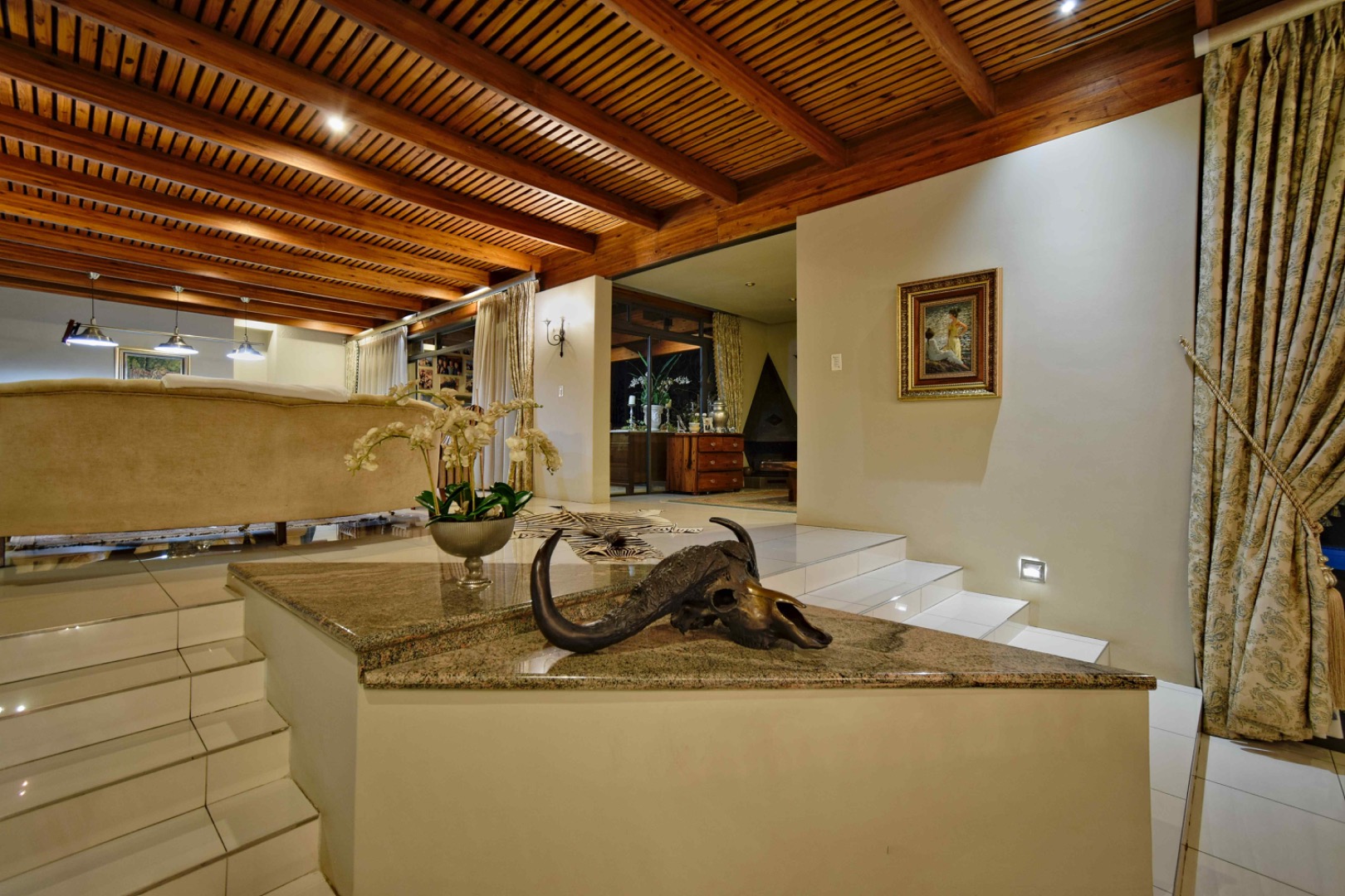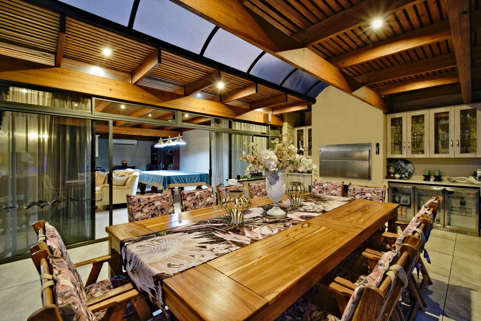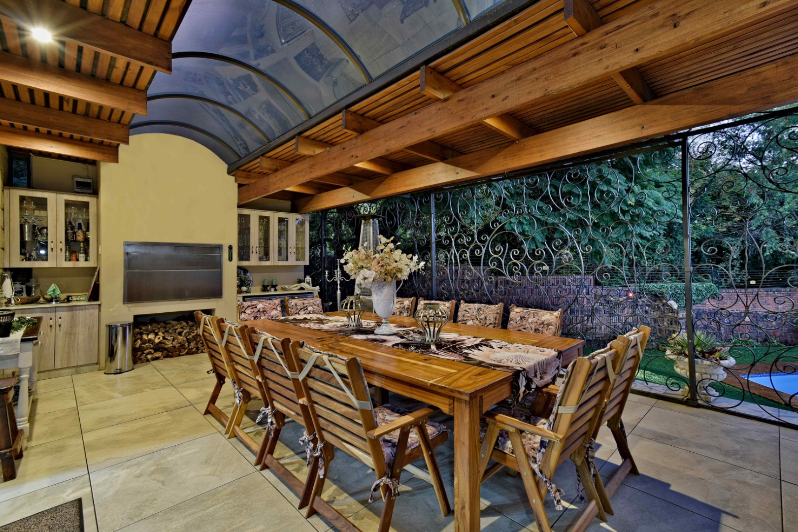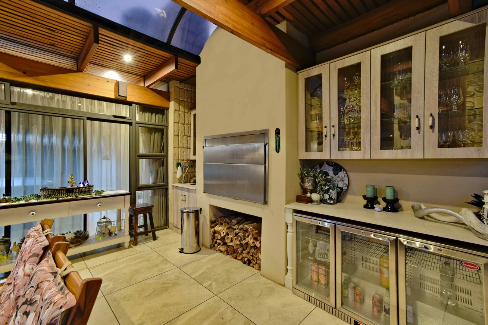 The home features spacious open-plan living areas including a dining room, a cozy lounge, and a separate TV room. The stunning kitchen boasts elegant cherry wood finishes, a large island, scullery, and a well-designed bar area—perfect for entertaining. The covered patio with a built-in braai overlooks a lovely view and a chlorine swimming pool, ideal for outdoor living.