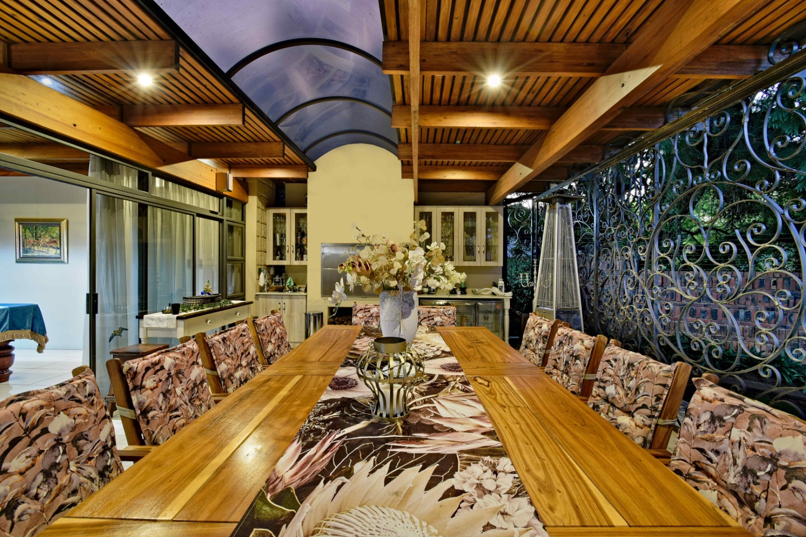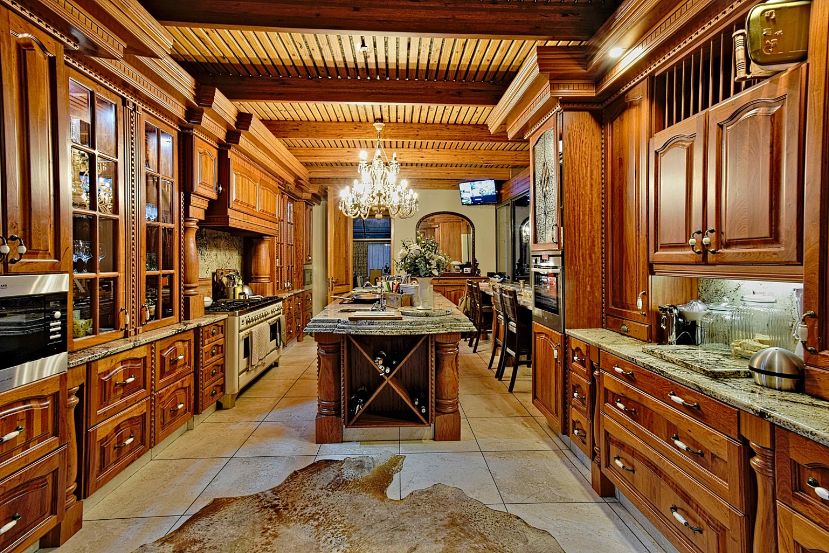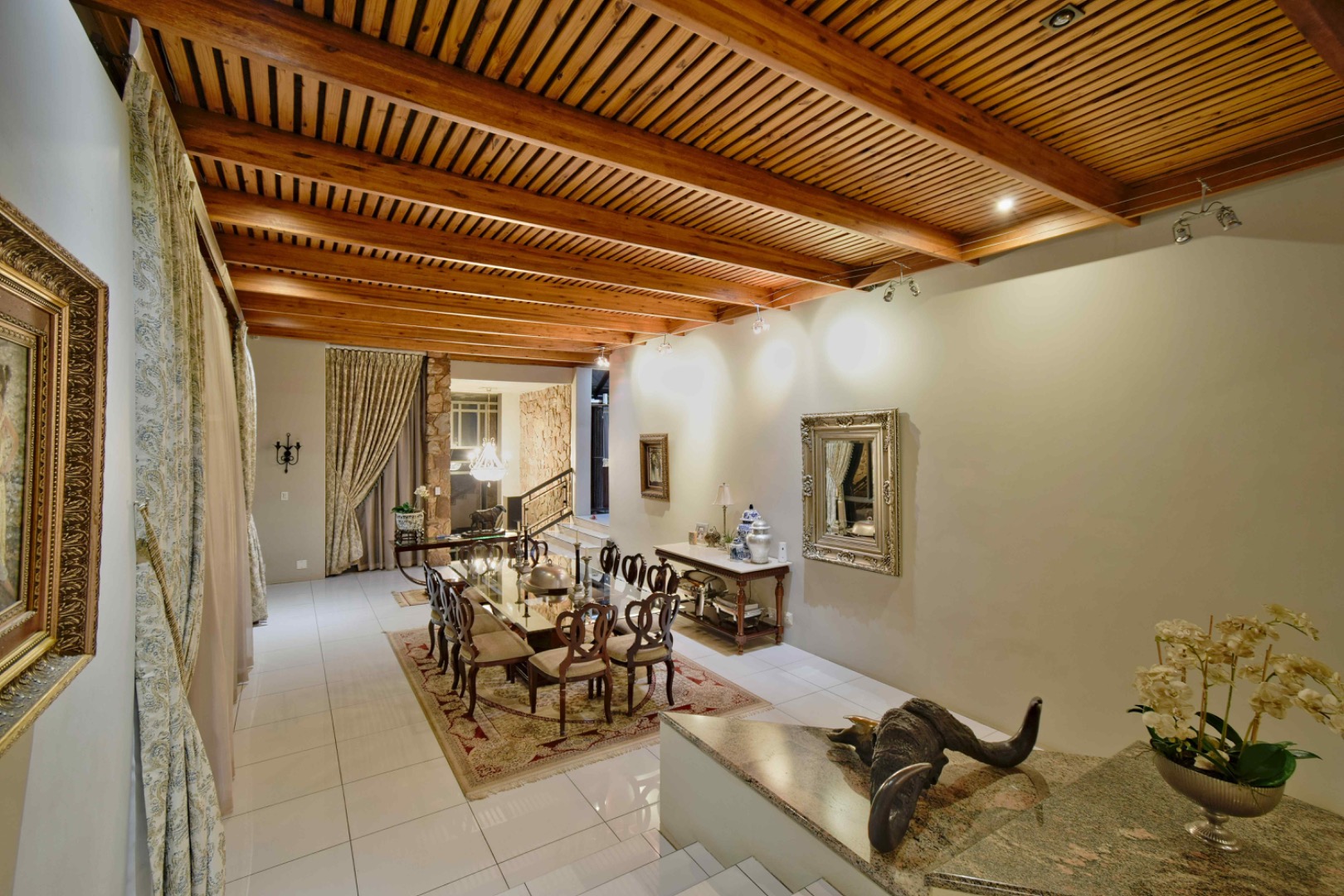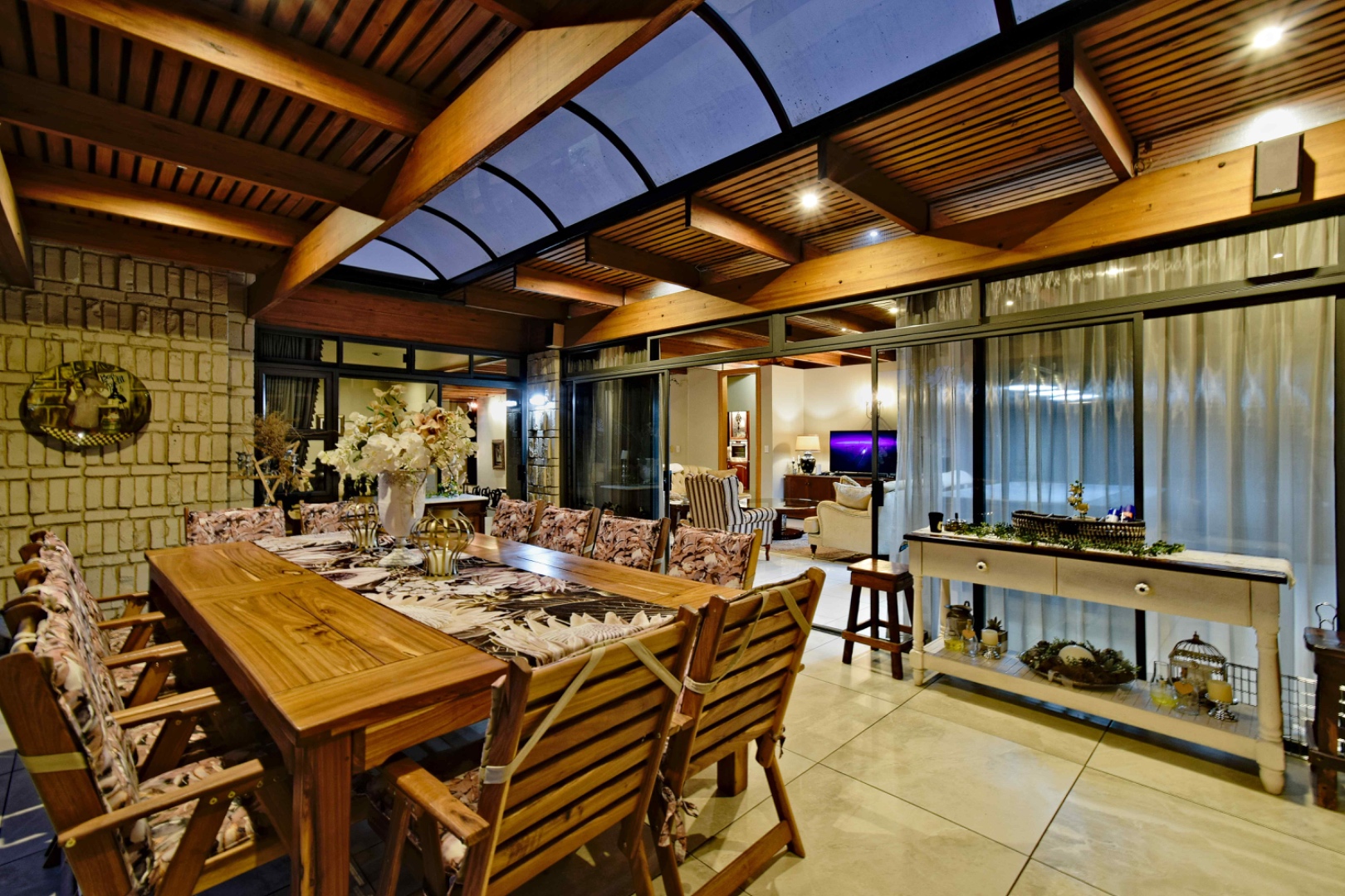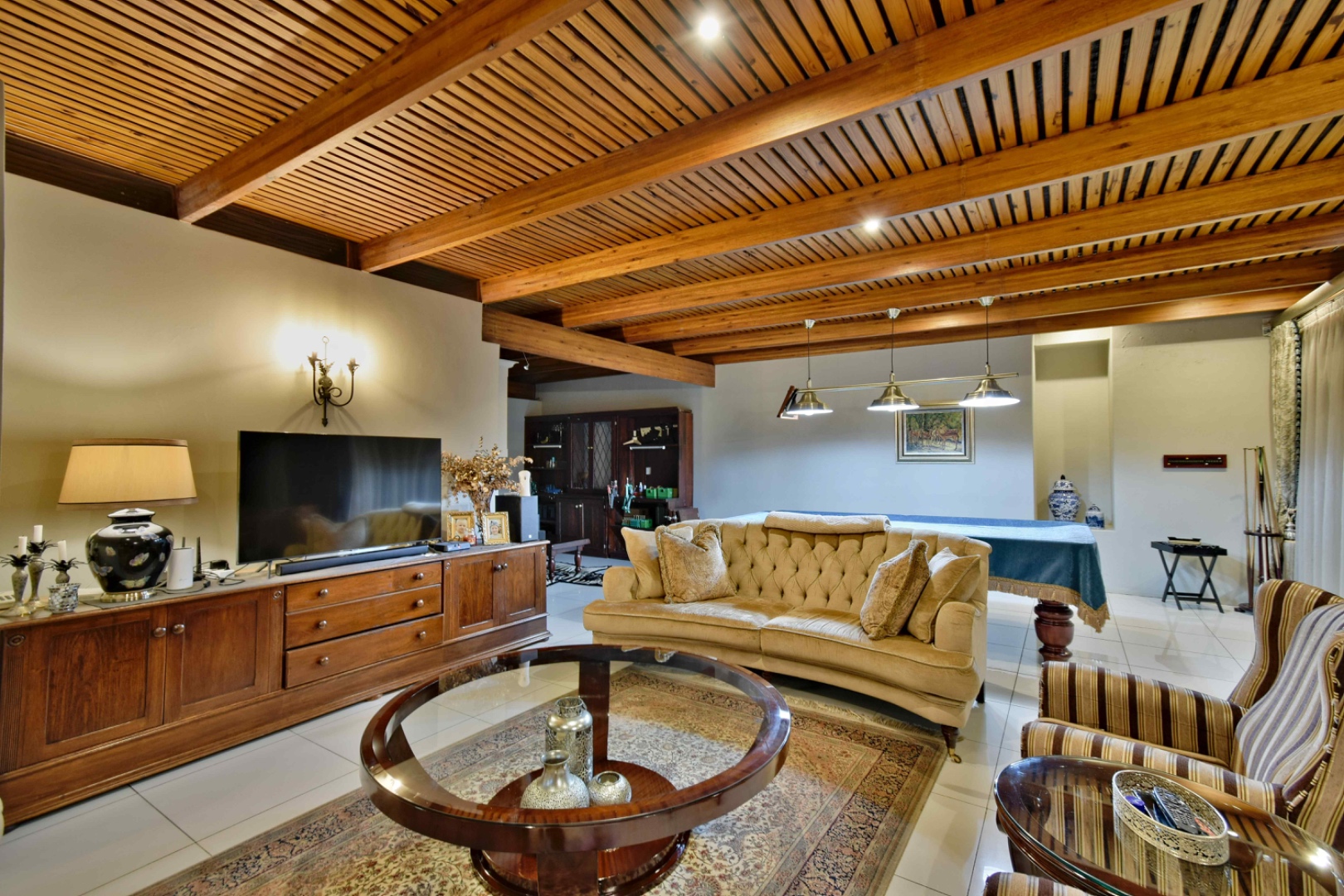 The home features spacious open-plan living areas including a dining room, a cozy lounge, and a separate TV room. The stunning kitchen boasts elegant cherry wood finishes, a large island, scullery, and a well-designed bar area—perfect for entertaining. The covered patio with a built-in braai overlooks a lovely view and a chlorine swimming pool, ideal for outdoor living.