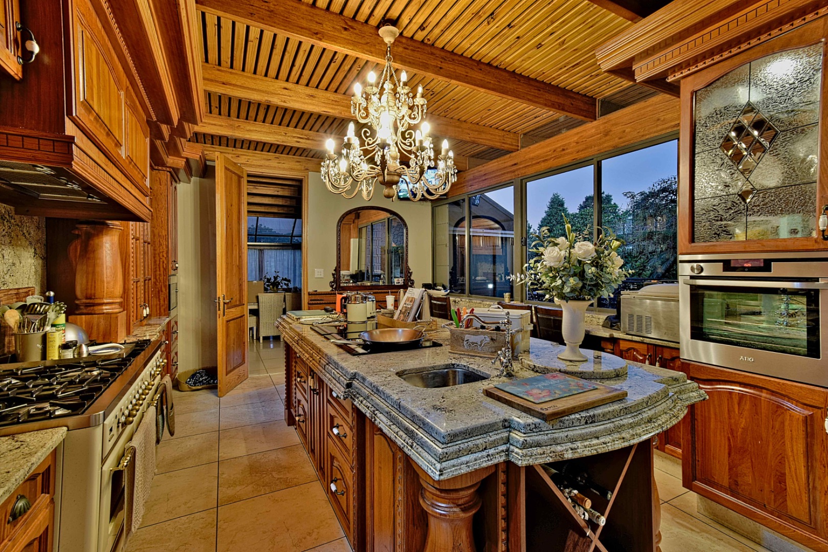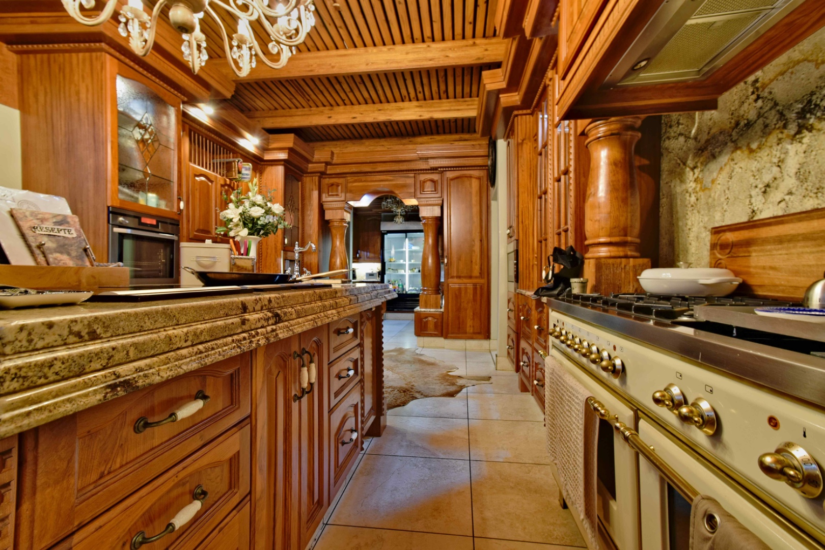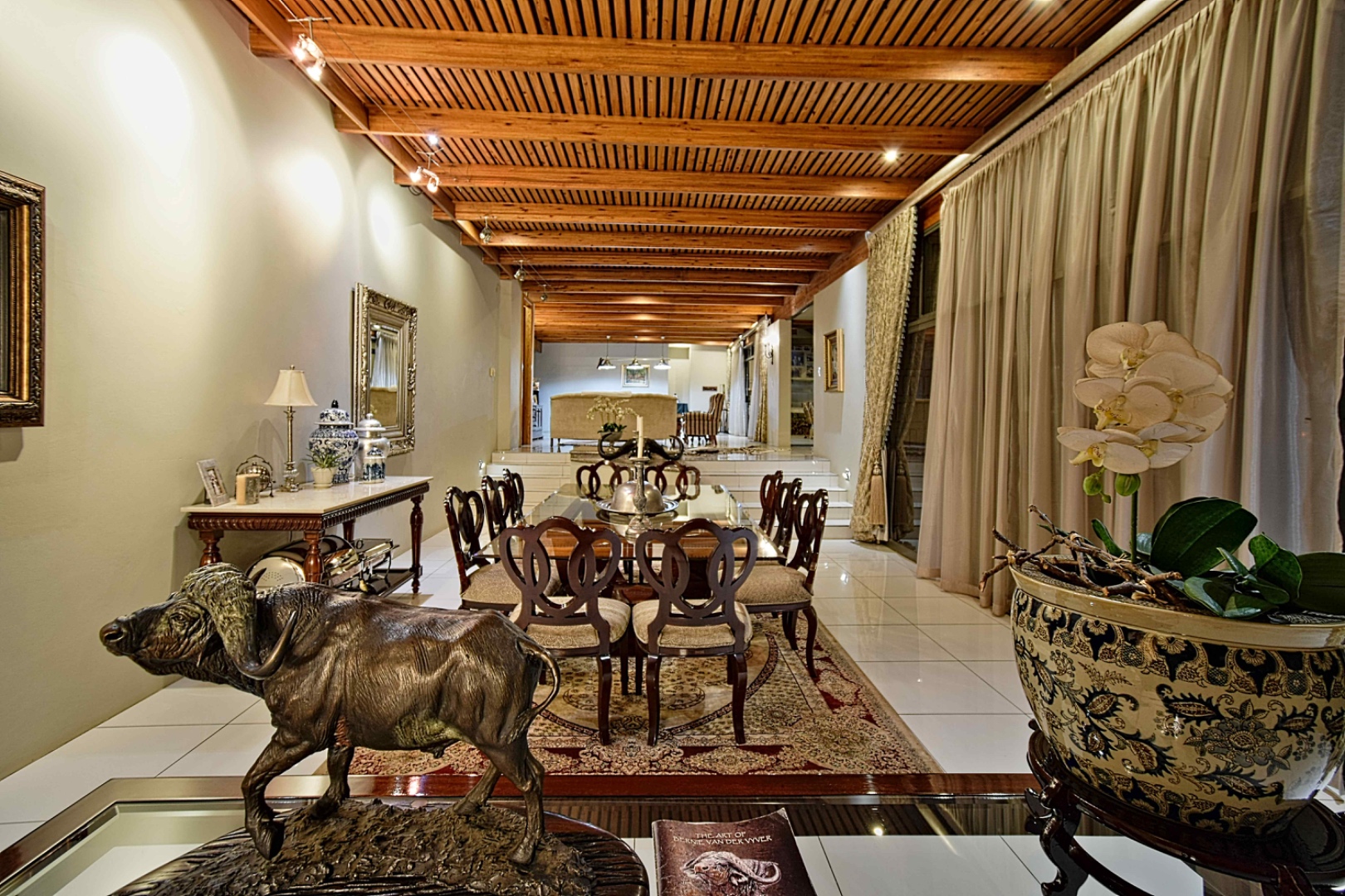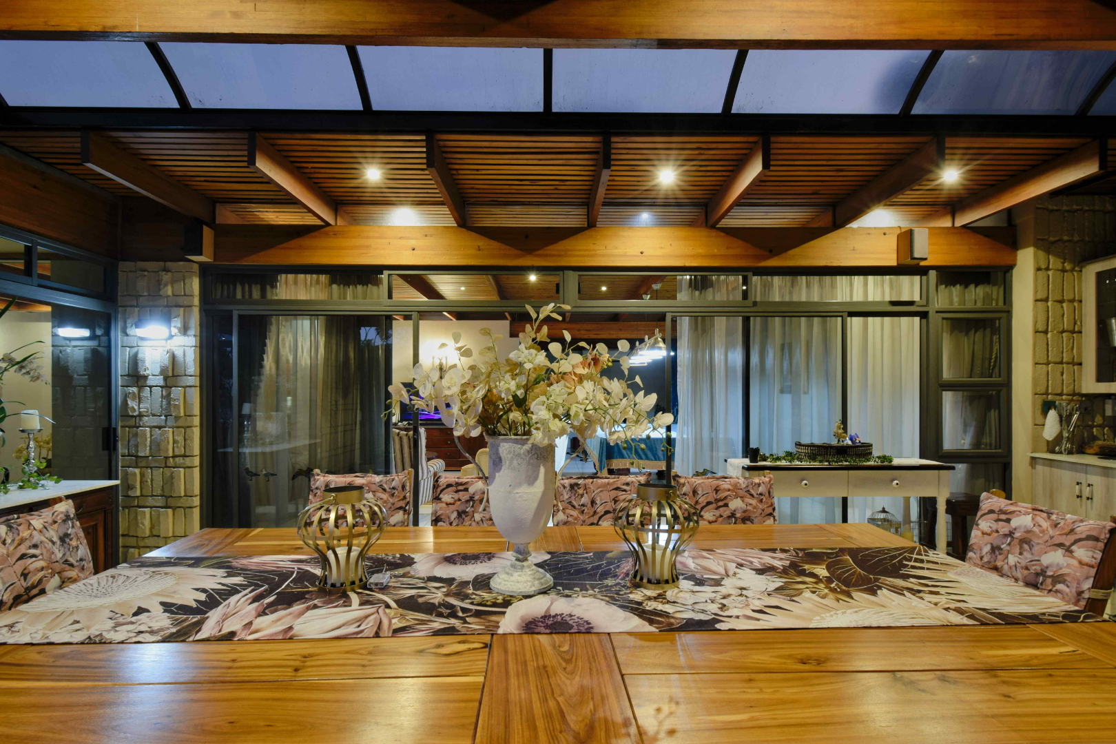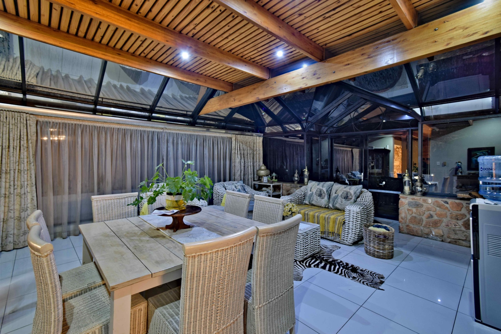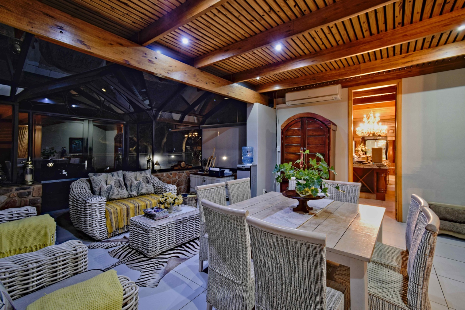 The home features spacious open-plan living areas including a dining room, a cozy lounge, and a separate TV room. The stunning kitchen boasts elegant cherry wood finishes, a large island, scullery, and a well-designed bar area—perfect for entertaining. The covered patio with a built-in braai overlooks a lovely view and a chlorine swimming pool, ideal for outdoor living.