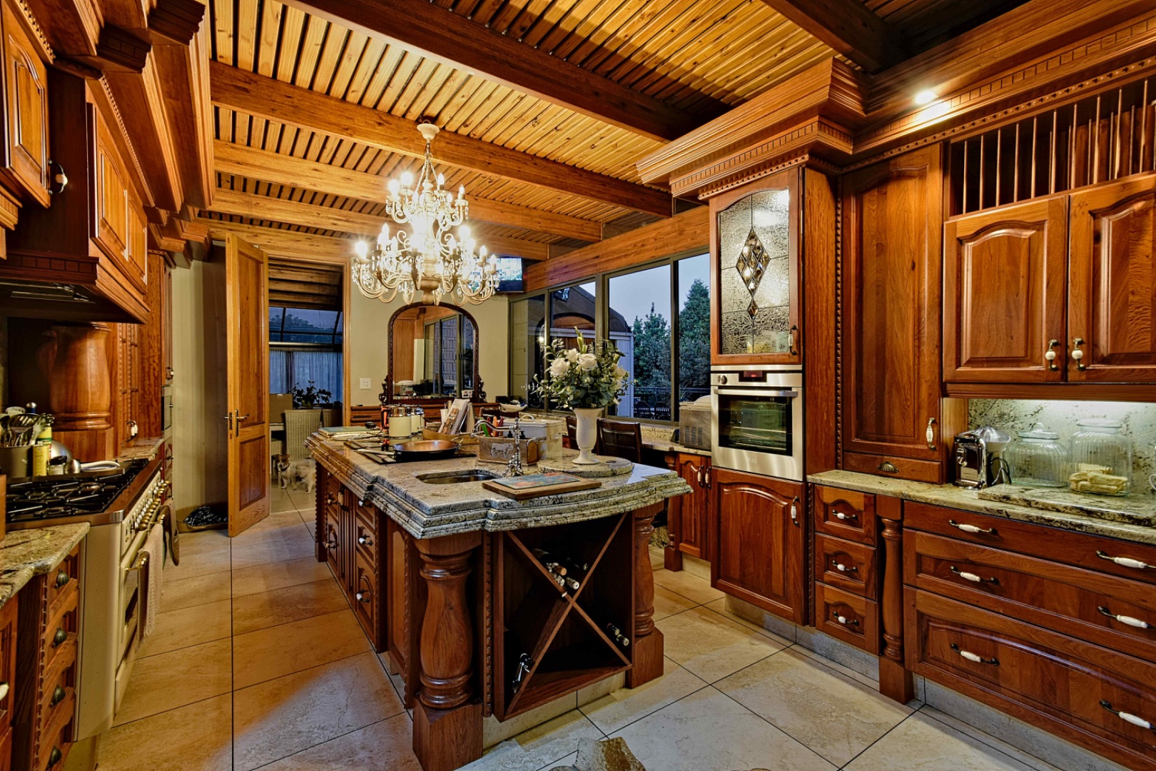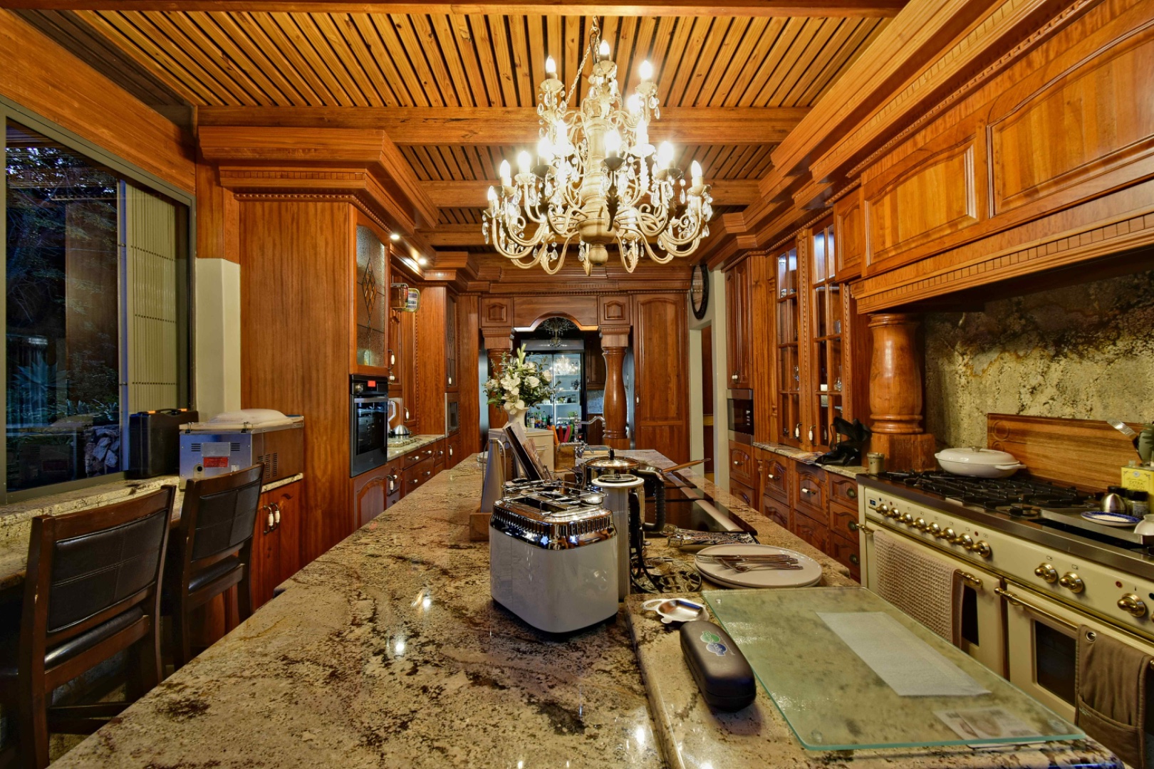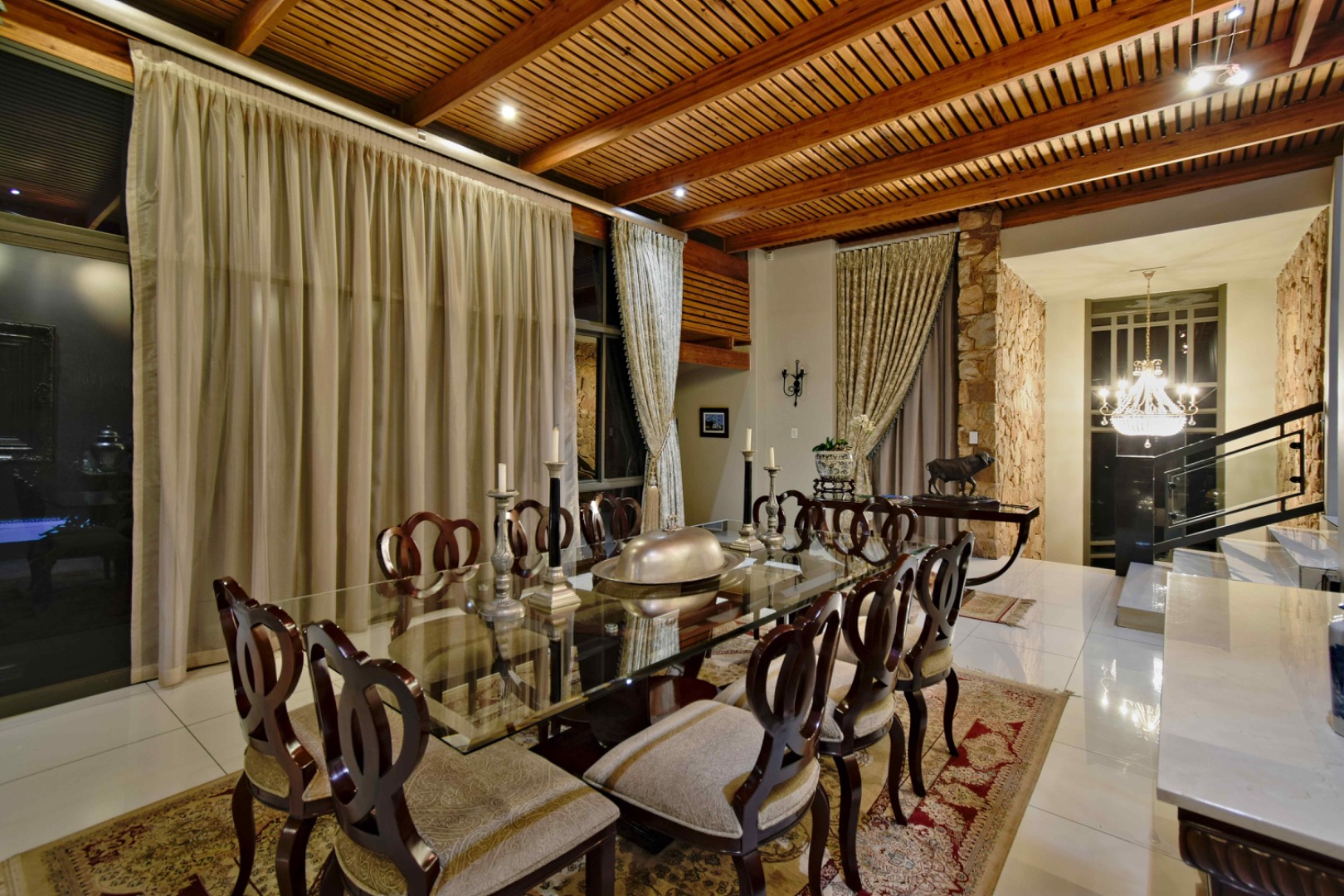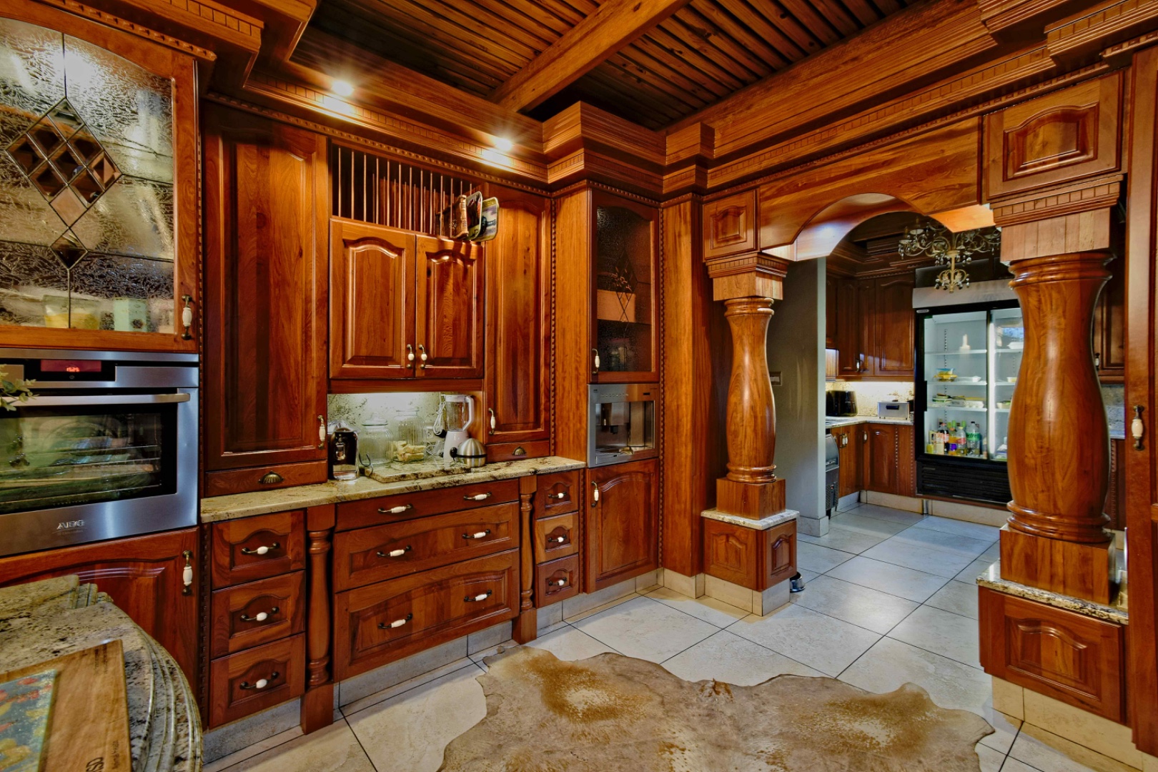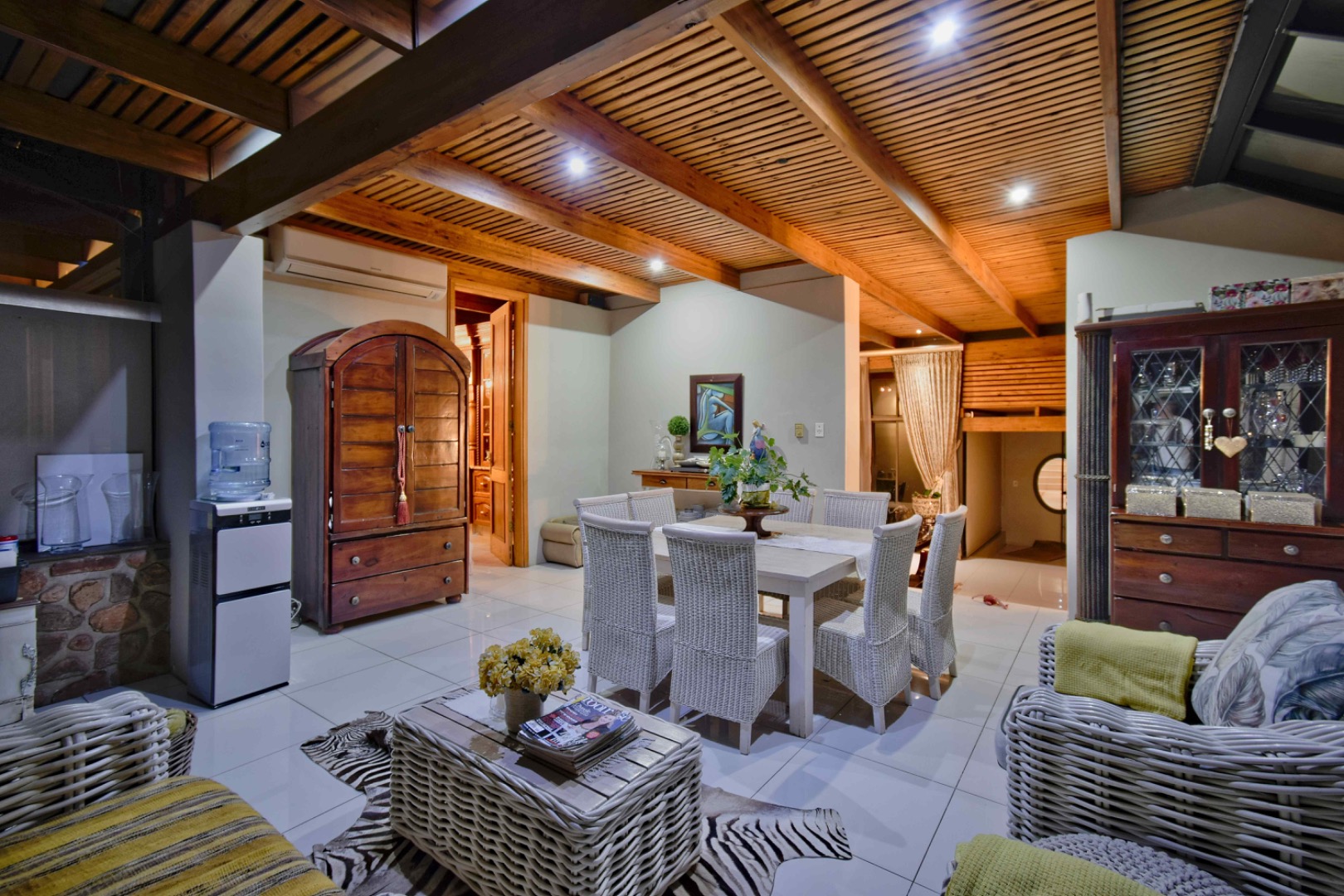 The home features spacious open-plan living areas including a dining room, a cozy lounge, and a separate TV room. The stunning kitchen boasts elegant cherry wood finishes, a large island, scullery, and a well-designed bar area—perfect for entertaining. The covered patio with a built-in braai overlooks a lovely view and a chlorine swimming pool, ideal for outdoor living.