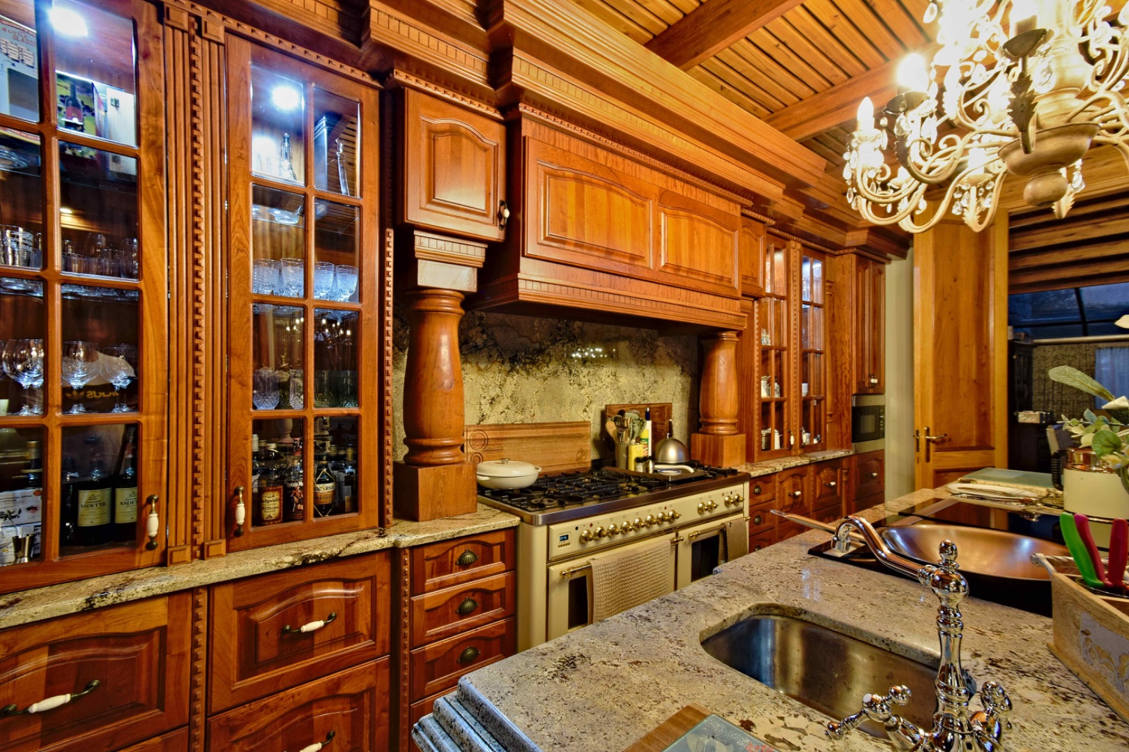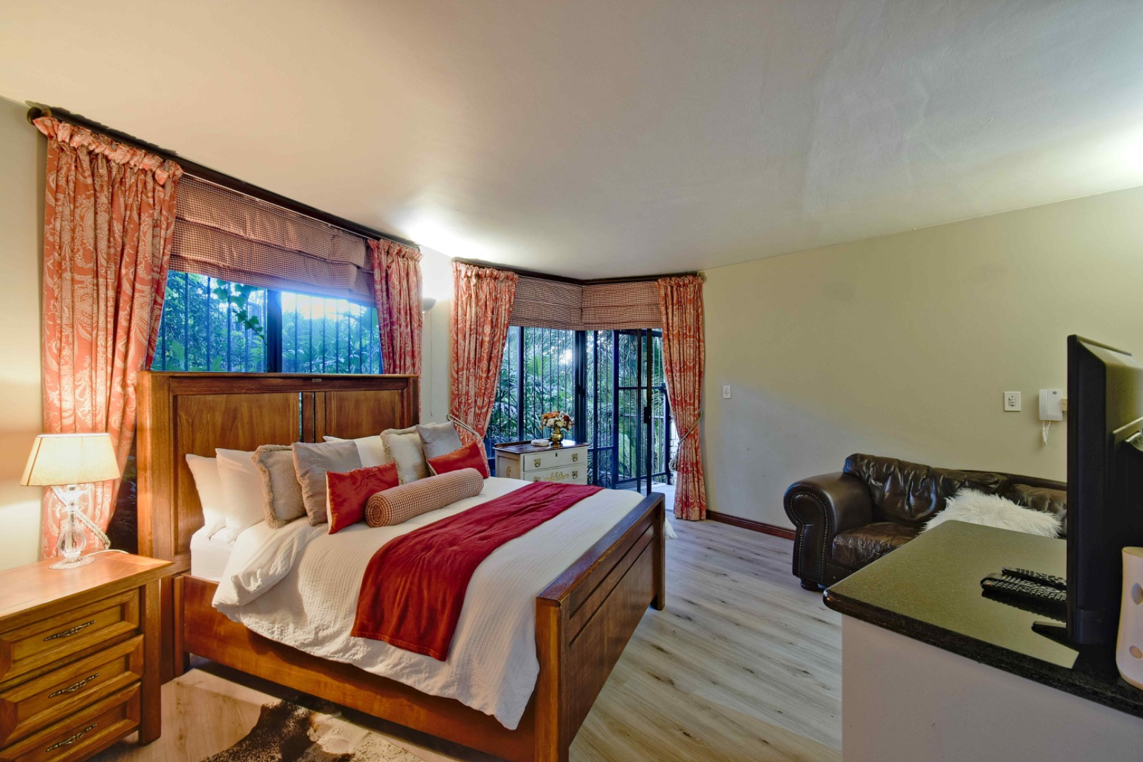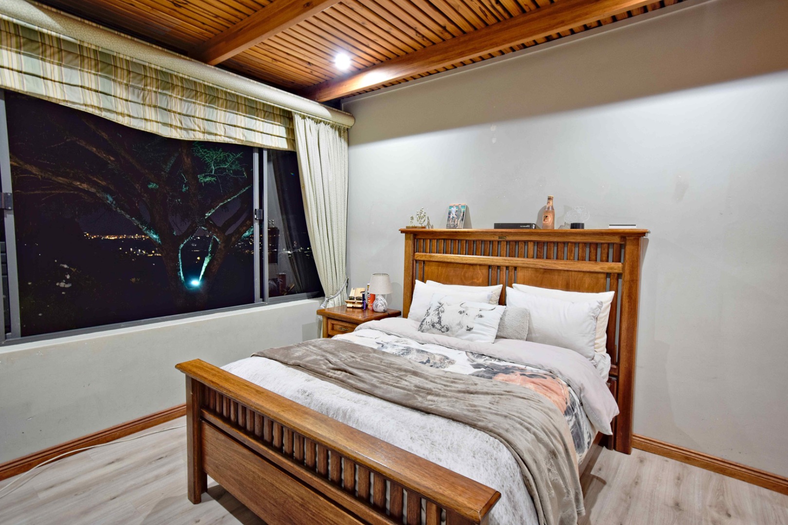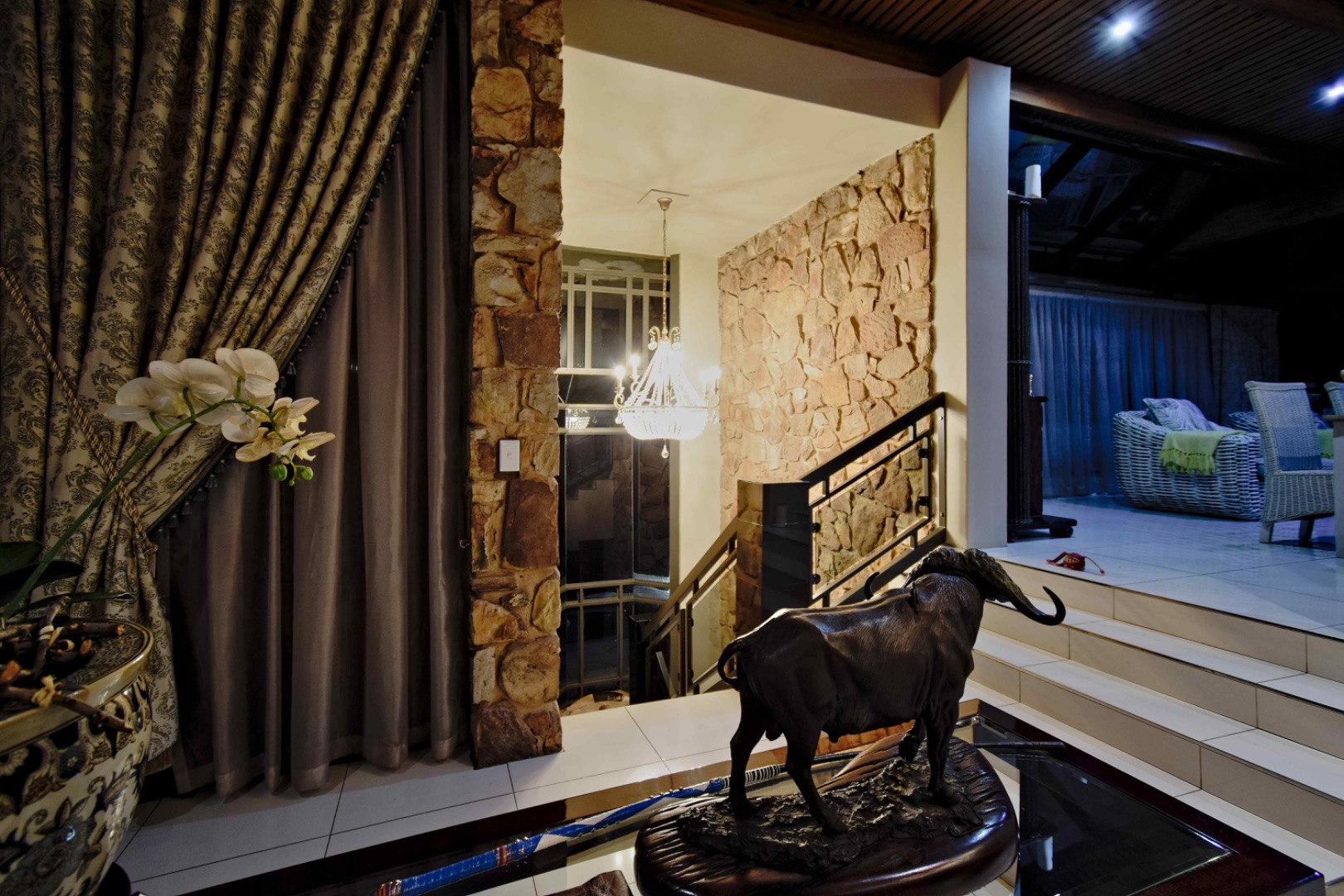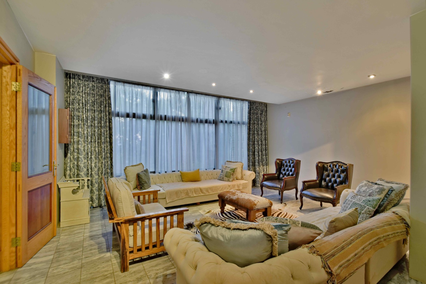 The home features spacious open-plan living areas including a dining room, a cozy lounge, and a separate TV room. The stunning kitchen boasts elegant cherry wood finishes, a large island, scullery, and a well-designed bar area—perfect for entertaining. The covered patio with a built-in braai overlooks a lovely view and a chlorine swimming pool, ideal for outdoor living.