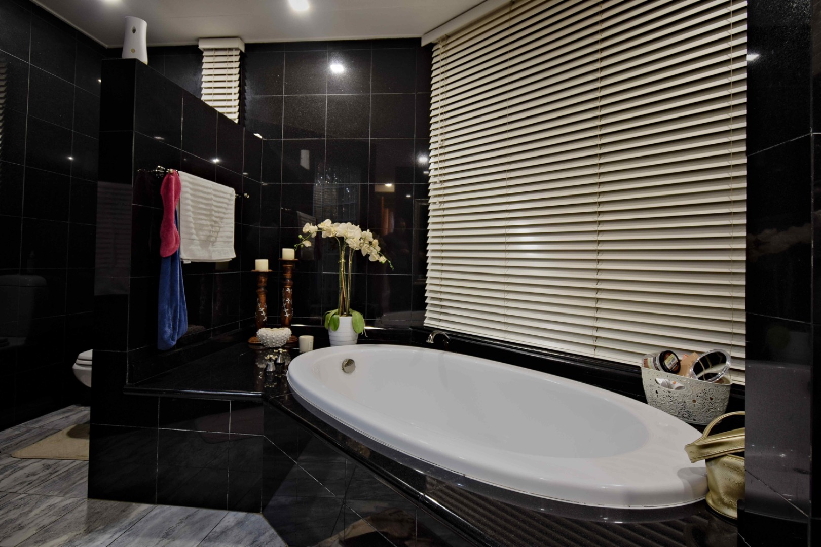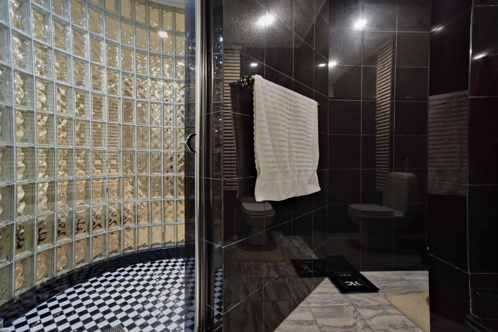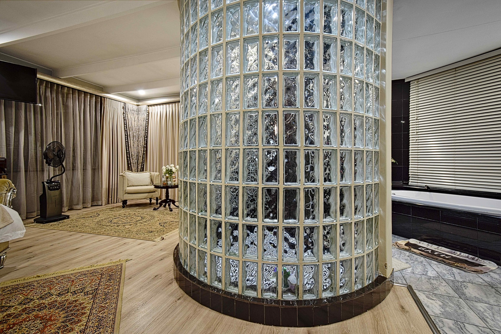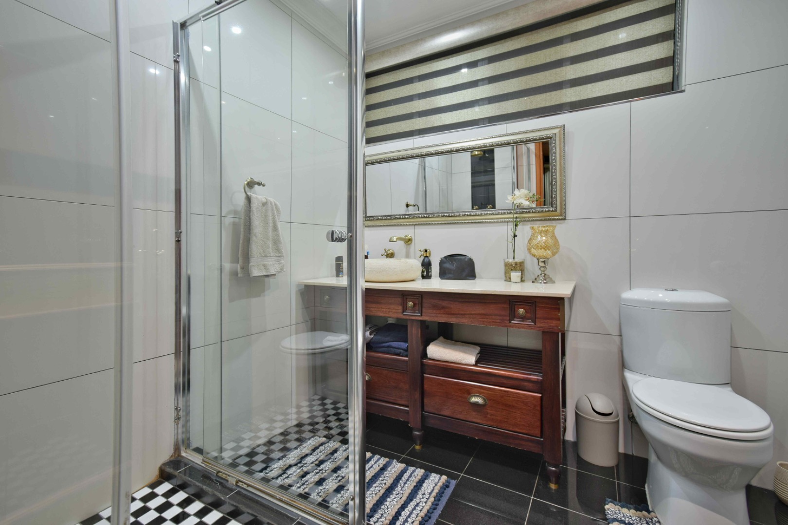 The bedroom wing includes two additional bedrooms and a full shared bathroom, while the main bedroom is ensuite with a full bathroom and walk-in closet. An additional bathroom with a toilet, shower, and basin serves guests or residents conveniently.
