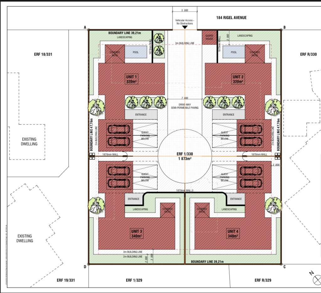 For sale in the prestigious suburb of Waterkloof Ridge, this expansive 4-bedroom property presents a unique opportunity for both residential developers and entrepreneurs. Set on a ±1,280m² stand, the property comes with approved rezoning for four individual units of 320m² each, making it ideal for an upmarket townhouse development, a business premises, or luxury rental apartments.