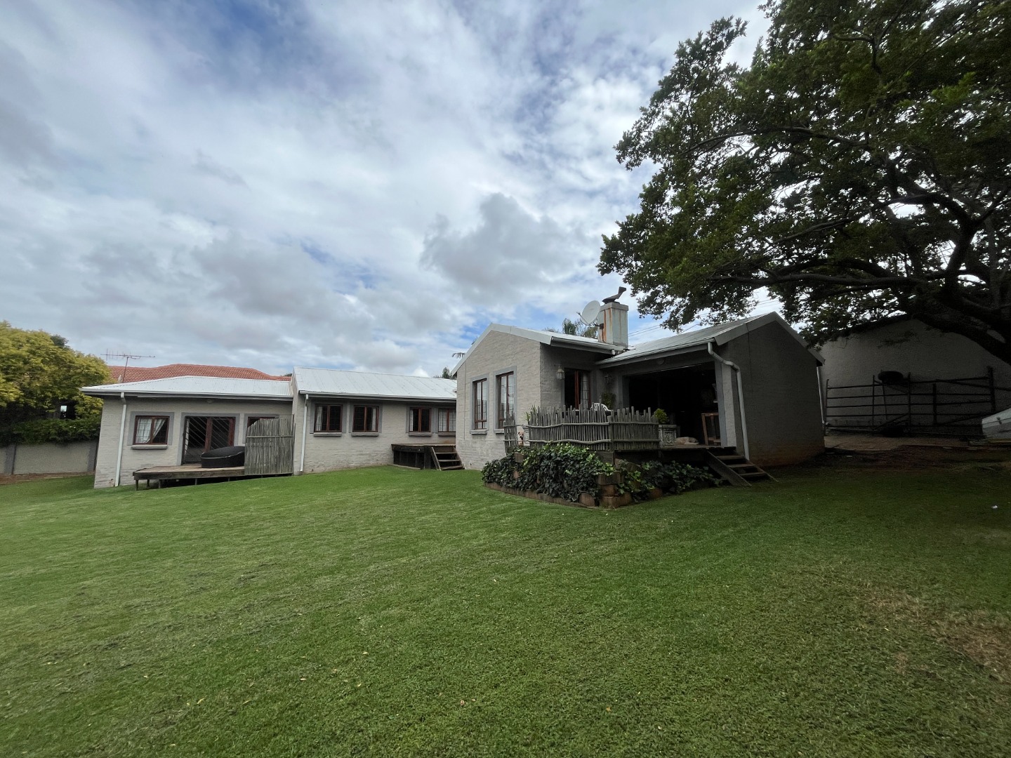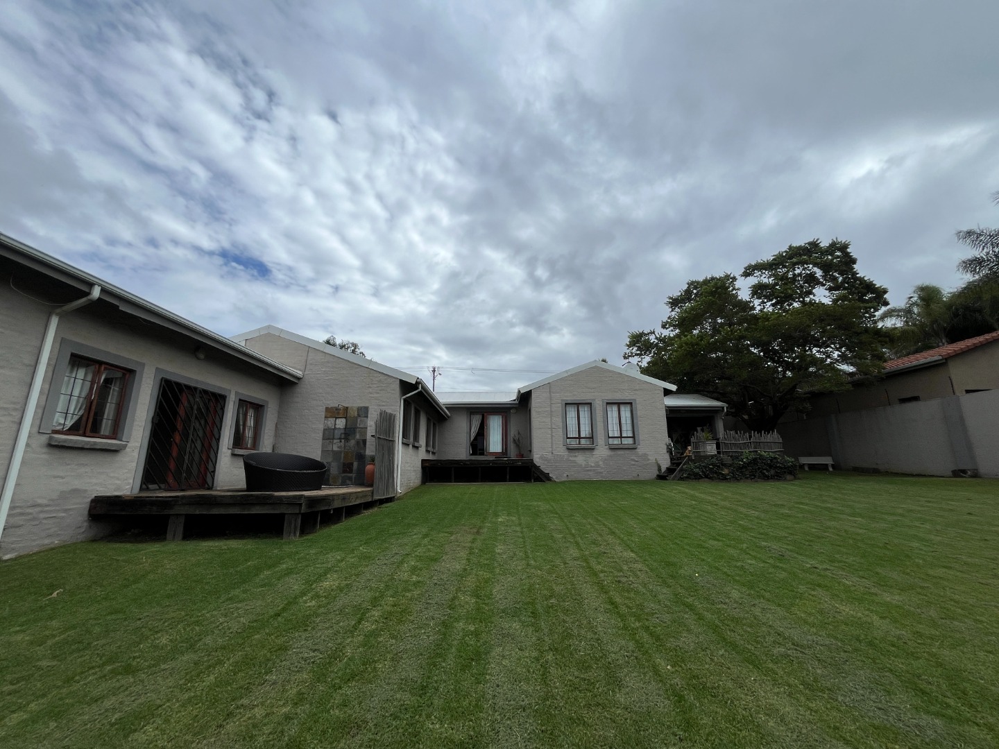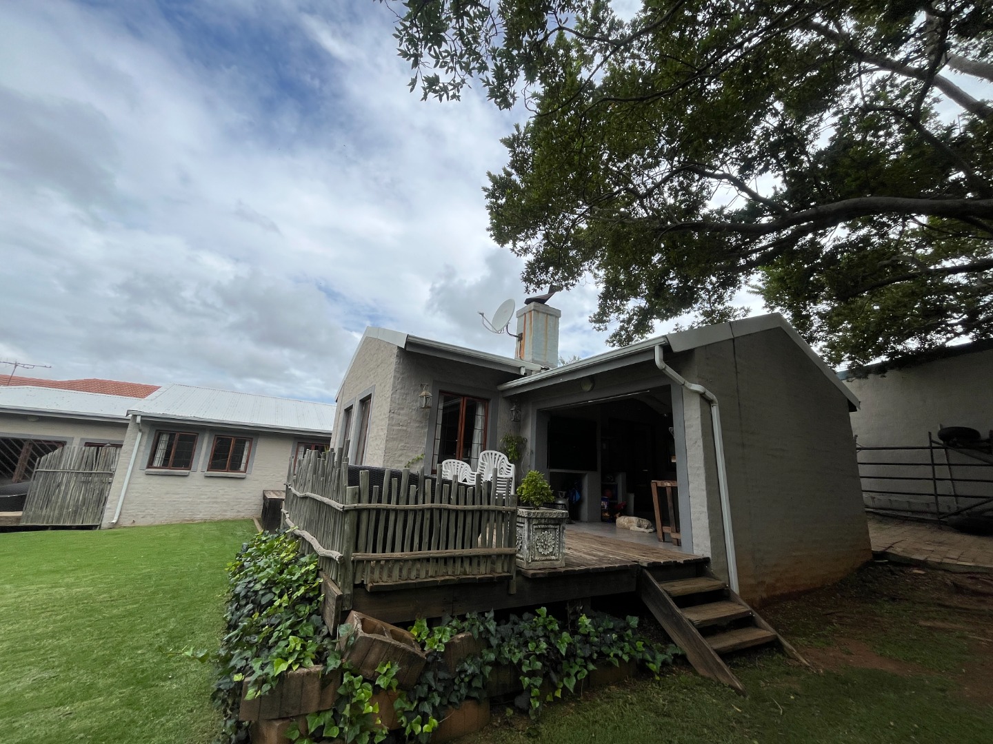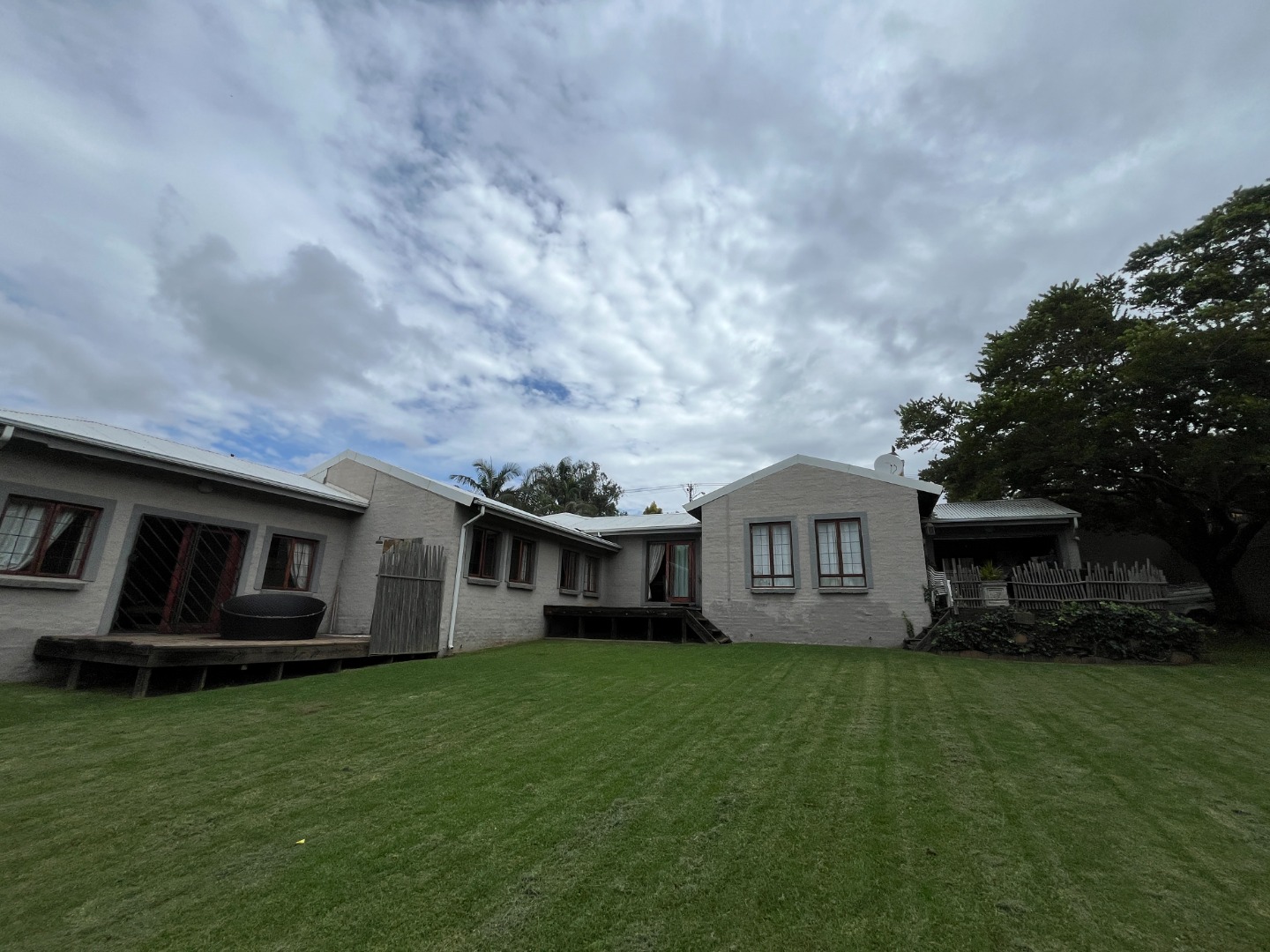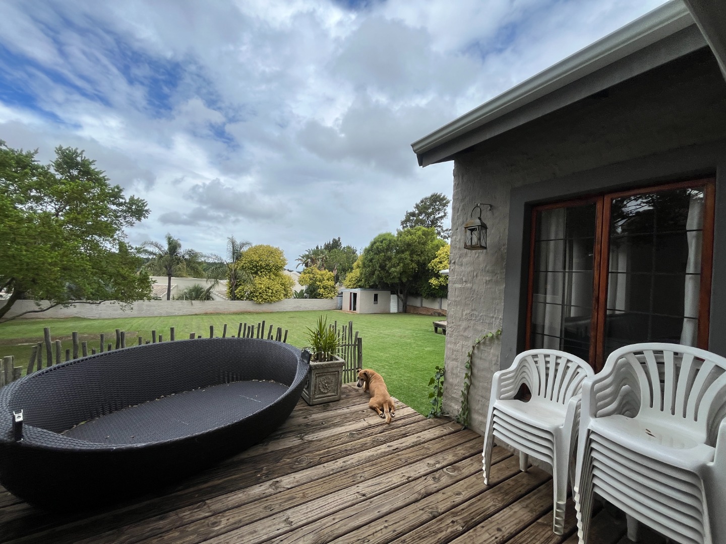 Upon entering the home, you are welcomed by an entrance hall leading to a cozy entertainment area with sliding doors that open onto a wooden deck overlooking the large garden. The home features an open-plan layout connecting the living room, dining room and kitchen, creating a comfortable flow for everyday living. The living room includes a gas fireplace for colder evenings, while the kitchen offers melamine cupboards, granite countertops, a Whirlpool electric hob and oven, as well as a separate laundry and scullery. The bedroom wing includes two bedrooms with a full bathroom, while the air-conditioned main bedroom offers a full en-suite bathroom, generous closet space, and sliding doors leading to a wooden deck with an outdoor shower.
