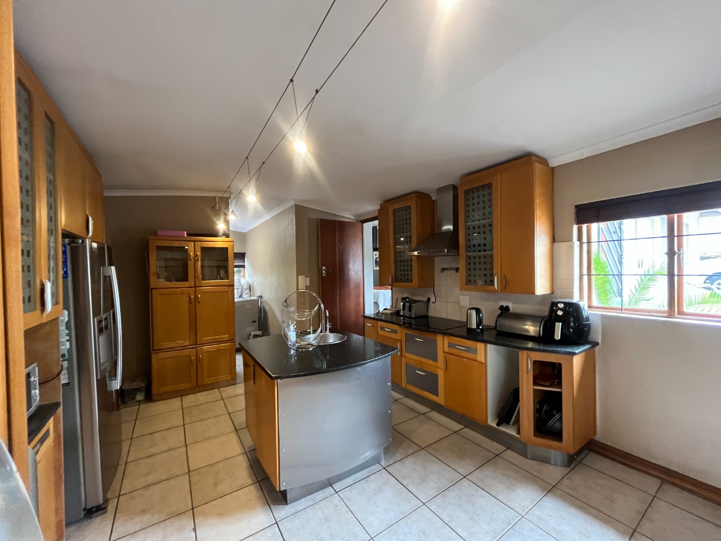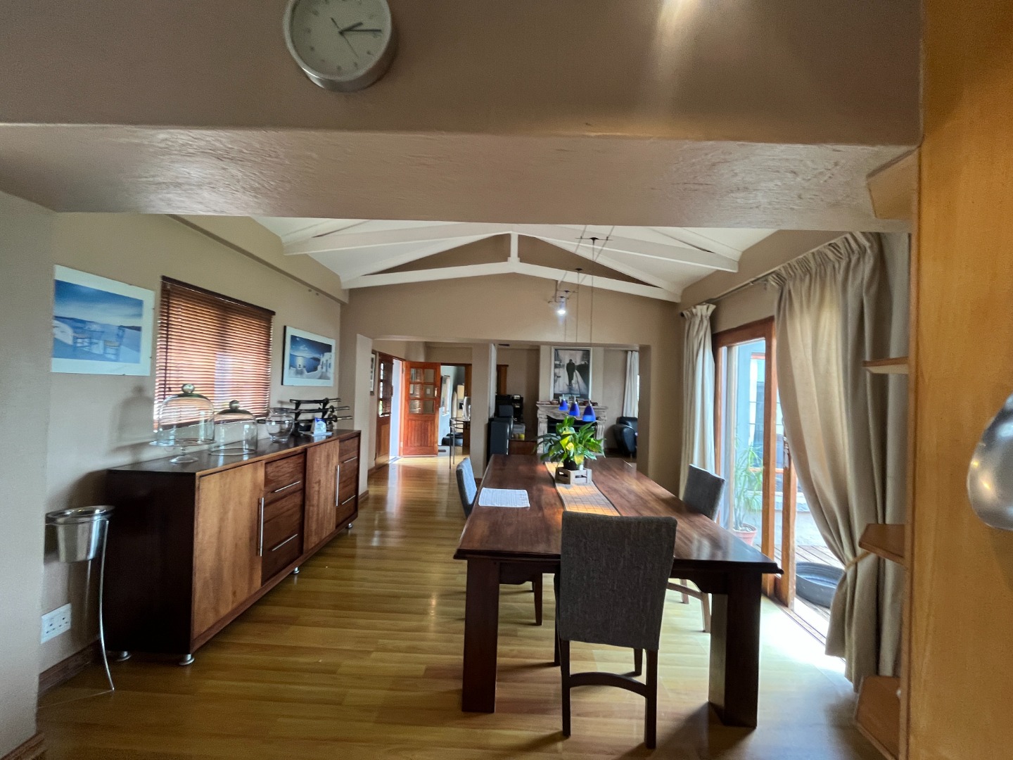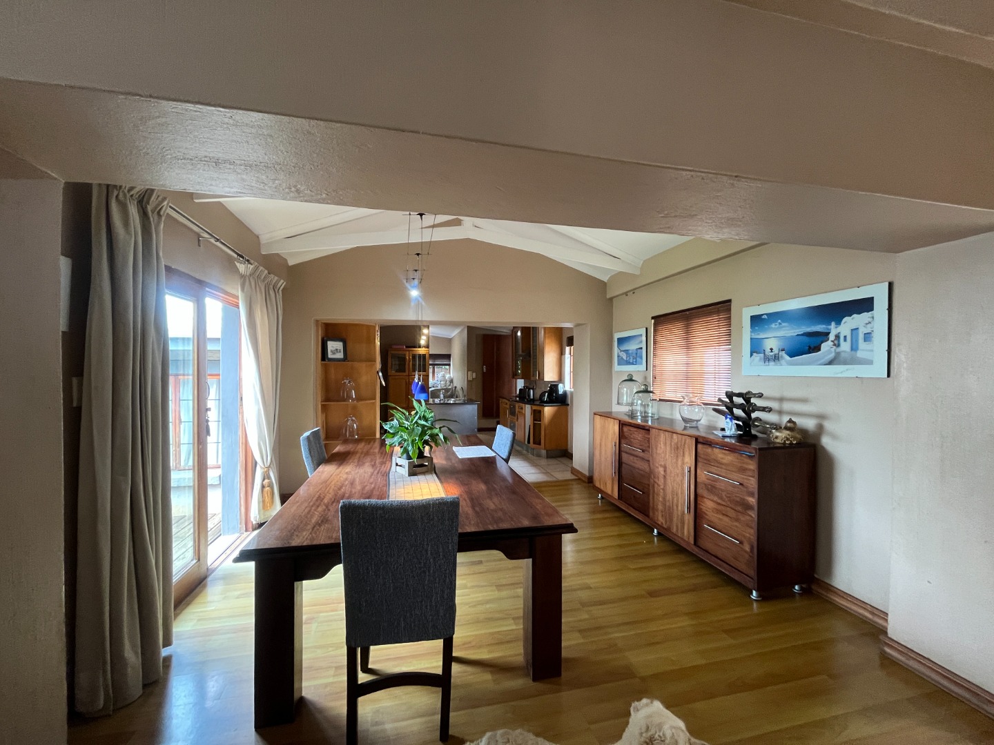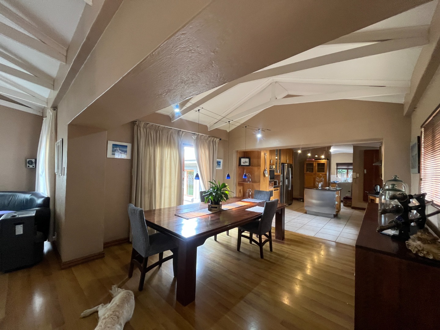Upon entering the home, you are welcomed by an entrance hall leading to a cozy entertainment area with sliding doors that open onto a wooden deck overlooking the large garden. The home features an open-plan layout connecting the living room, dining room and kitchen, creating a comfortable flow for everyday living. The living room includes a gas fireplace for colder evenings, while the kitchen offers melamine cupboards, granite countertops, a Whirlpool electric hob and oven, as well as a separate laundry and scullery. The bedroom wing includes two bedrooms with a full bathroom, while the air-conditioned main bedroom offers a full en-suite bathroom, generous closet space, and sliding doors leading to a wooden deck with an outdoor shower.
