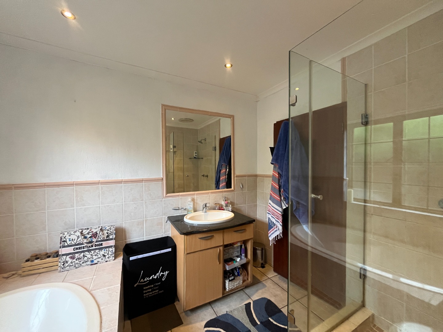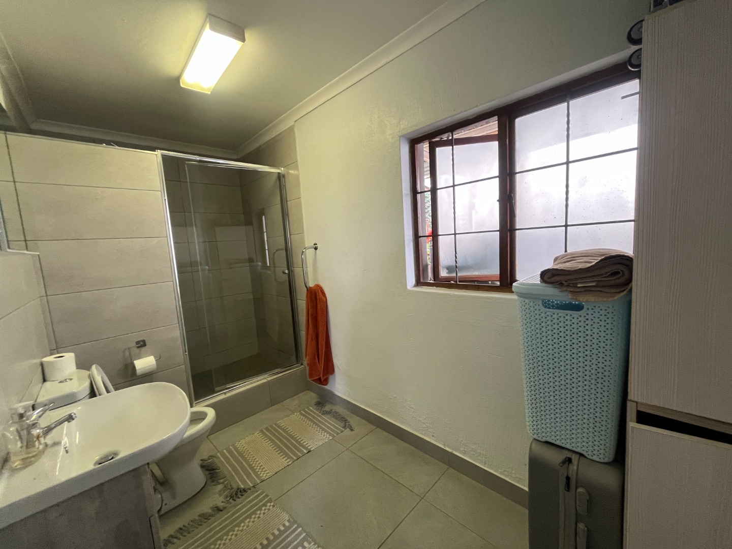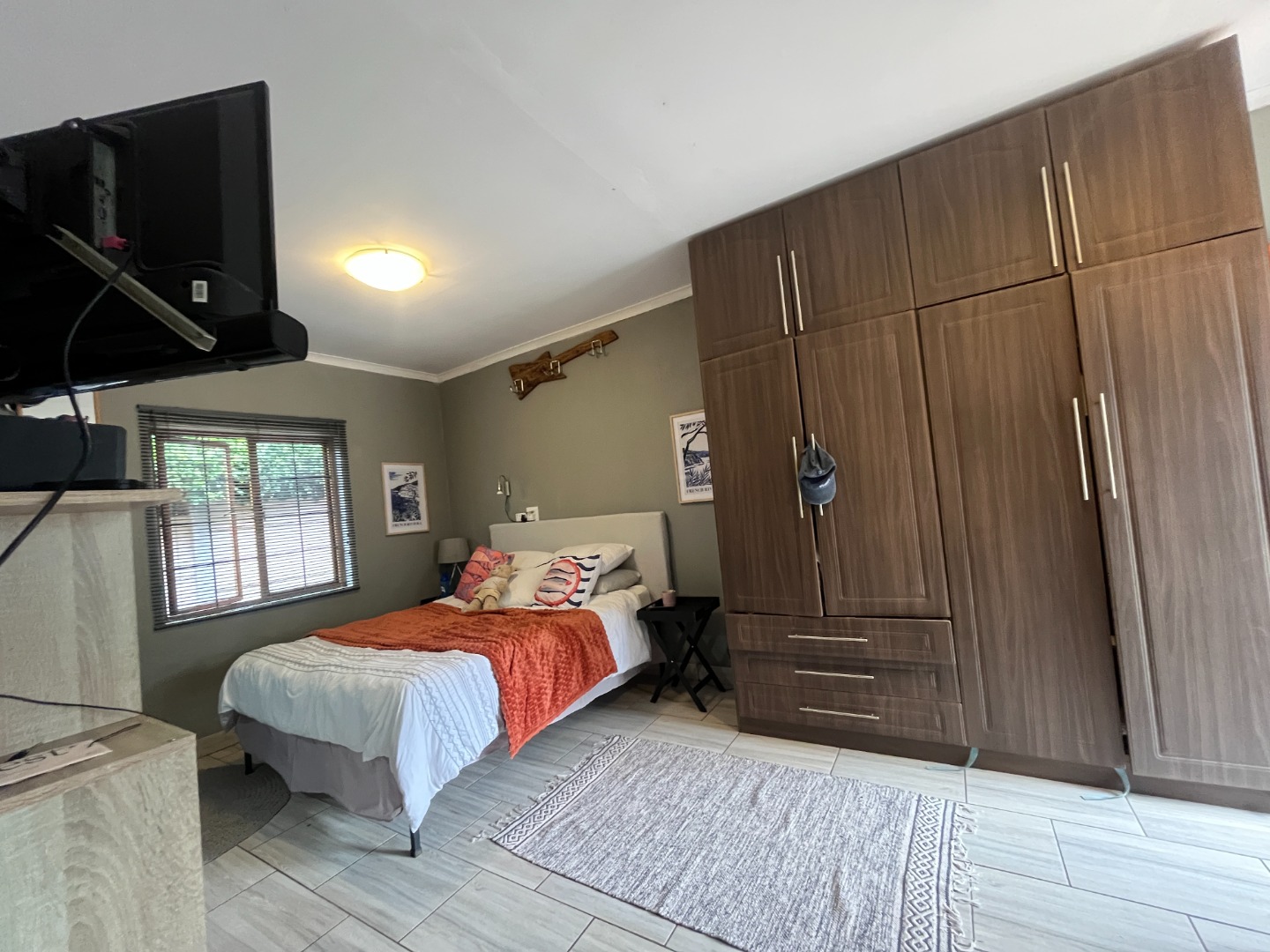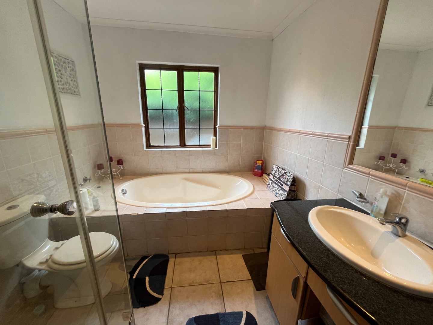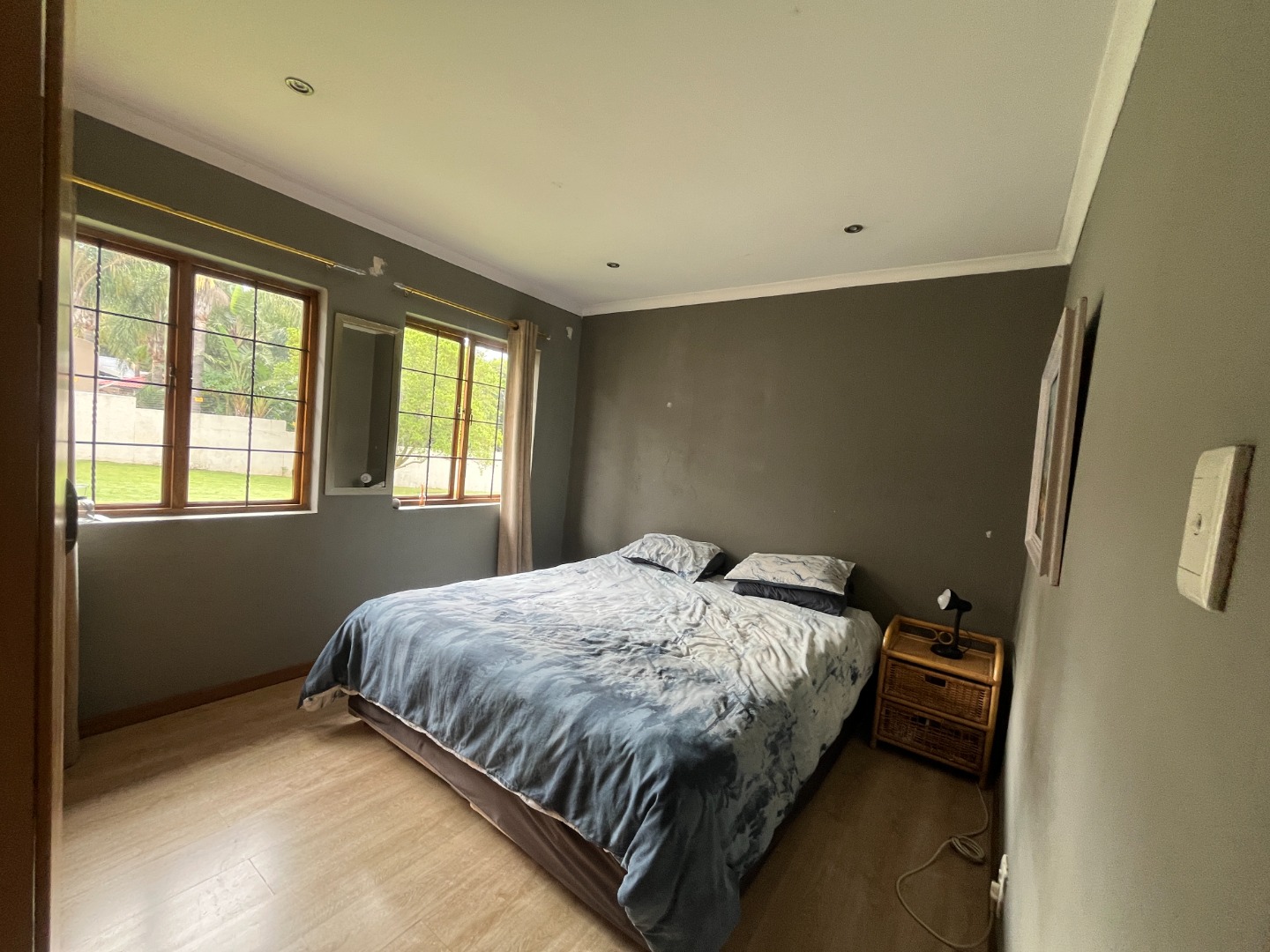 Upon entering the home, you are welcomed by an entrance hall leading to a cozy entertainment area with sliding doors that open onto a wooden deck overlooking the large garden. The home features an open-plan layout connecting the living room, dining room and kitchen, creating a comfortable flow for everyday living. The living room includes a gas fireplace for colder evenings, while the kitchen offers melamine cupboards, granite countertops, a Whirlpool electric hob and oven, as well as a separate laundry and scullery. The bedroom wing includes two bedrooms with a full bathroom, while the air-conditioned main bedroom offers a full en-suite bathroom, generous closet space, and sliding doors leading to a wooden deck with an outdoor shower.