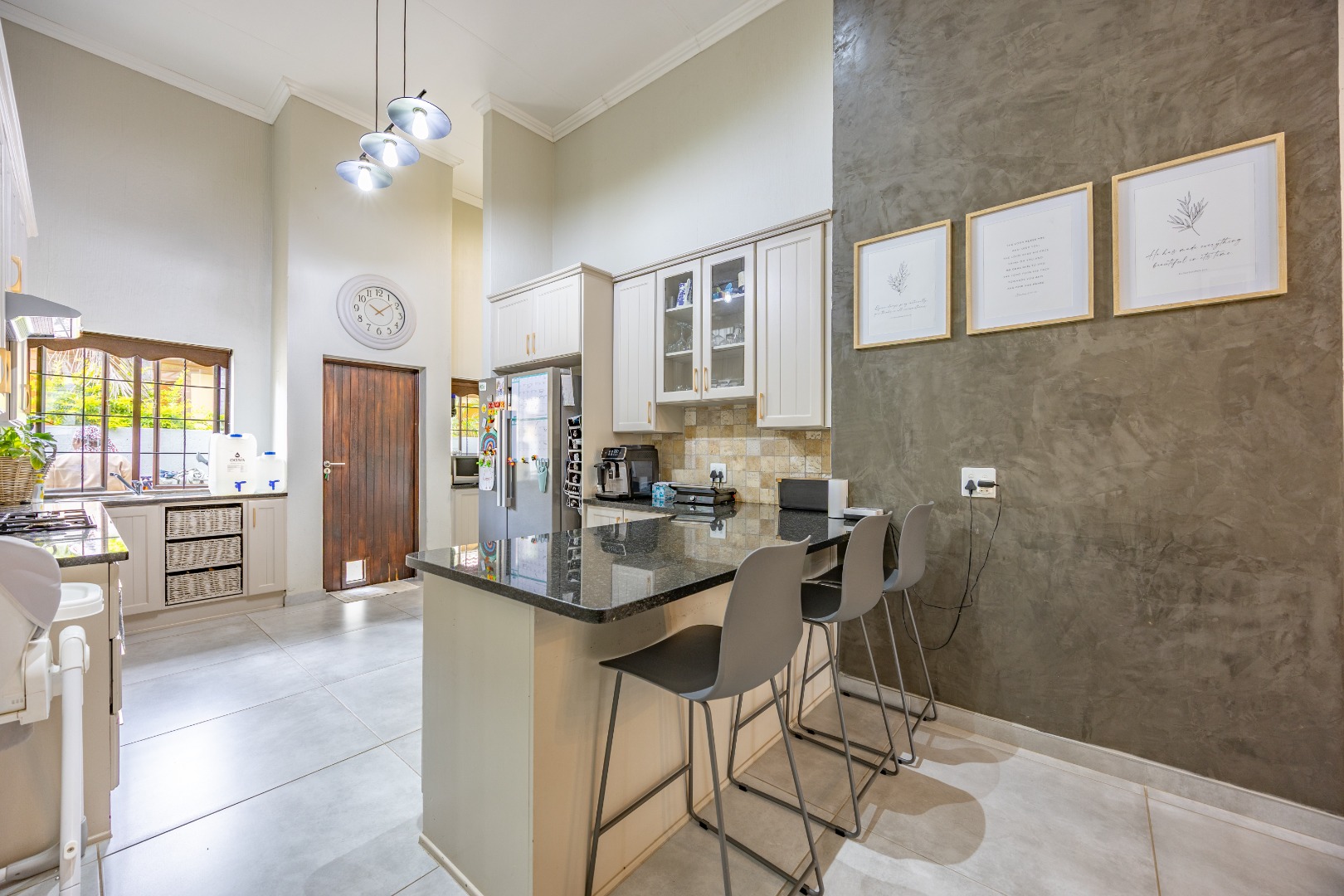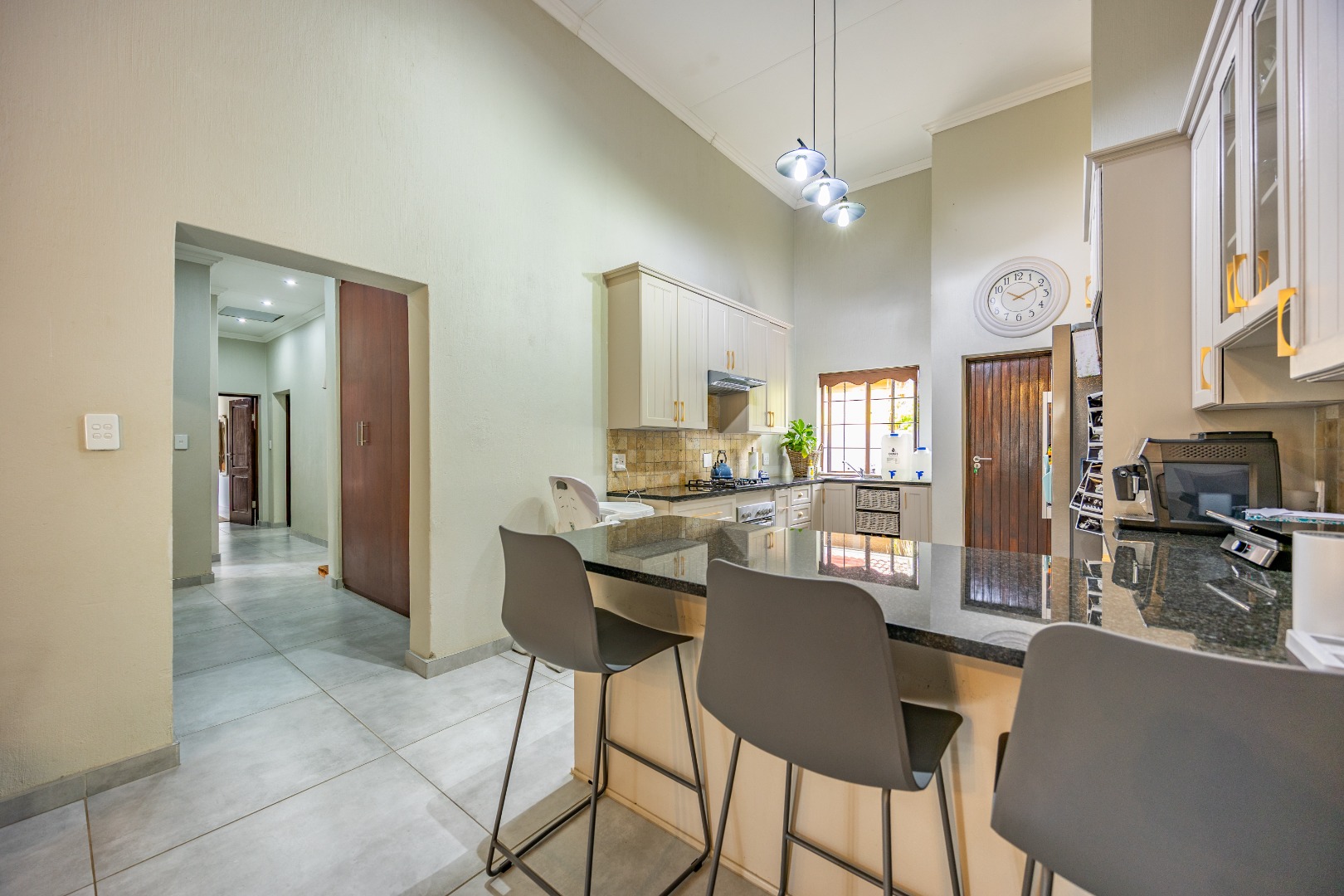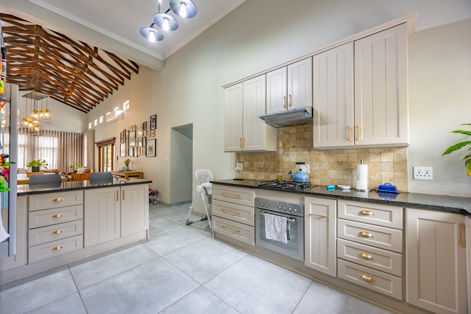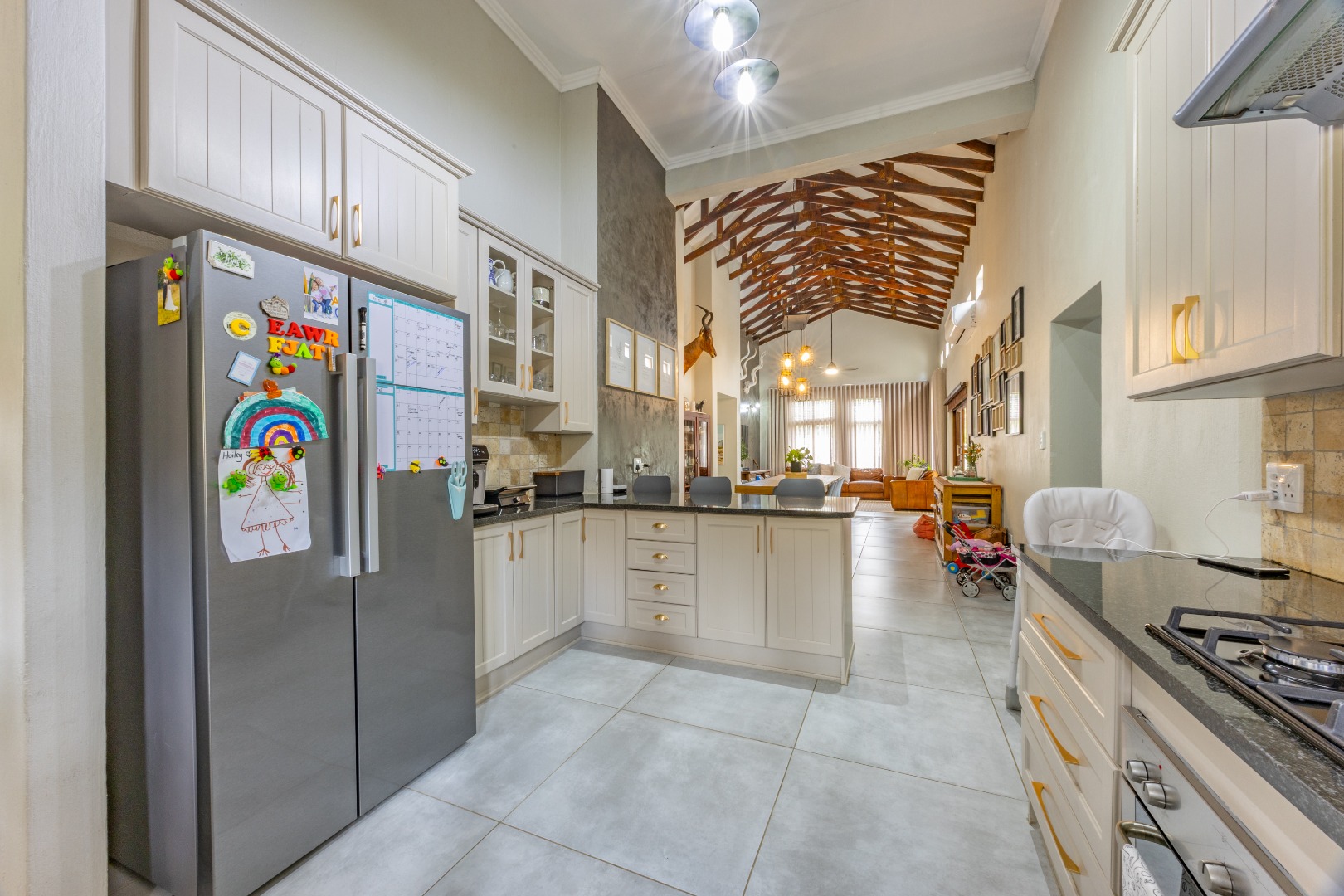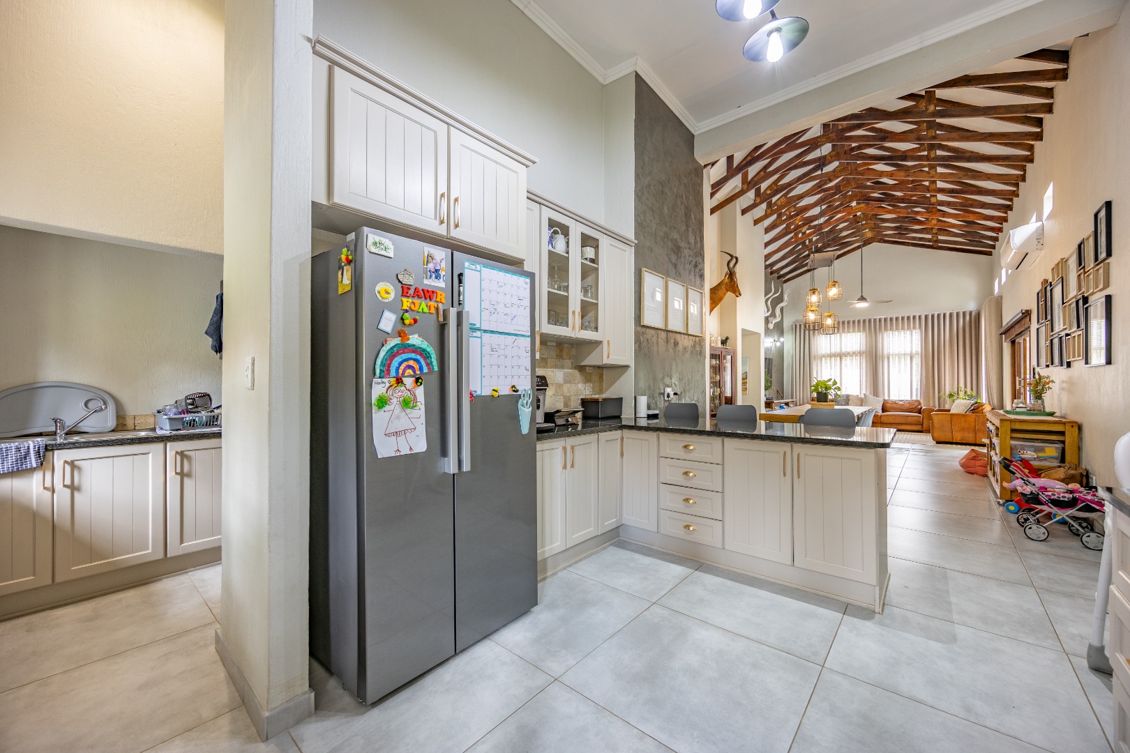 Elegant Comfort, Effortless Living, tucked away in the secure Willow Acres Estate, this beautifully upgraded home offers a seamless blend of family comfort and modern convenience. From the moment you step inside, you’re welcomed by expansive open-plan living areas, centred around a gas fireplace and cooled by a large aircon – perfect for year-round entertaining. The kitchen is a chef’s dream with a gas stove, space for a double fridge, and a generous scullery with a walk-in pantry and room for three appliances. A guest toilet, versatile study or fourth bedroom, and new tiled floors throughout add to the home’s thoughtful design.