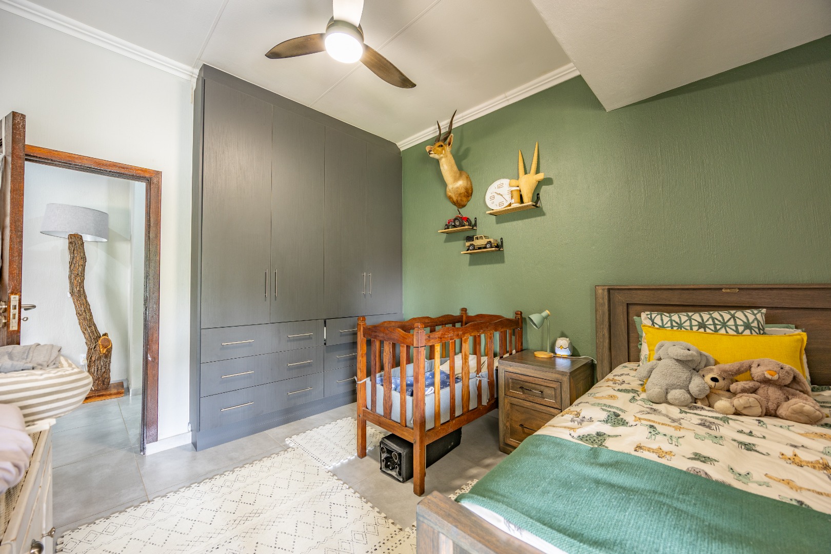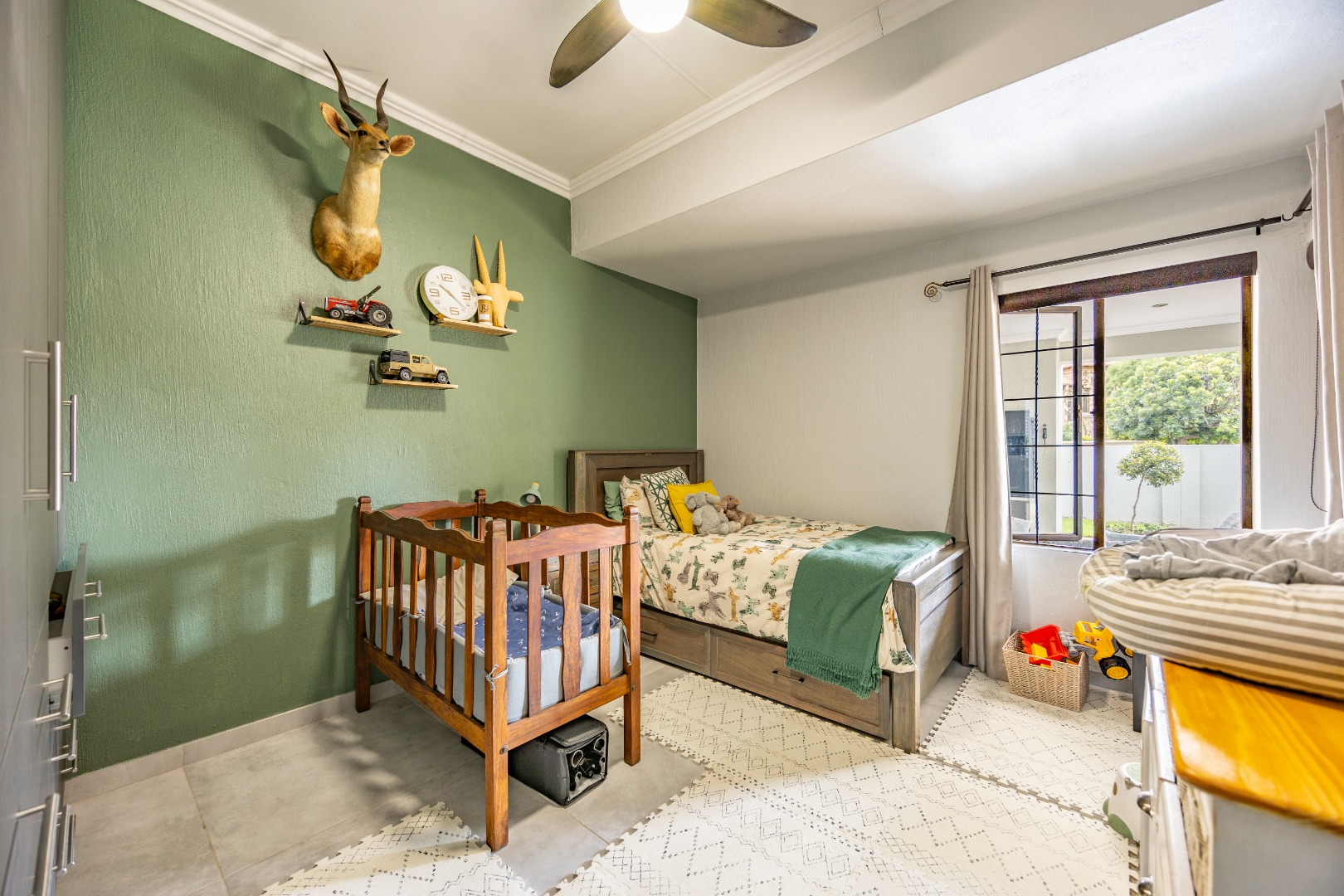The accommodation wing features three well-sized bedrooms with built-in cupboards and ceiling fans, serviced by a full bathroom. The master suite is a peaceful retreat with aircon, ample cupboard space, and a full en suite bathroom. Outside, enjoy a covered patio with a built-in braai, overlooking a sparkling pool, manicured garden with irrigation, jungle gym, and a handy Wendy house. Staff quarters with a private bathroom complete the offering.
