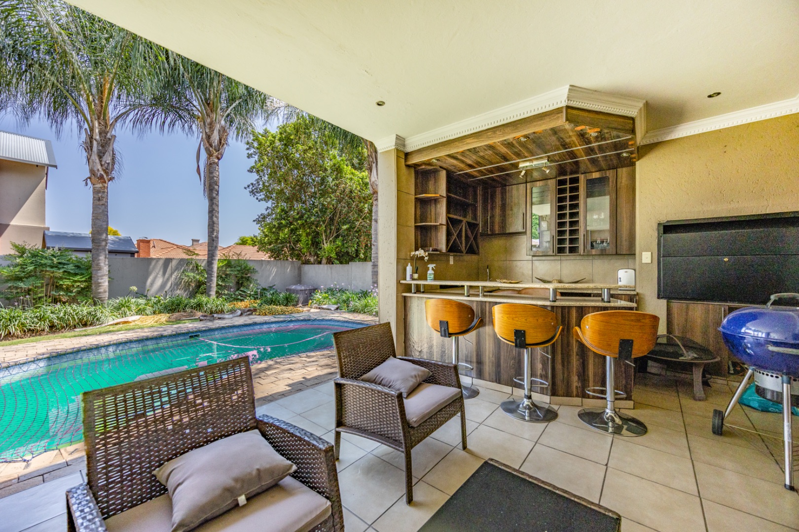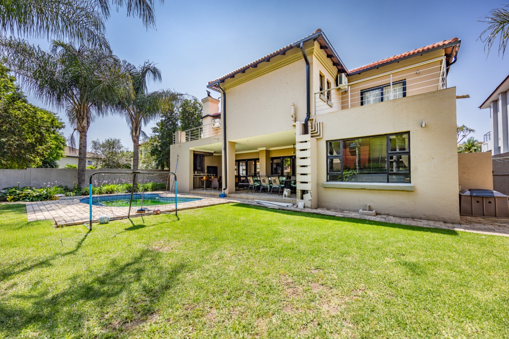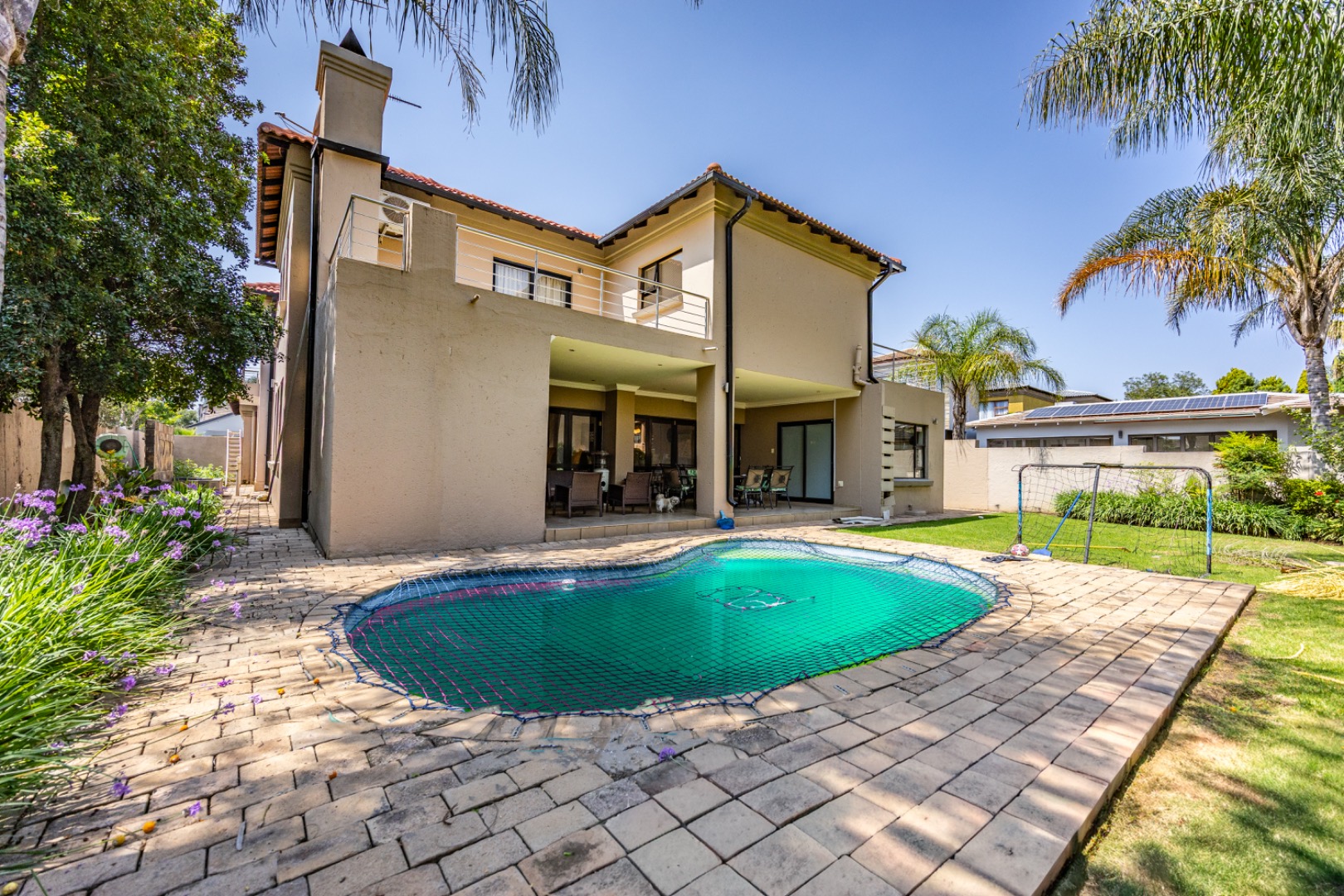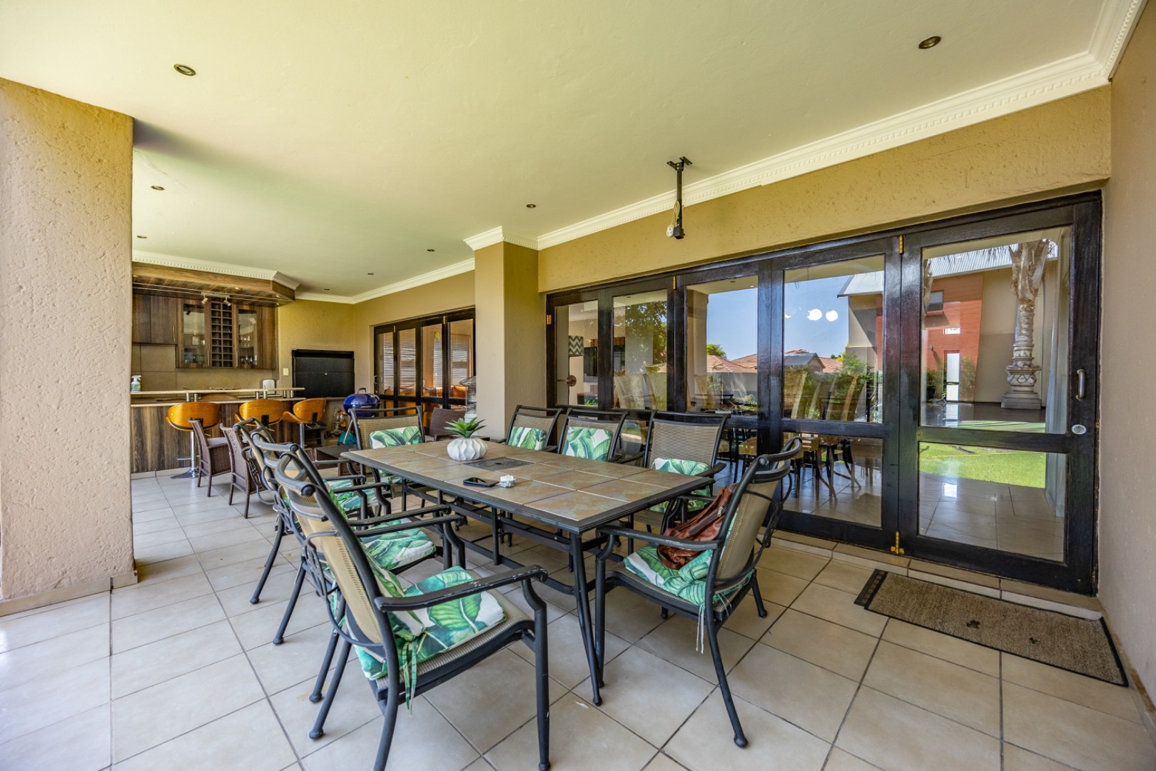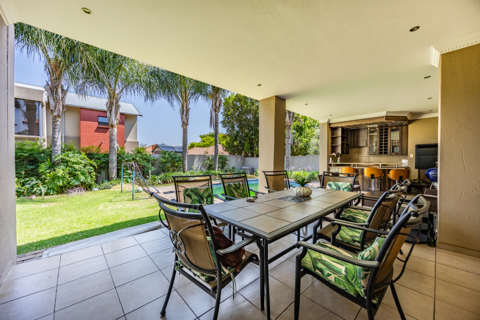 Set on an expansive 880 sqm erf, the outdoor area is a private oasis. Enjoy leisurely days by the swimming pool, relax on the patio, or cultivate the established garden. Ample parking is provided with three garages and an additional six open parking spaces, accommodating multiple vehicles. The property is pet-friendly, allowing furry companions to enjoy the space.