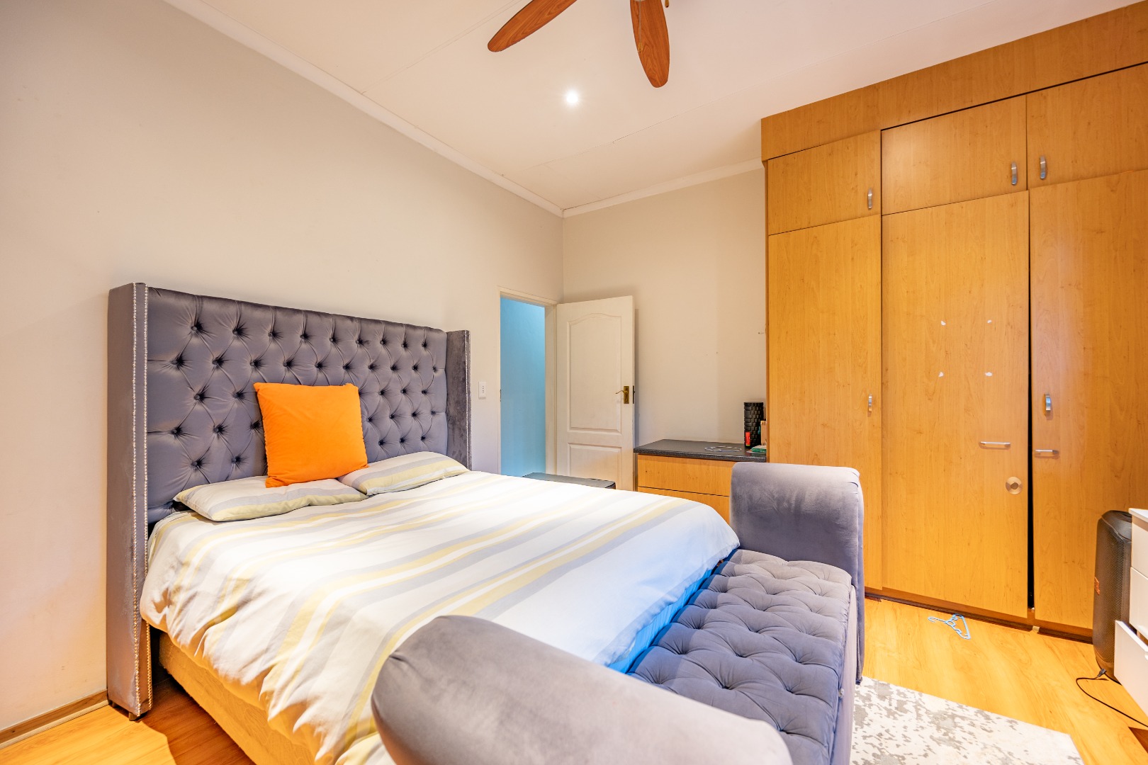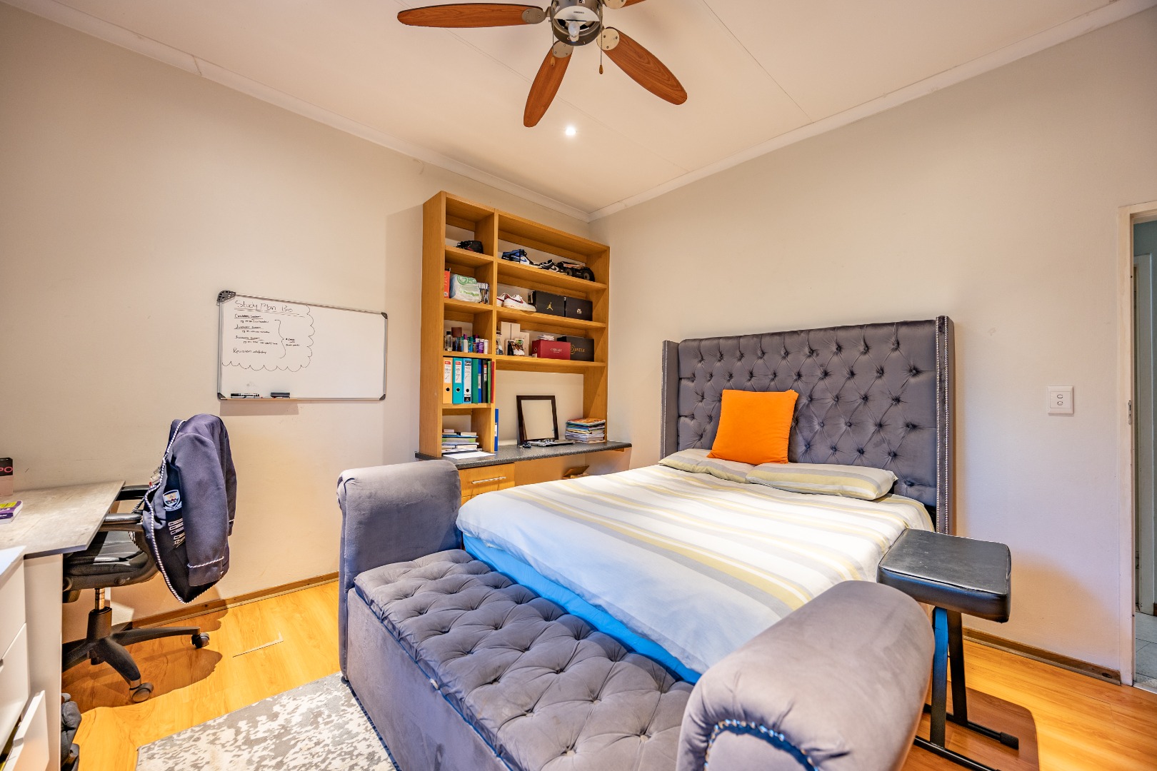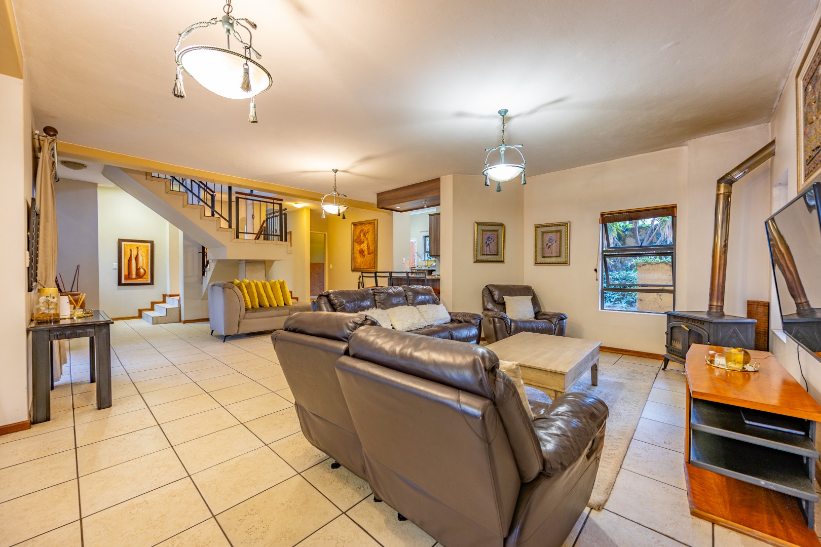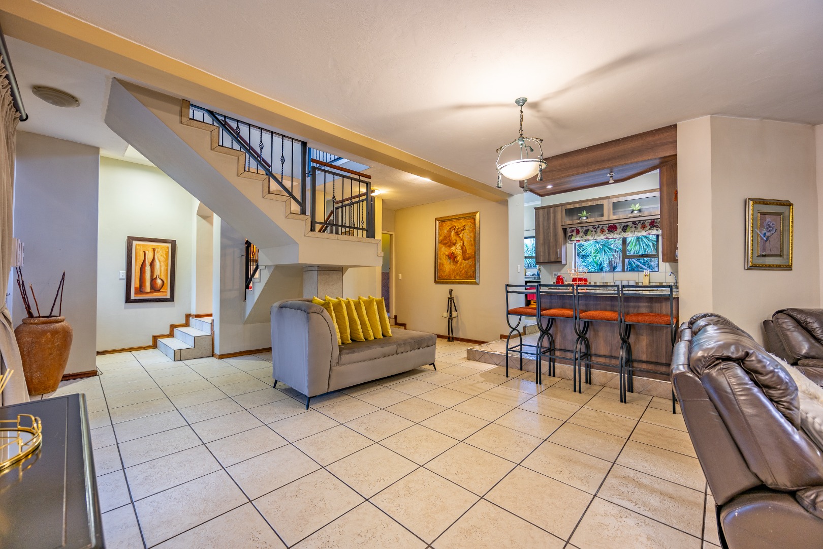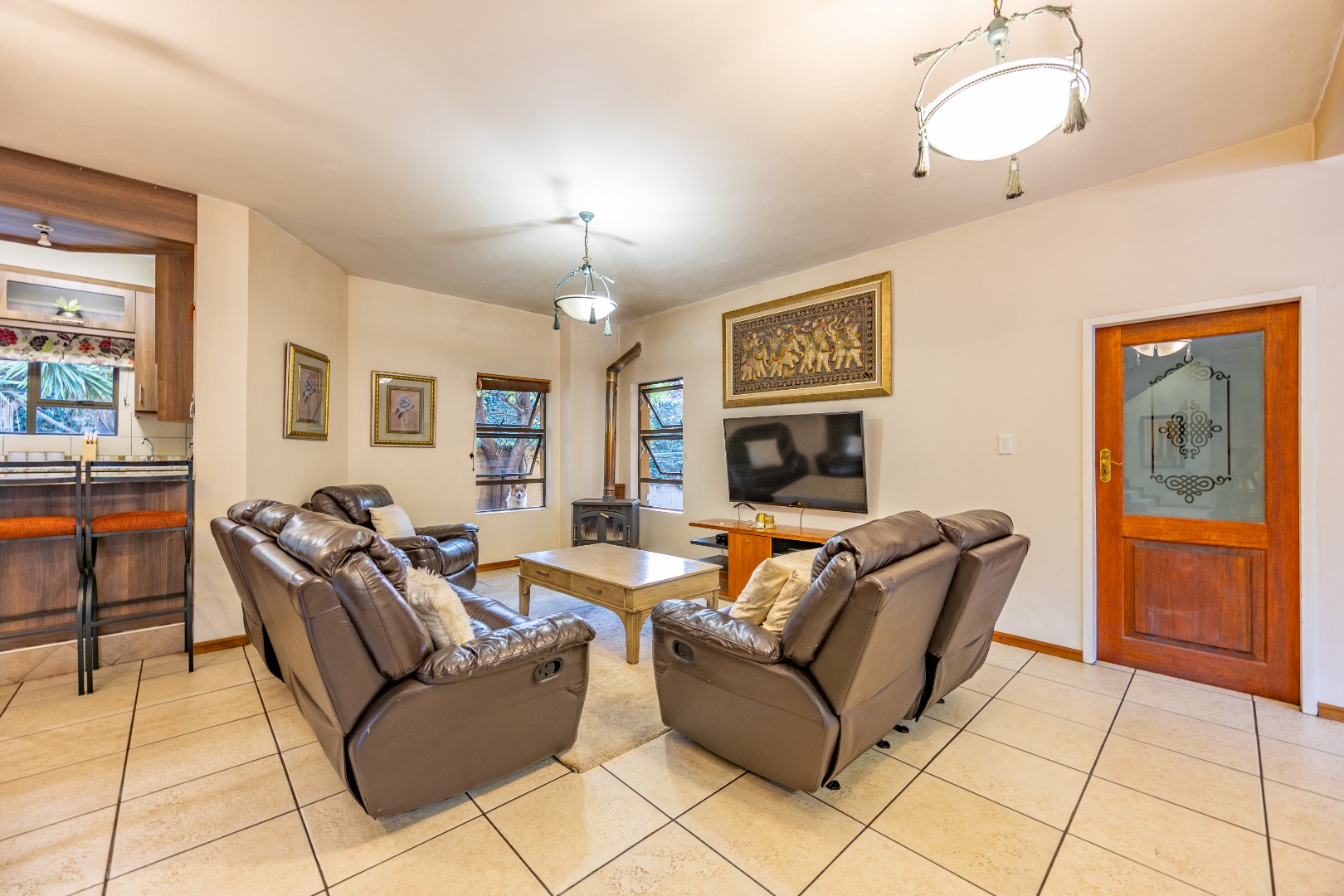 Nestled in the prestigious Woodhill Golf Estate, this exceptional home offers the perfect blend of luxury, comfort, and practicality. The spacious open-plan design seamlessly connects the kitchen, dining, and living areas, creating an inviting space for family gatherings. The modern kitchen, equipped with a gas stove, flows into a separate scullery with space for a double-door fridge and two appliances. A guest toilet adds to the convenience, while three well-sized bedrooms, each with built-in cupboards, share a full bathroom. The second bedroom also features a built-in desk and shelving, perfect for work or study.