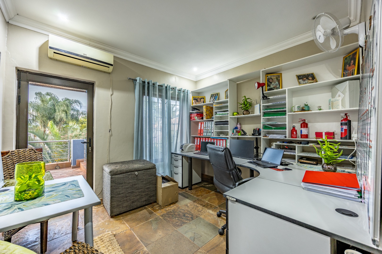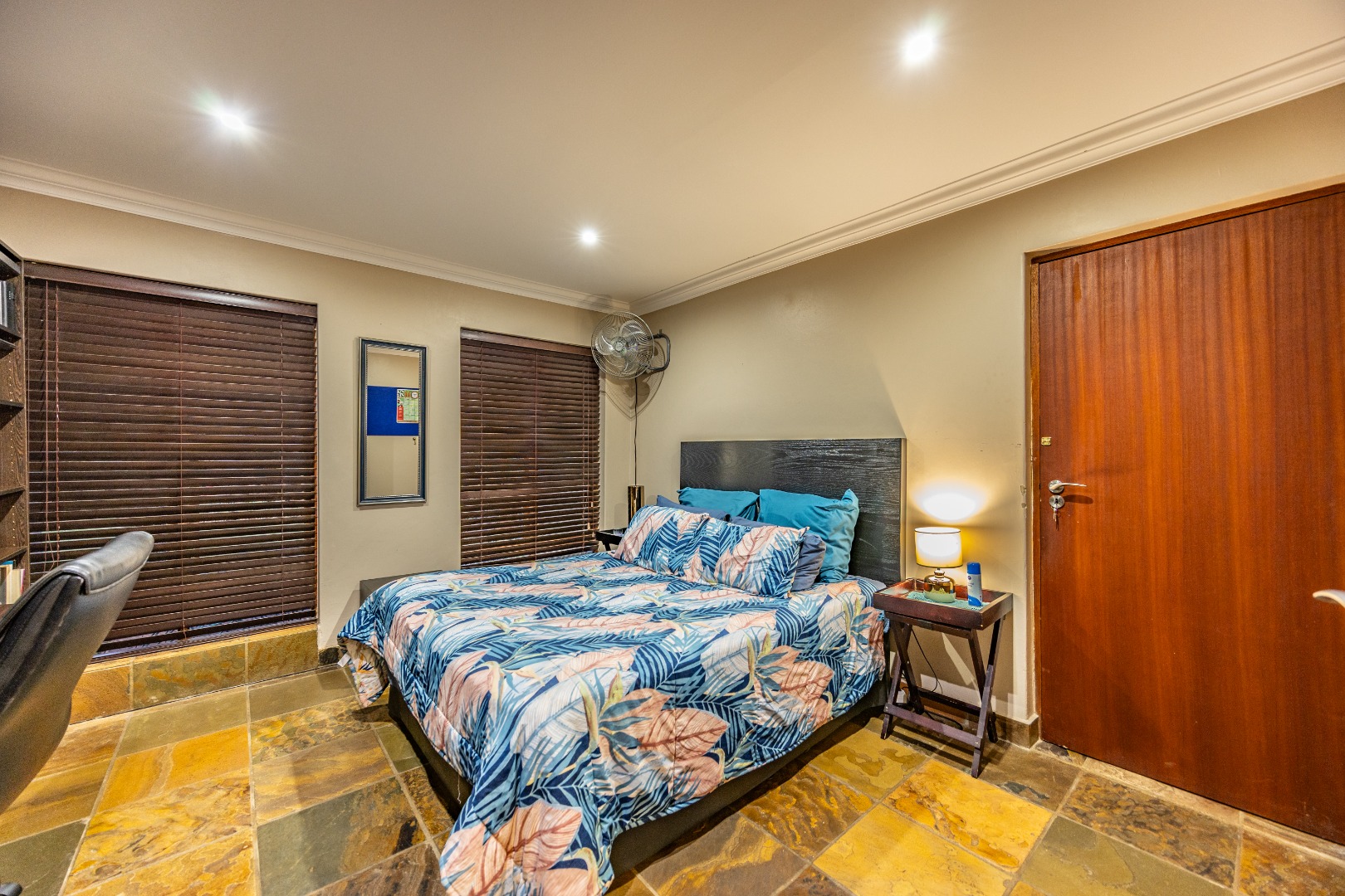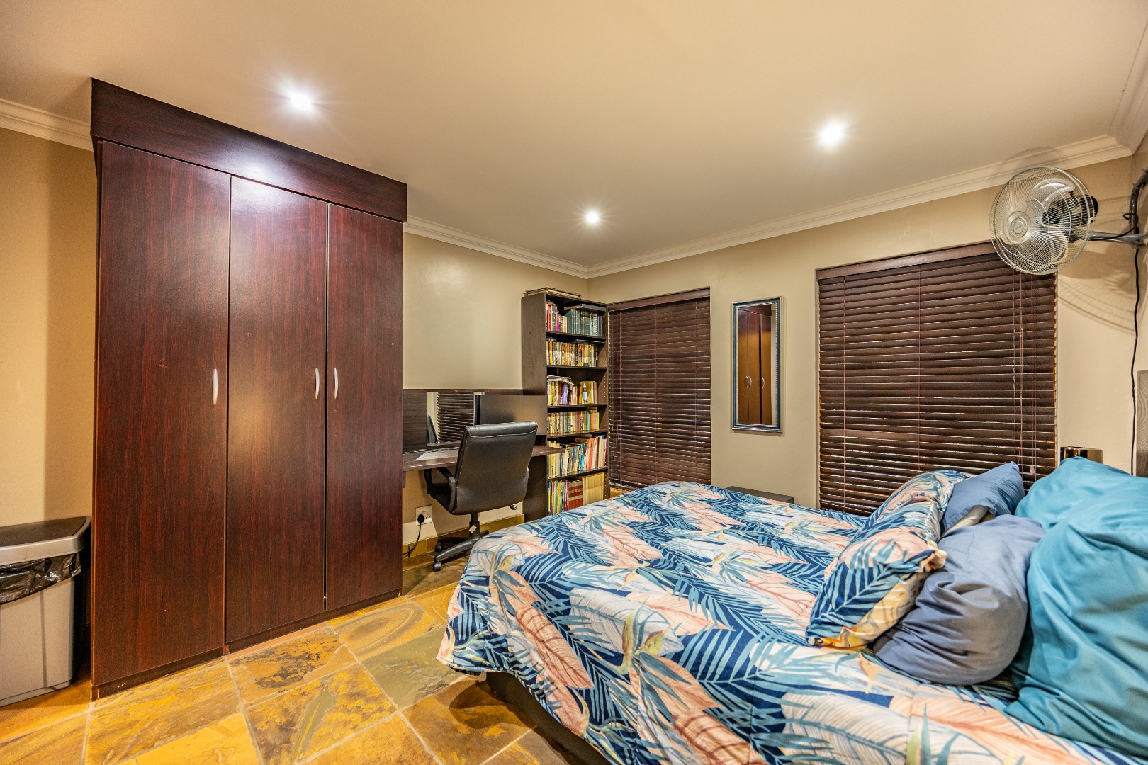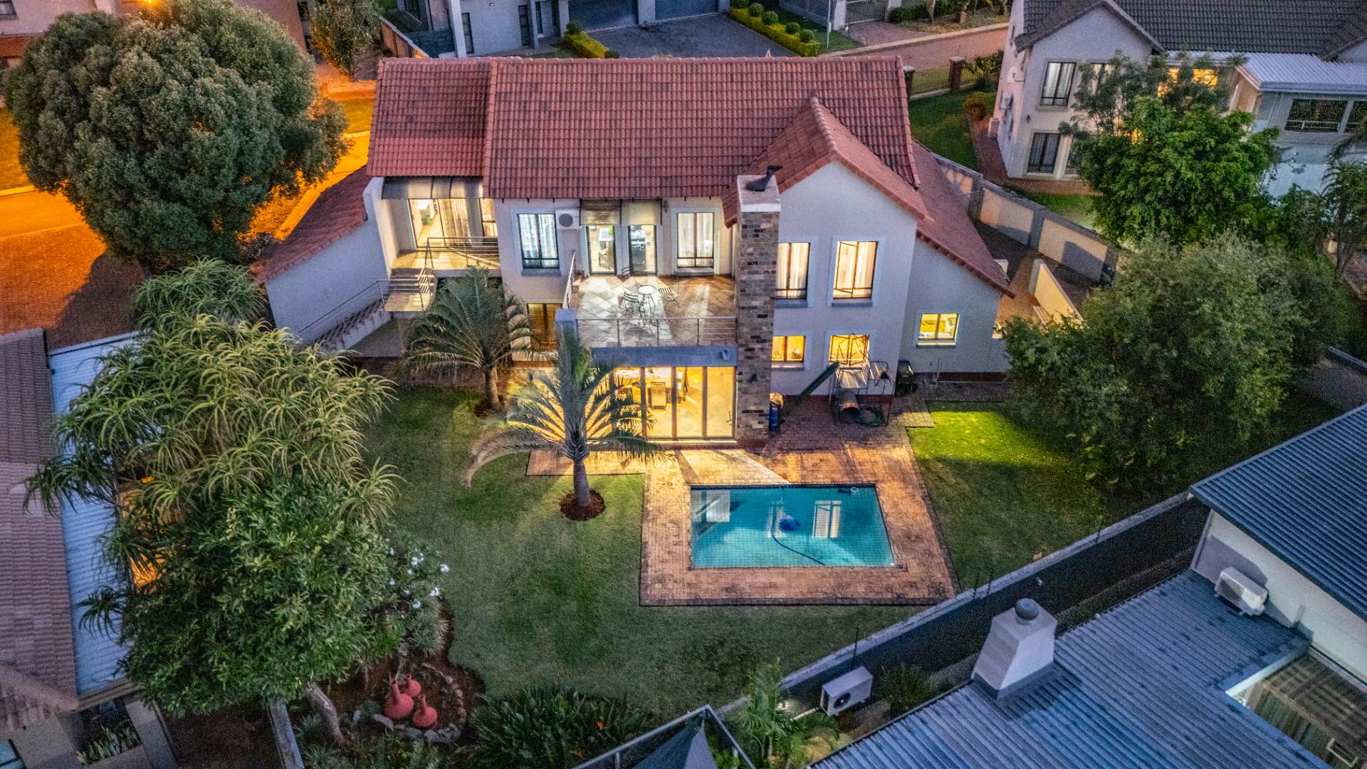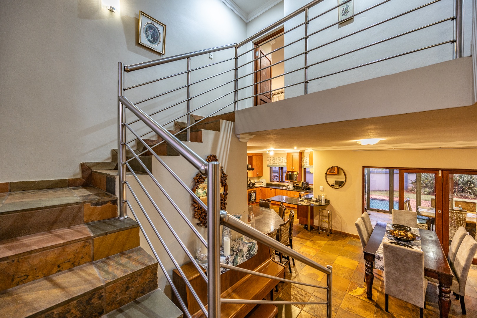 Situated in the heart of Zambezi Country Estate, this beautifully maintained five-bedroom, three-bathroom home offers the kind of space that actually works for a real family. Every bedroom is fitted with built-in cupboards, while the main suite takes it up a level with a walk-in cupboard and a stylish en-suite bathroom. The main bedroom and two of the upstairs bedrooms open onto a balcony overlooking the pool and garden, creating a calm retreat from the day. The fifth bedroom, with its own private entrance, offers excellent potential for a flatlet, guest suite or work-from-home setup.