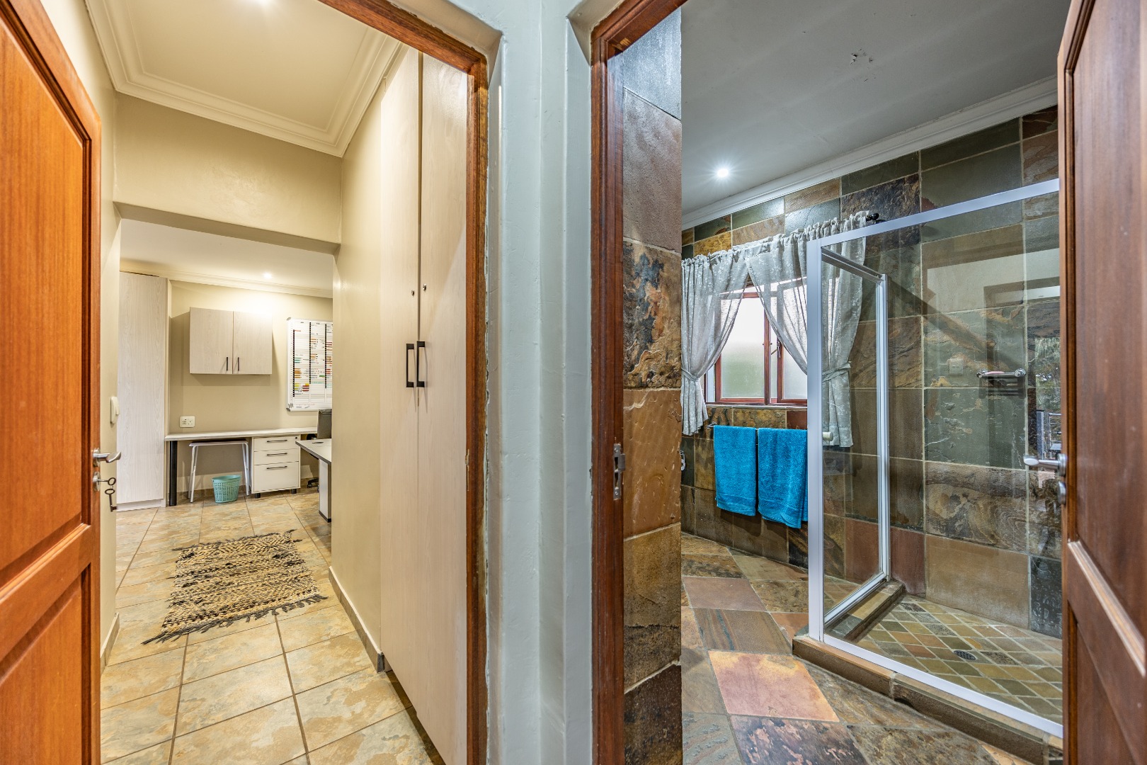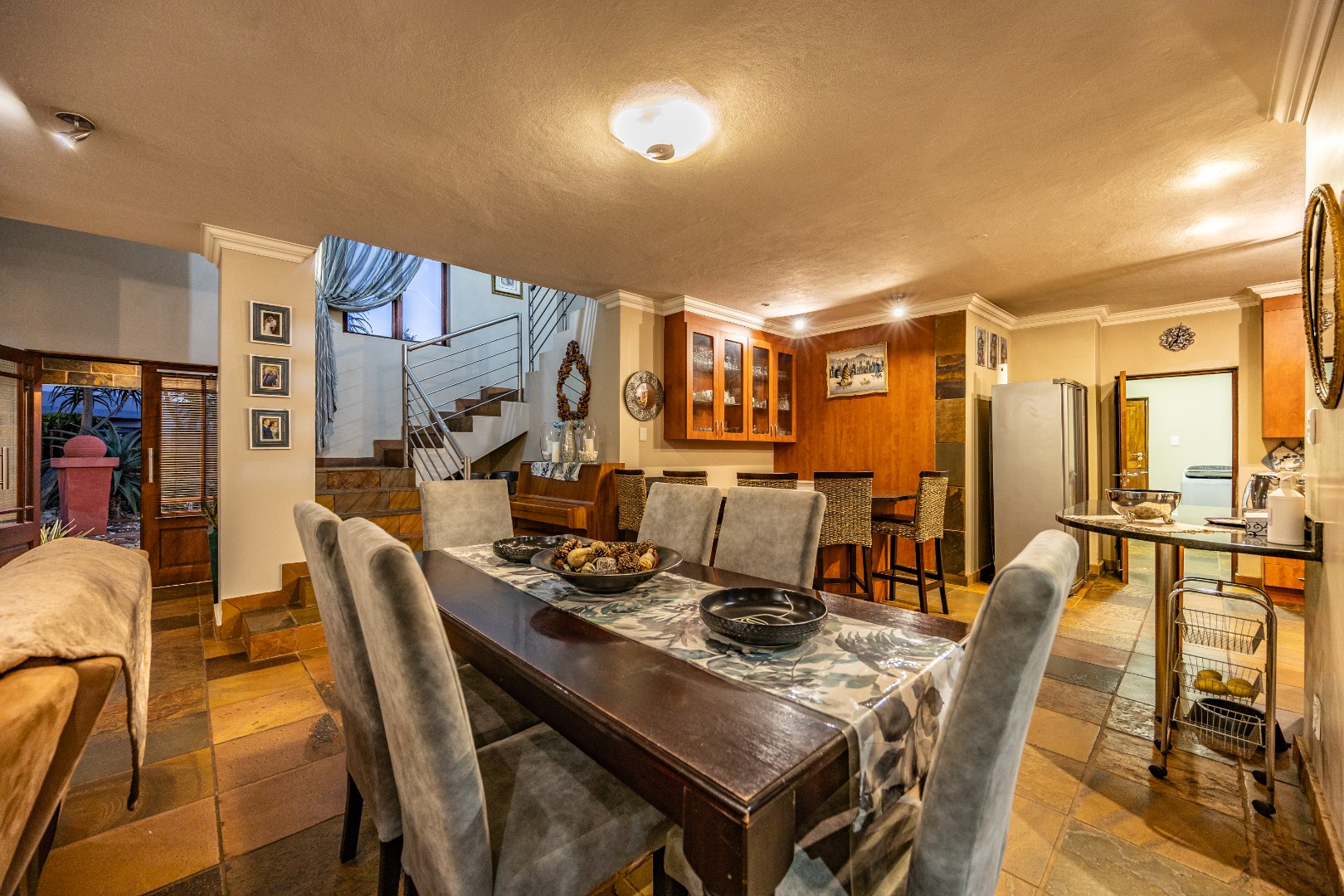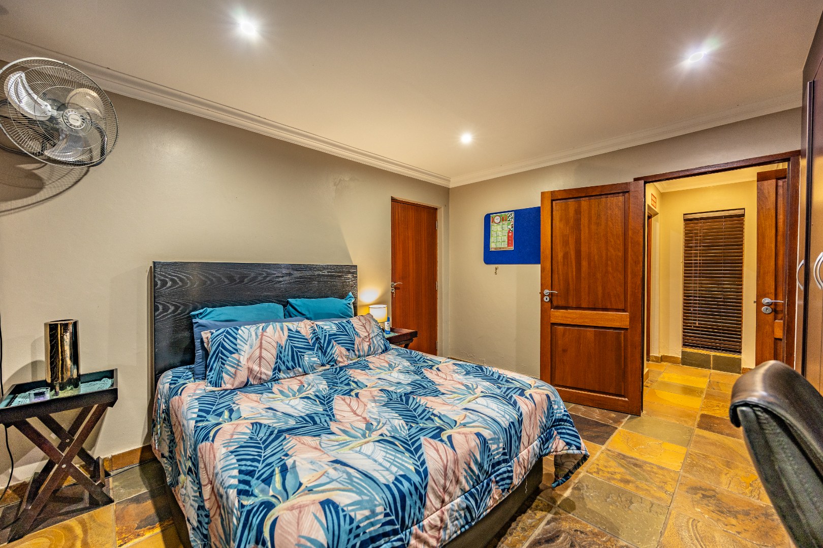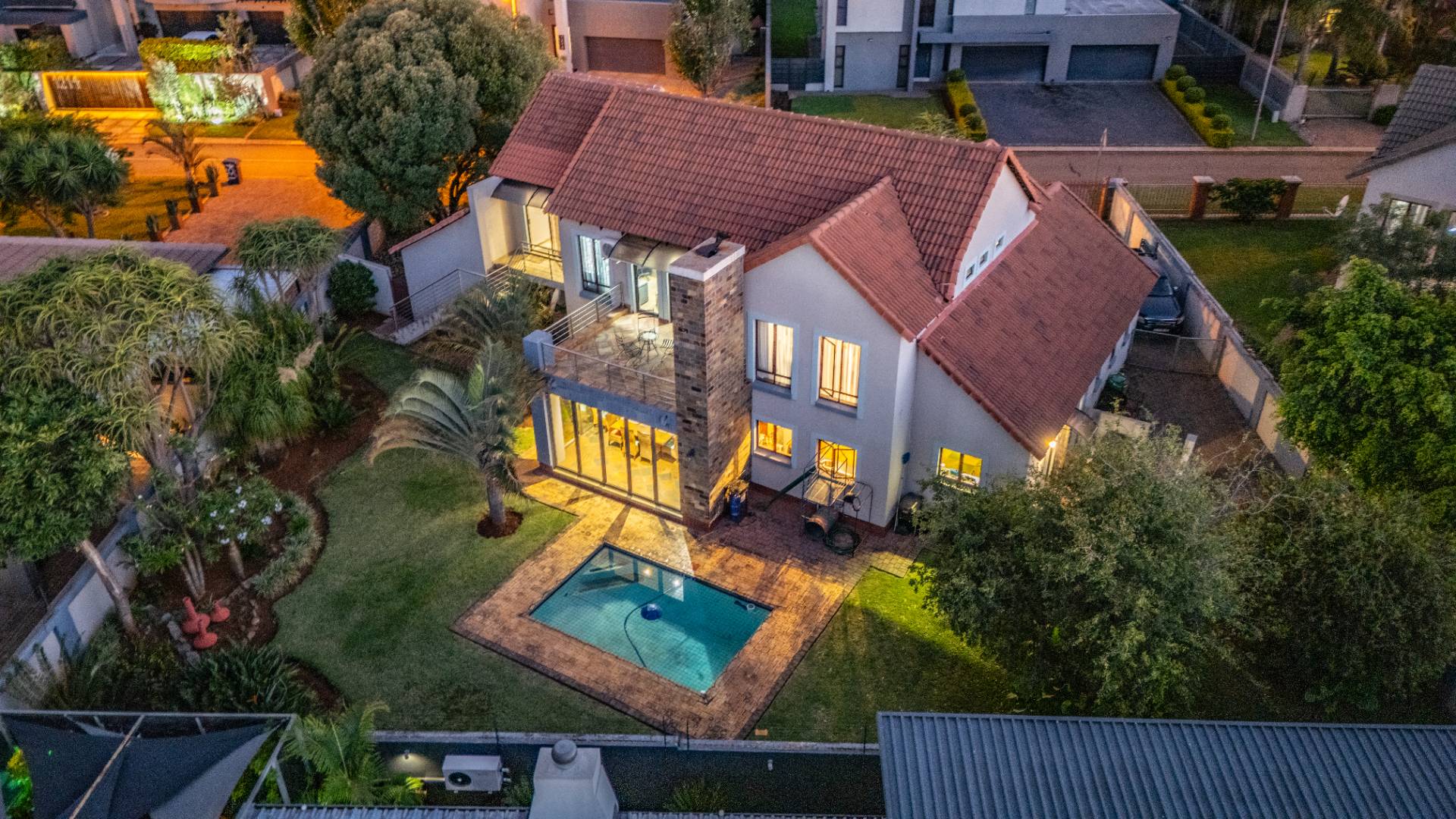 Situated in the heart of Zambezi Country Estate, this beautifully maintained five-bedroom, three-bathroom home offers the kind of space that actually works for a real family. Every bedroom is fitted with built-in cupboards, while the main suite takes it up a level with a walk-in cupboard and a stylish en-suite bathroom. The main bedroom and two of the upstairs bedrooms open onto a balcony overlooking the pool and garden, creating a calm retreat from the day. The fifth bedroom, with its own private entrance, offers excellent potential for a flatlet, guest suite or work-from-home setup.