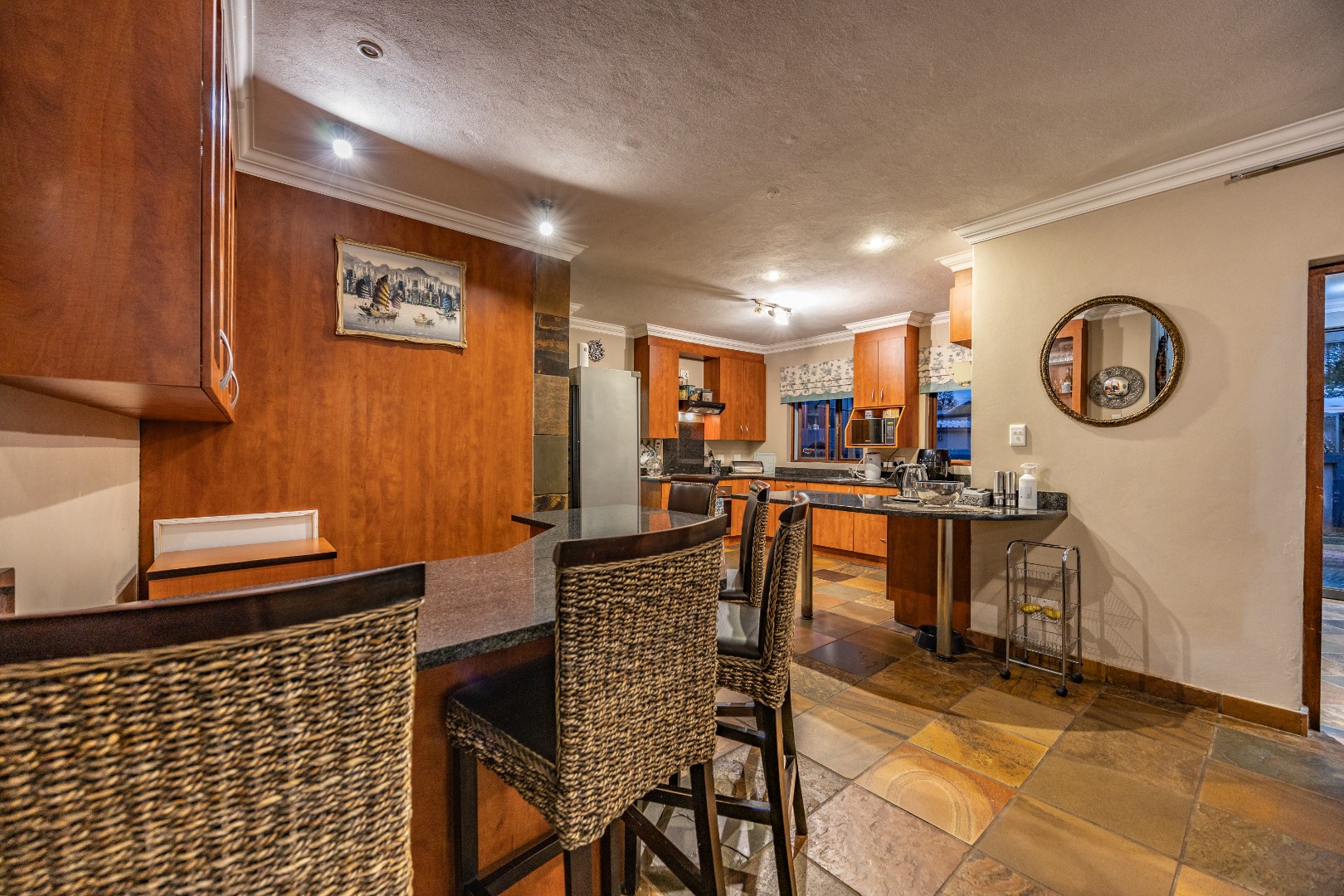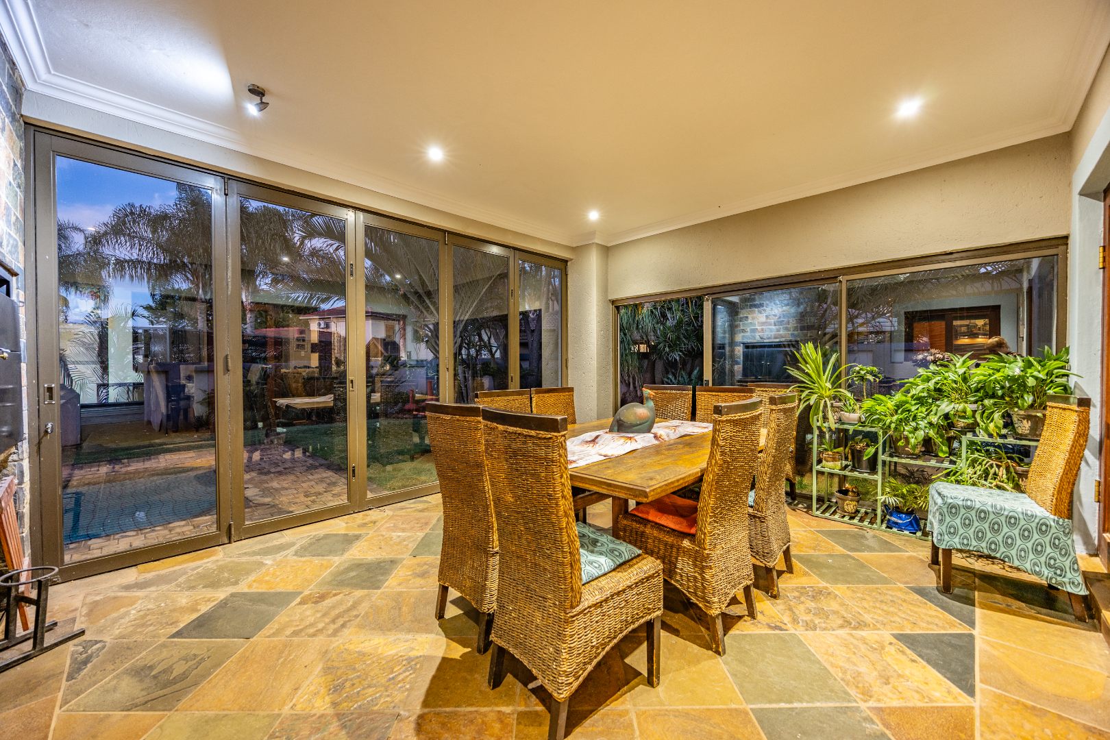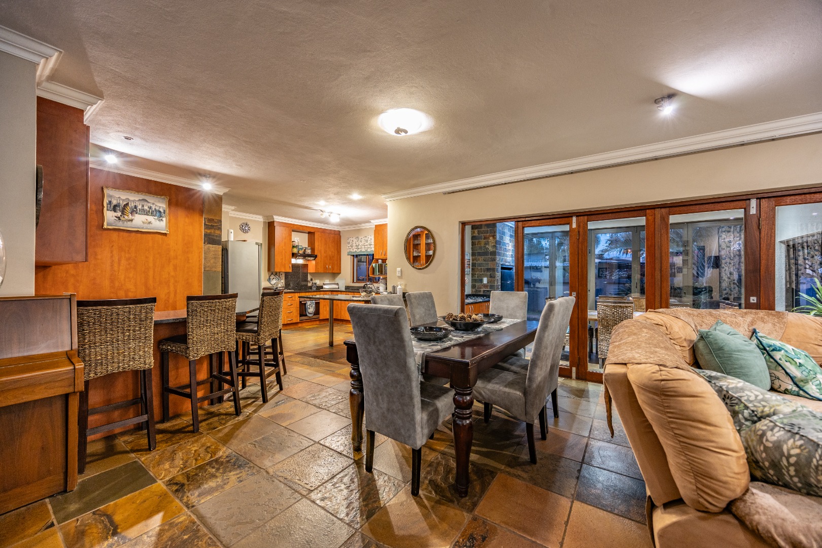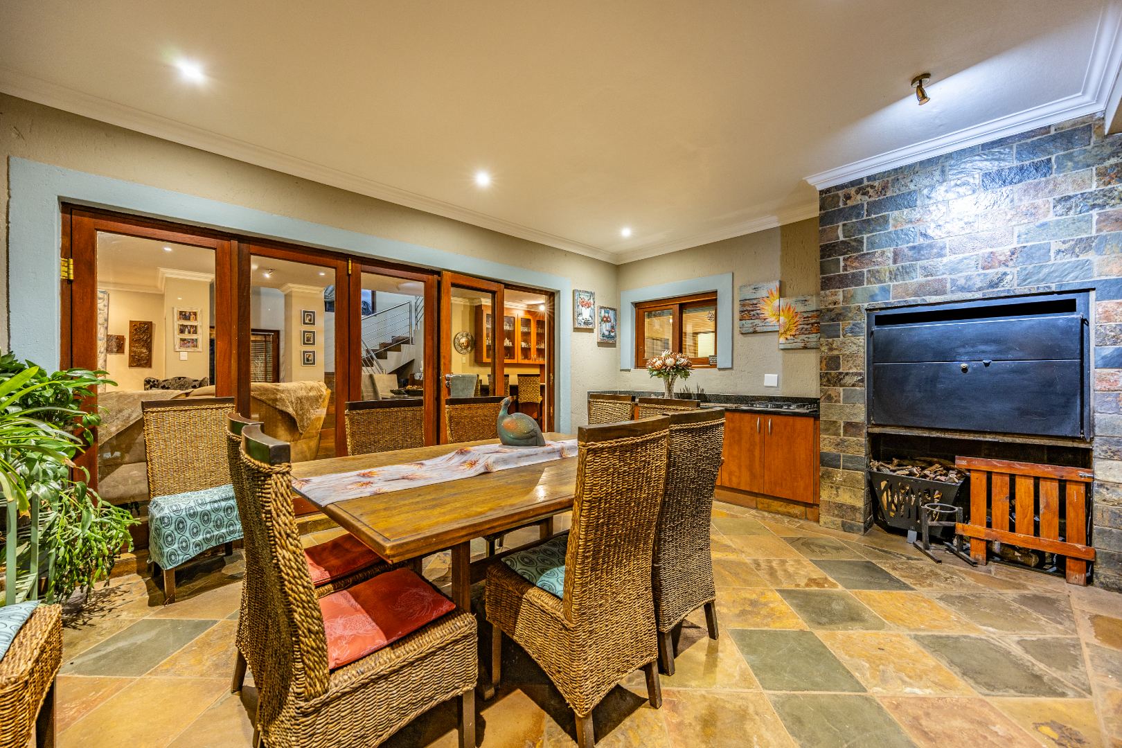 The living areas are open-plan and flow naturally from the lounge to the dining room and into a well-designed kitchen fitted with granite countertops, an electric stove, undercounter oven, breakfast nook, separate scullery and pantry. An enclosed entertainment patio with a built-in braai and gas hob becomes the social heart of the home, opening through stack doors to a sparkling pool and manicured, pet-friendly garden — the kind of space made for weekends with friends and family.