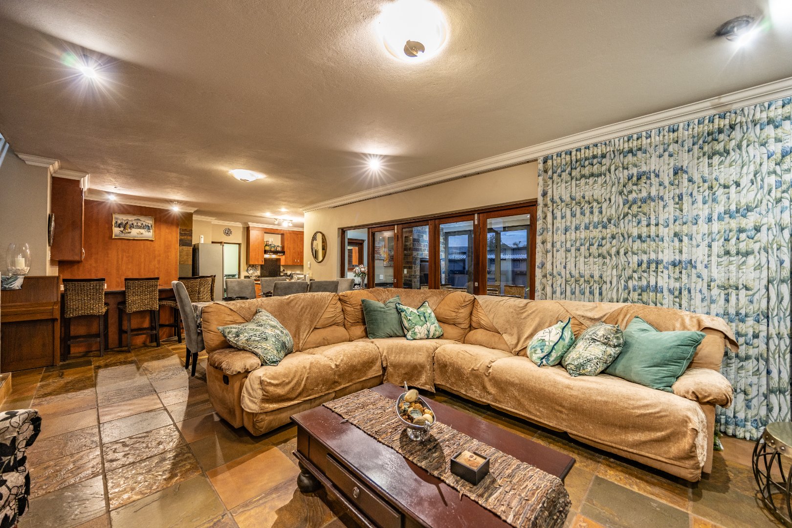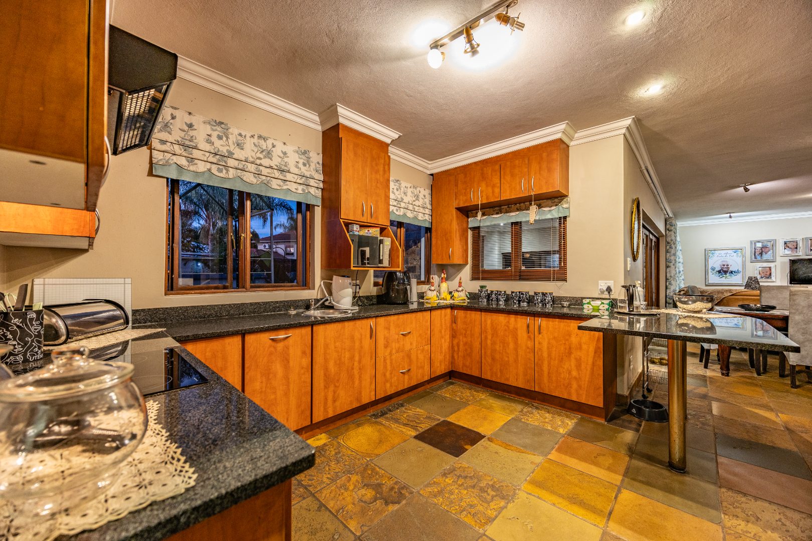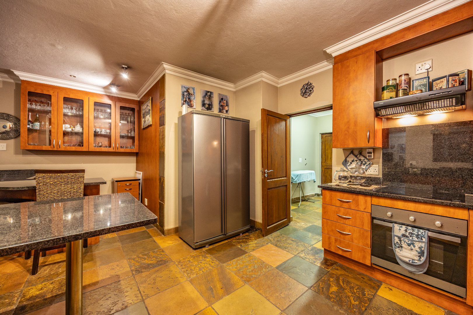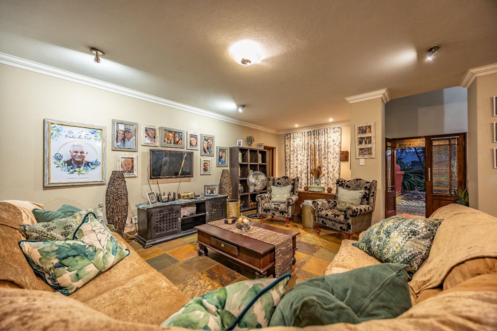 The living areas are open-plan and flow naturally from the lounge to the dining room and into a well-designed kitchen fitted with granite countertops, an electric stove, undercounter oven, breakfast nook, separate scullery and pantry. An enclosed entertainment patio with a built-in braai and gas hob becomes the social heart of the home, opening through stack doors to a sparkling pool and manicured, pet-friendly garden — the kind of space made for weekends with friends and family.