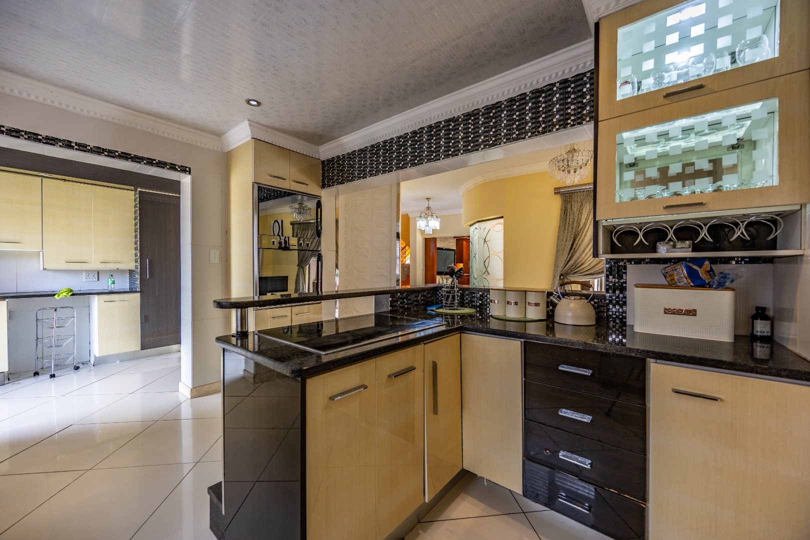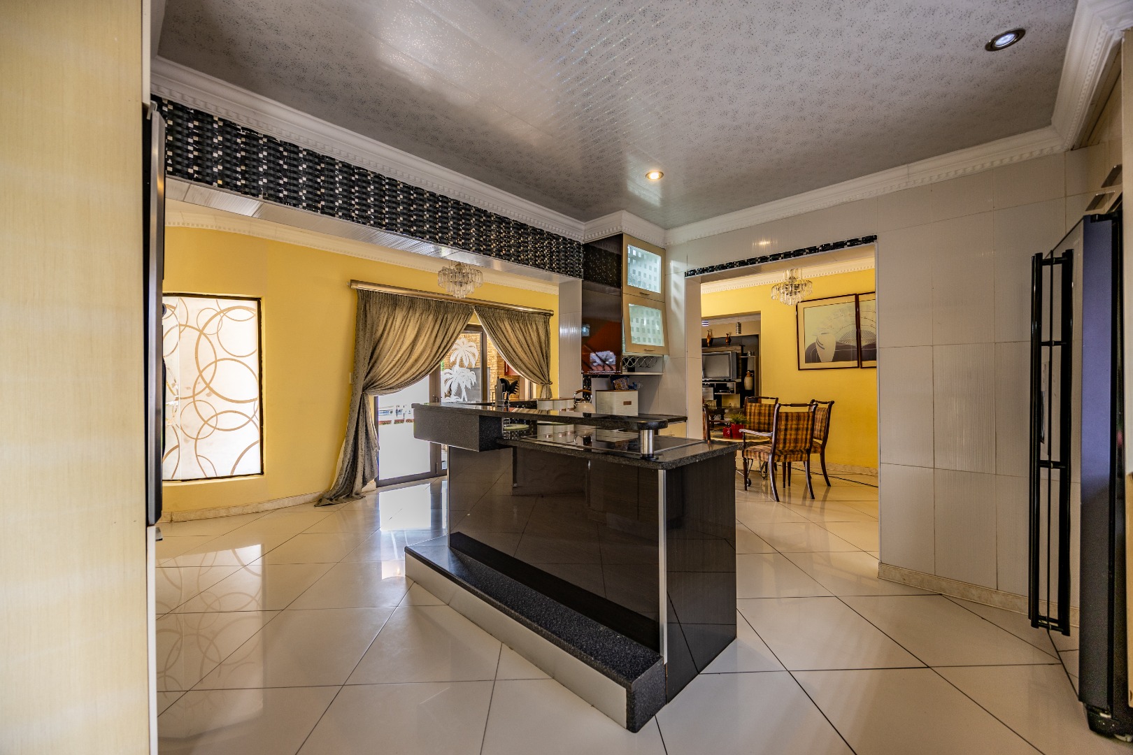 Downstairs is where this home truly comes alive. A welcoming lounge with fireplace flows into the dining area, while a dedicated bar space sets the tone for effortless entertaining. The open-plan kitchen is fitted to accommodate a double fridge, features a walk-in pantry, and connects seamlessly to a separate scullery with direct outdoor access. A guest toilet is conveniently positioned near the entrance.