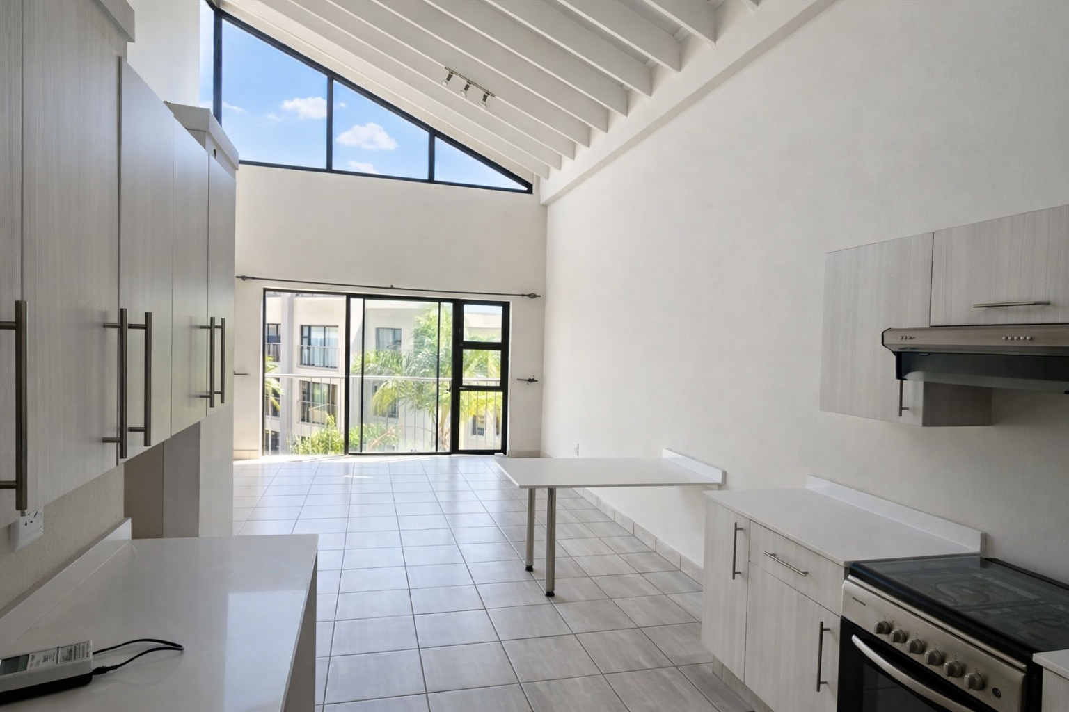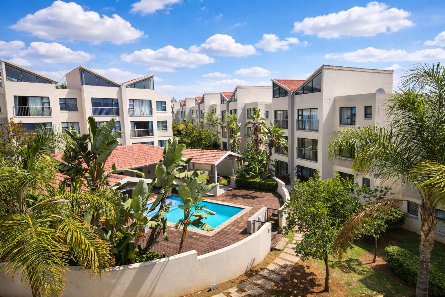 Discover contemporary living in this stylish 67 sqm apartment located within a sought-after security complex in Beverley. The interior boasts a bright, open-plan design, accentuated by high vaulted ceilings and expansive windows that invite abundant natural light. The modern kitchen features sleek light cabinetry, white countertops, and integrated appliances, seamlessly flowing into the lounge area, perfect for relaxed living and entertaining. This apartment offers two well-appointed bedrooms, each designed for comfort and privacy. The main bedroom includes an en-suite bathroom, while a second modern bathroom serves the additional bedroom and guests. Both bathrooms are finished with contemporary fixtures, including floating vanities and a combination of walk-in showers and a freestanding bathtub, providing a clean and functional aesthetic. The complex itself presents a modern architectural design with appealing kerb appeal, set amidst lush tropical landscaping. Residents can enjoy a resort-style communal swimming pool with wooden decking, ideal for relaxation and leisure. A club house further enhances the lifestyle offerings, providing a convenient space for social gatherings within the community. Pets are also welcome, adding to the homely atmosphere. Ensuring peace of mind, this security complex benefits from 24-hour security, CCTV surveillance, an access gate, and an intercom system. The property is fibre-ready, catering to modern connectivity needs. Situated in the desirable suburban area of Sandton, this location offers convenient access to local amenities and major routes, making it an ideal choice for discerning buyers seeking a blend of comfort and accessibility. Key Features: * 2 Bedrooms, 2 Bathrooms (1 En-suite) * 67 sqm Floor Size * Open-plan Lounge & Modern Kitchen * 2 Dedicated Parking Bays * Communal Swimming Pool & Club House * 24-Hour Security & CCTV * Fibre-Ready Connectivity * Pets Allowed * High Vaulted Ceilings & Abundant Natural Light