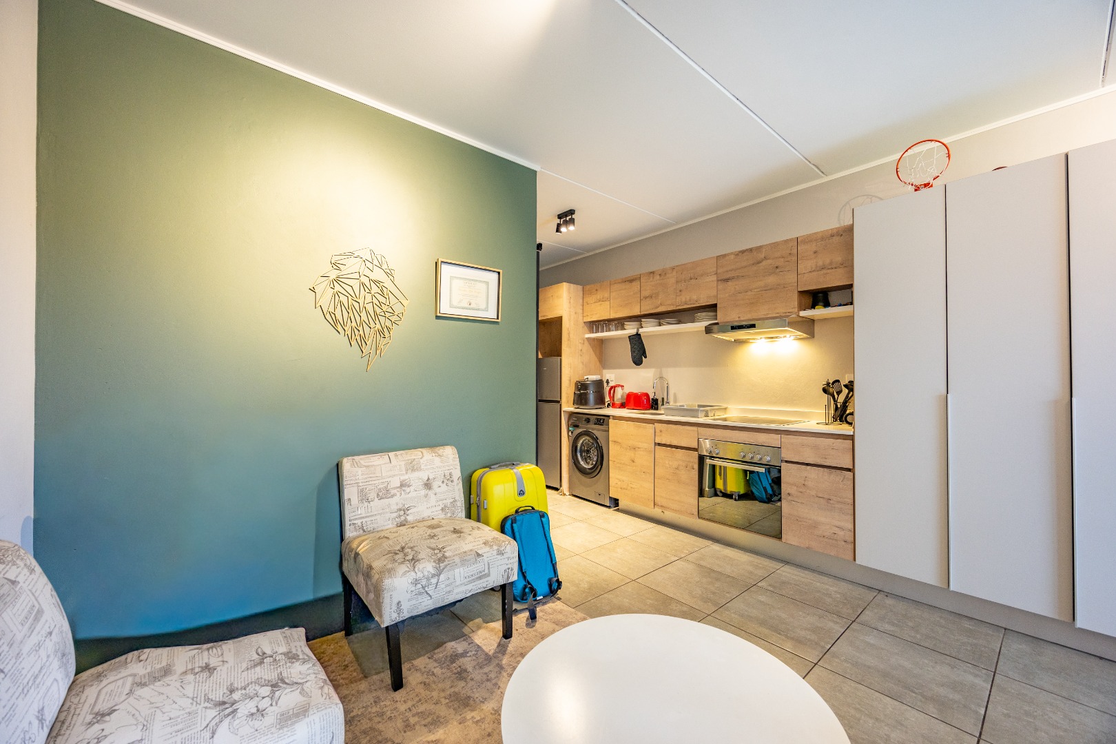 The unit comes fully equipped with a fridge, microwave, and washing machine, making it a move-in-ready option. A small private balcony provides a pleasant outdoor space to relax, while the overall design maintains a clean, modern aesthetic.