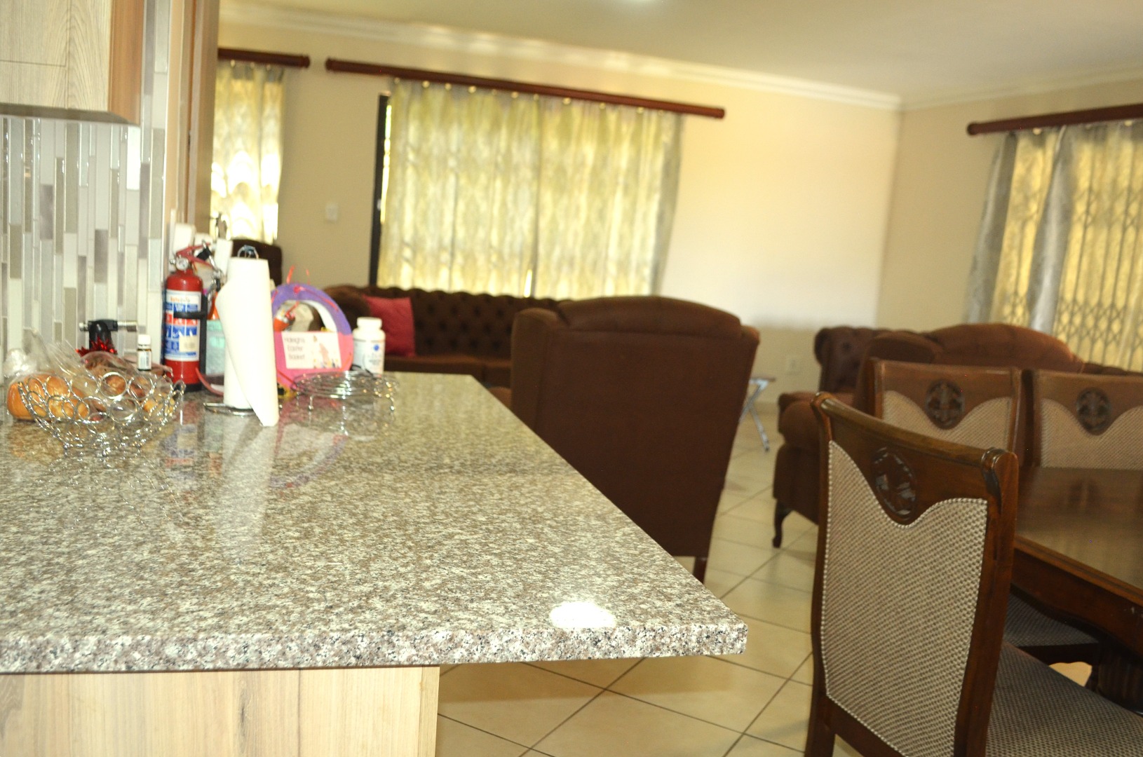 Downstairs, the home opens into a seamless open-plan layout, comprising a welcoming living and dining area that flows effortlessly into the well-equipped kitchen. The kitchen is a highlight, featuring a breakfast nook, a separate scullery, a spacious pantry cupboard, and elegant granite countertops. A convenient guest bathroom and a large storage cupboard neatly tucked under the staircase complete this level. The property benefits from being light-drenched, creating a bright and inviting atmosphere throughout.