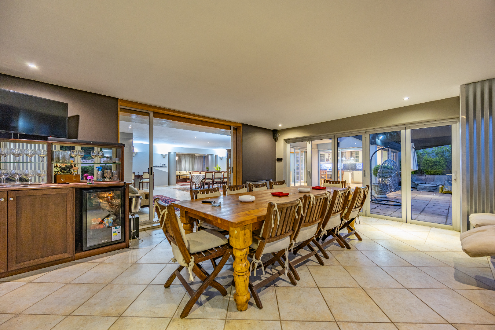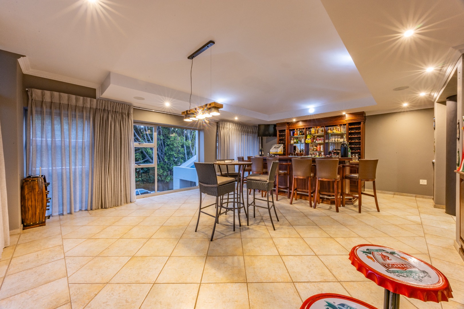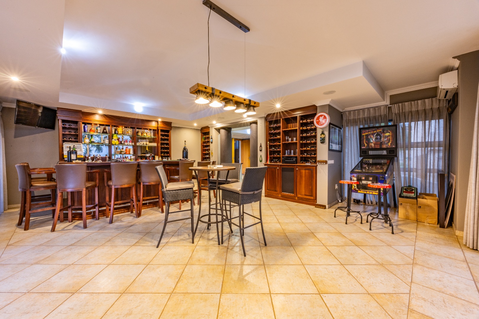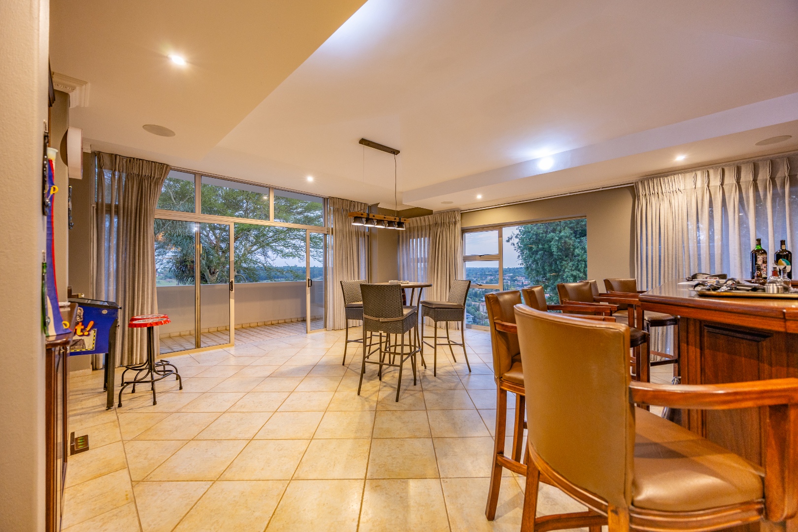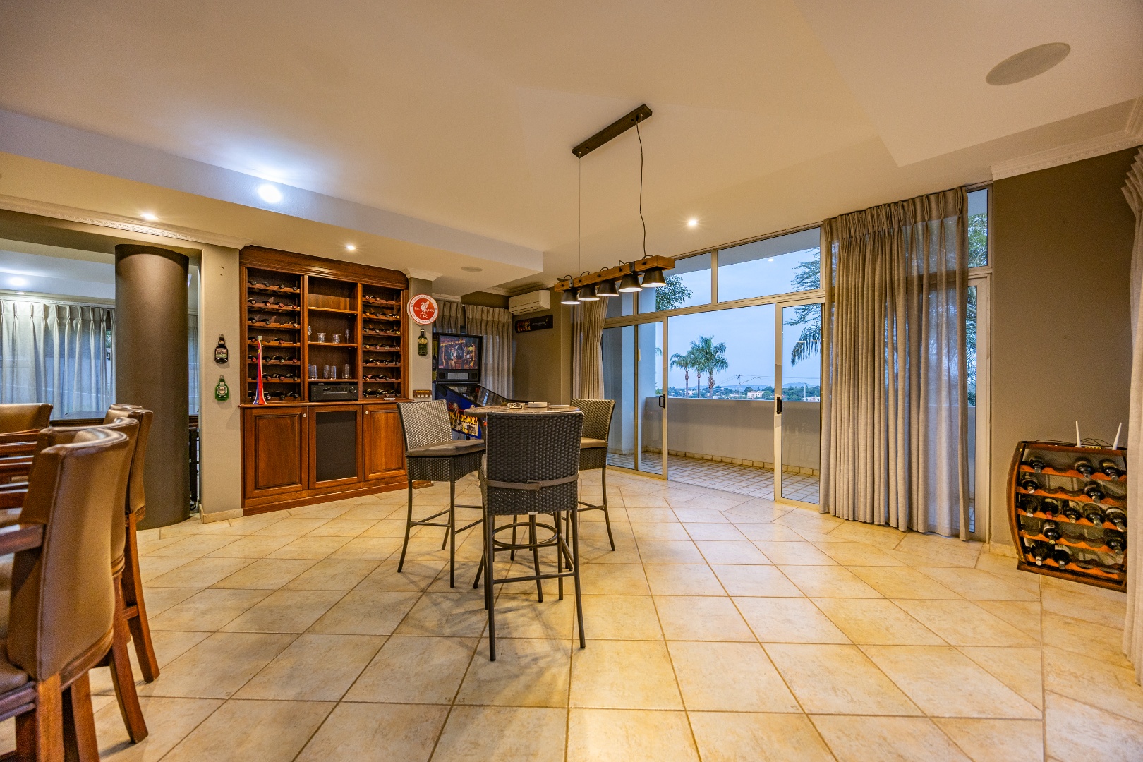 This expansive Waterkloof Ridge residence is designed for effortless living and entertaining on a grand scale. A welcoming entrance hall leads into multiple living areas including a TV room with surround sound, air-conditioning, a private study, and a fully fitted bar. The dining room flows seamlessly into a covered entertainment area with a gas braai and stack doors, creating a perfect indoor–outdoor lifestyle. Generous proportions, clean lines, and quality finishes set the tone throughout.