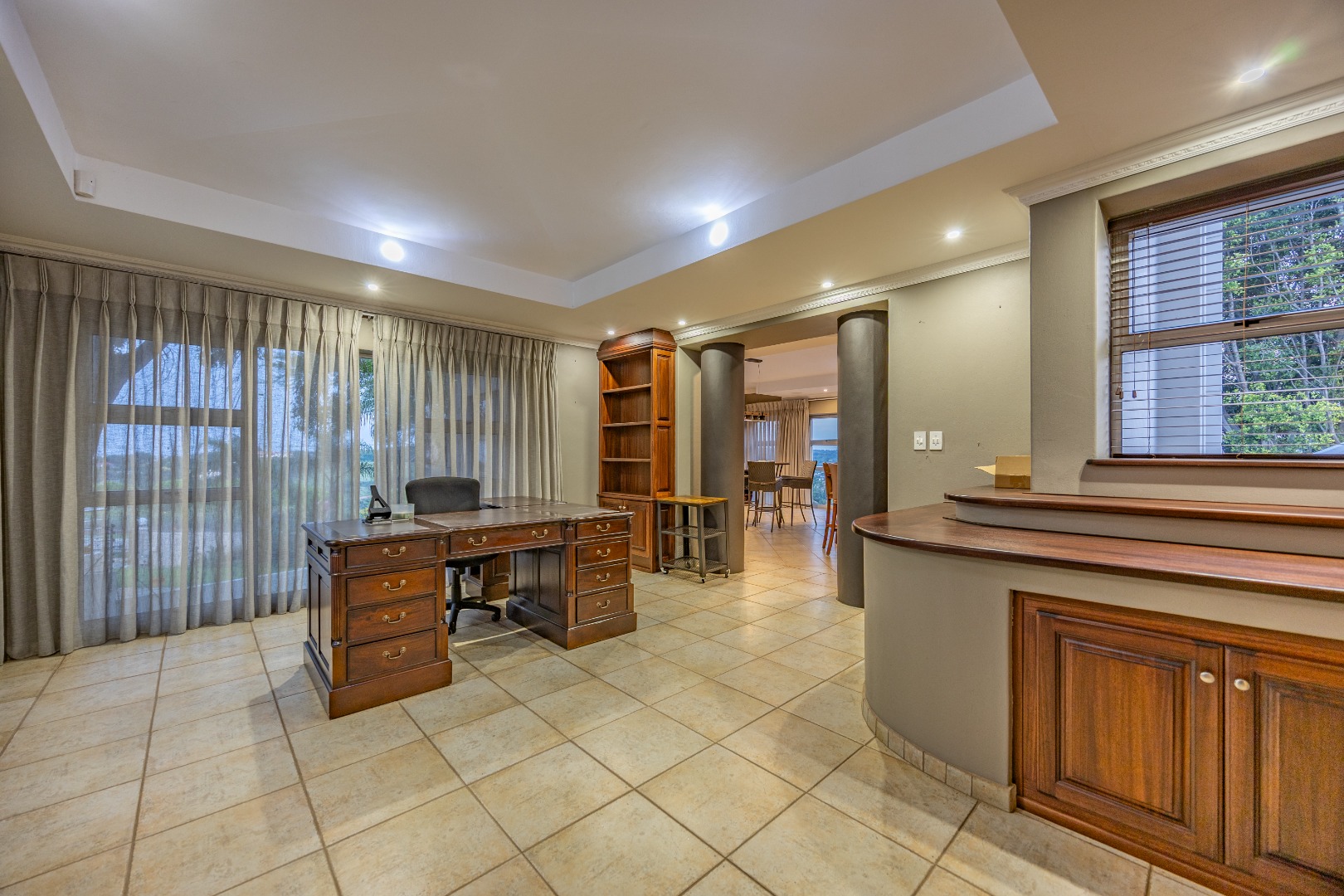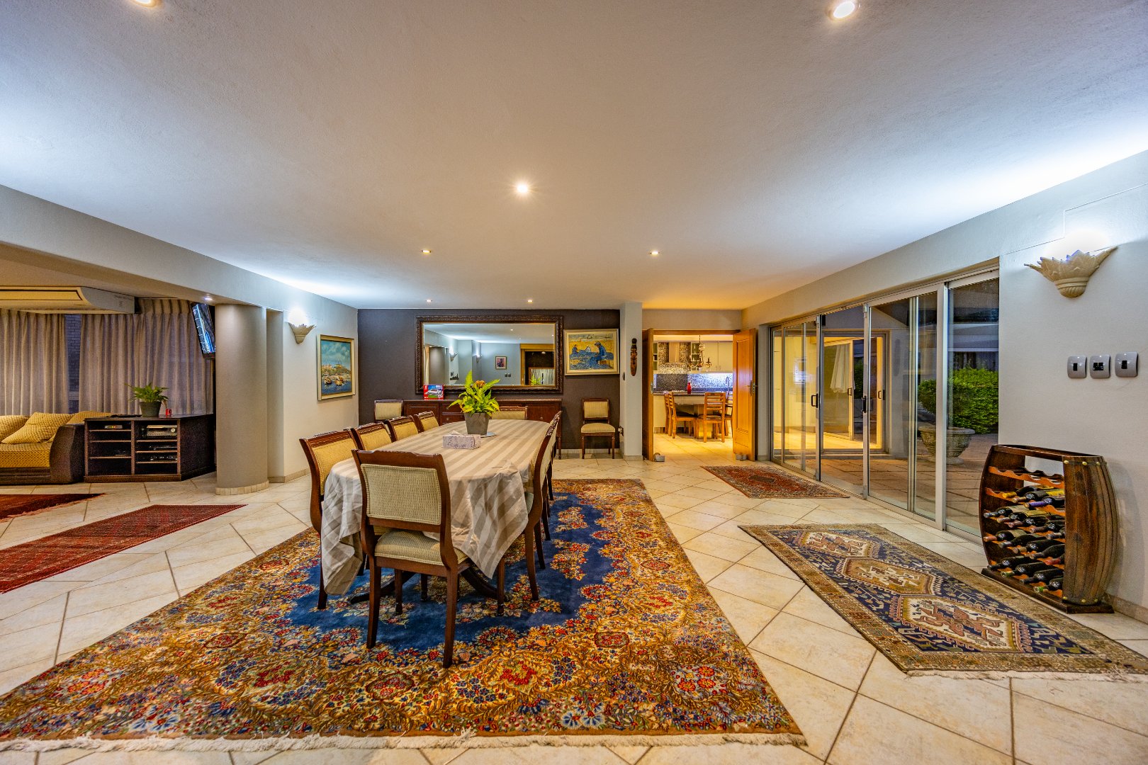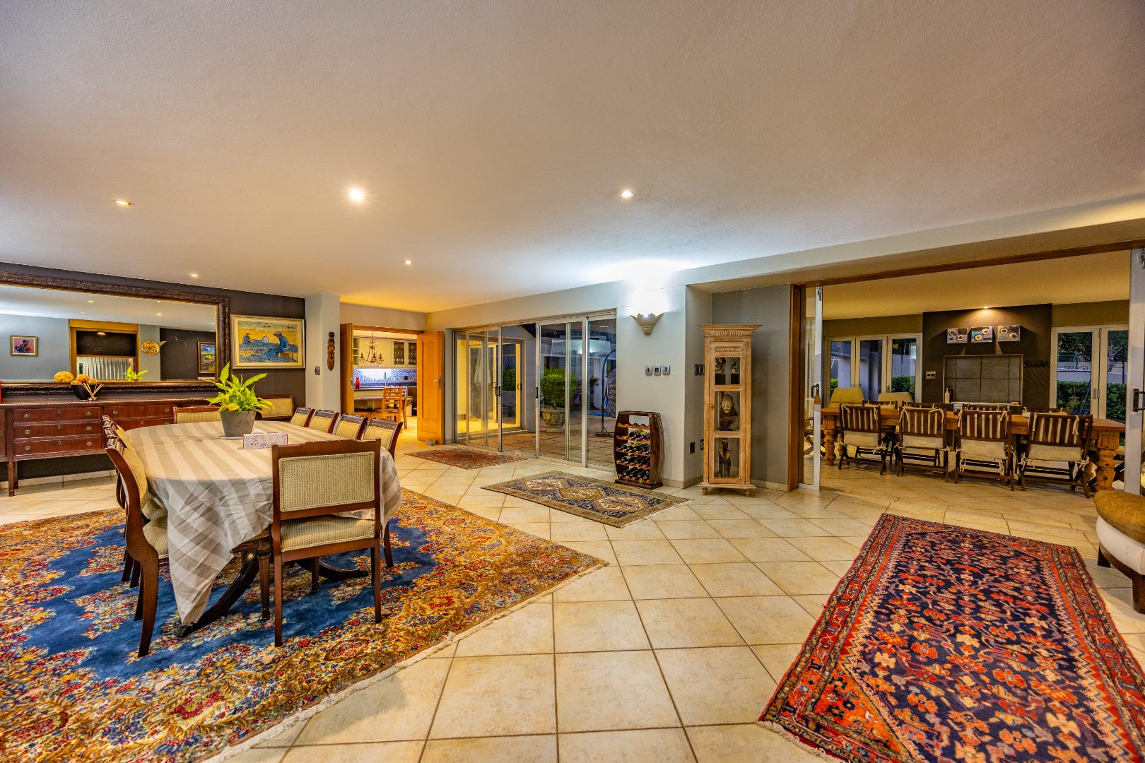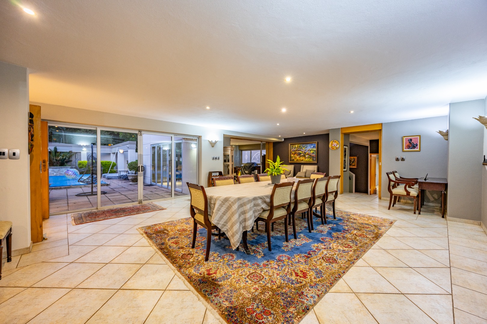 This expansive Waterkloof Ridge residence is designed for effortless living and entertaining on a grand scale. A welcoming entrance hall leads into multiple living areas including a TV room with surround sound, air-conditioning, a private study, and a fully fitted bar. The dining room flows seamlessly into a covered entertainment area with a gas braai and stack doors, creating a perfect indoor–outdoor lifestyle. Generous proportions, clean lines, and quality finishes set the tone throughout.