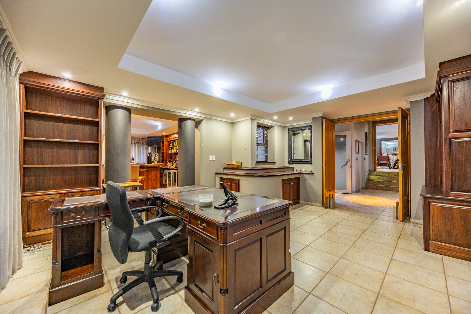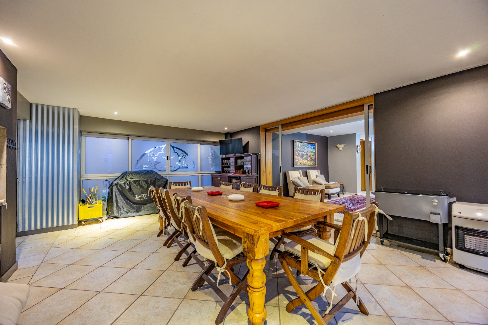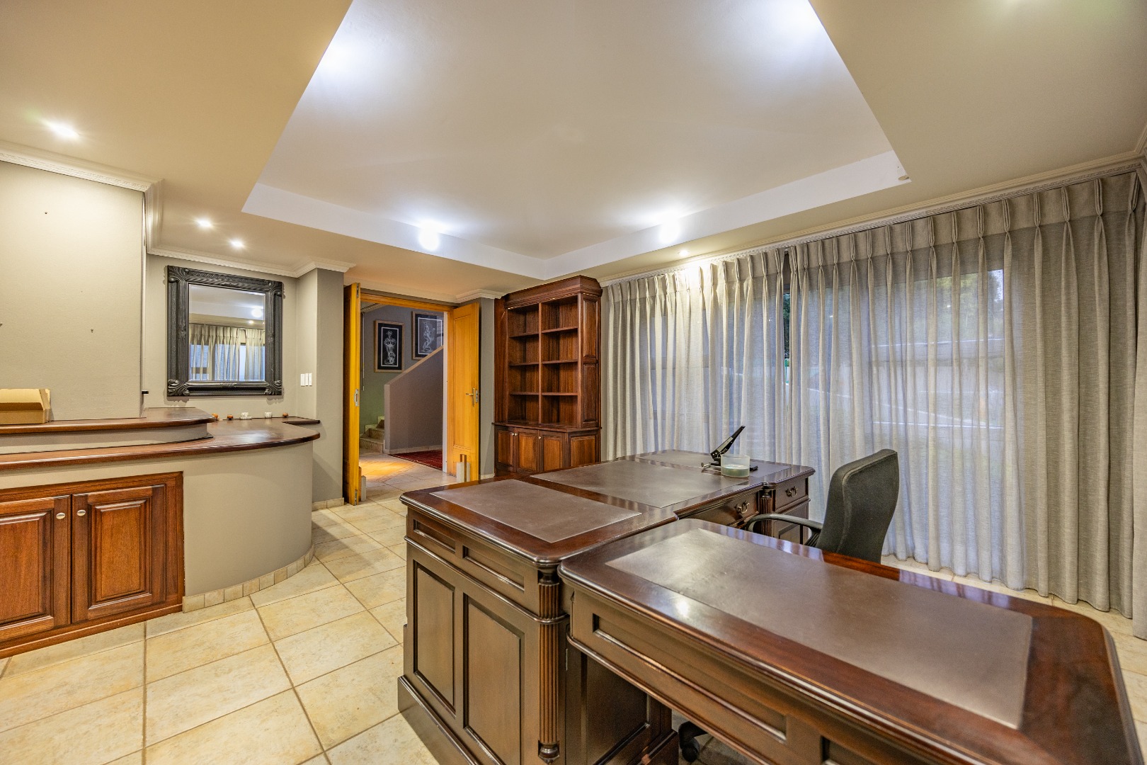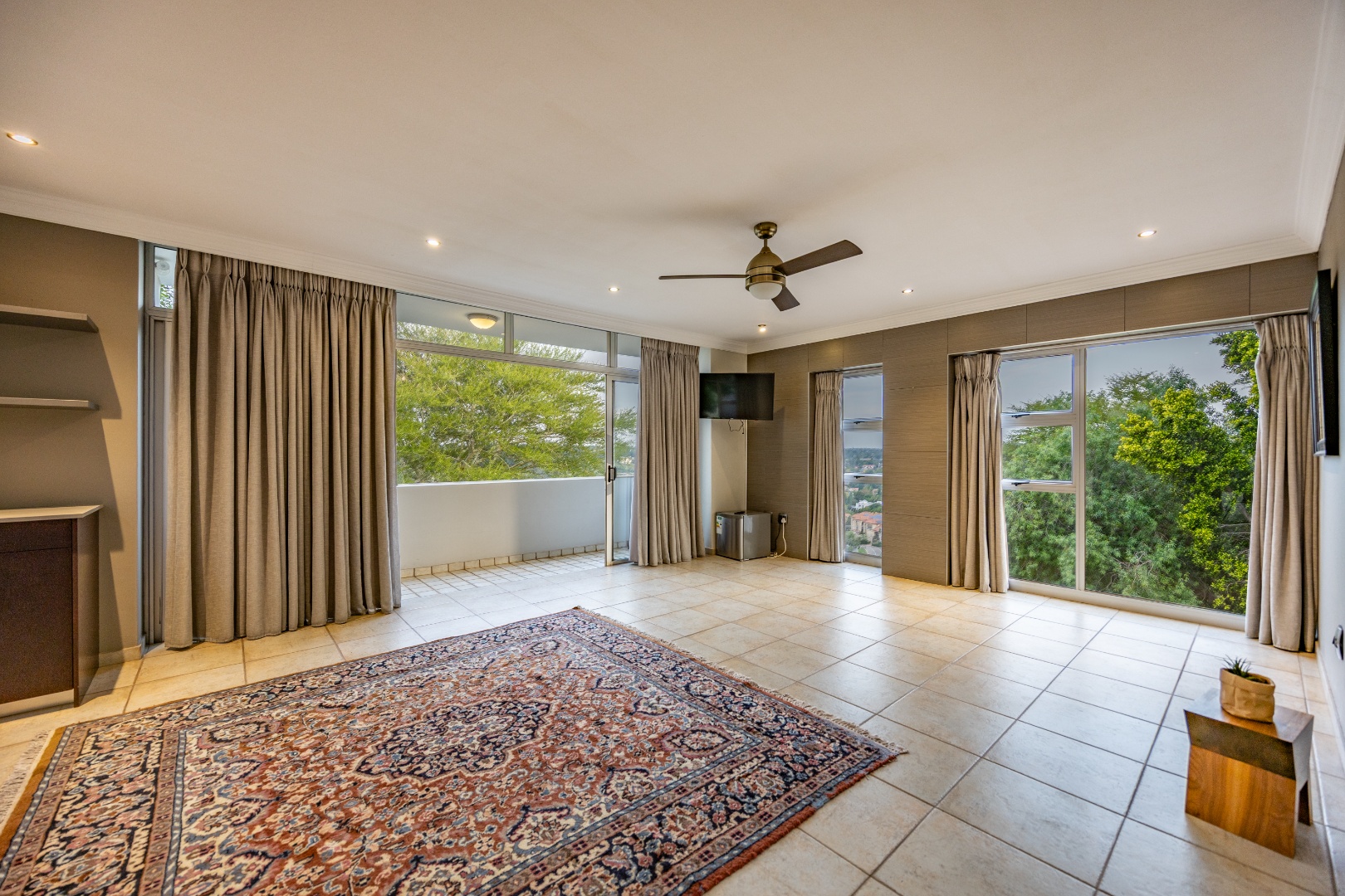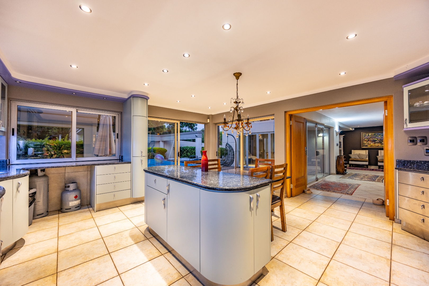 This expansive Waterkloof Ridge residence is designed for effortless living and entertaining on a grand scale. A welcoming entrance hall leads into multiple living areas including a TV room with surround sound, air-conditioning, a private study, and a fully fitted bar. The dining room flows seamlessly into a covered entertainment area with a gas braai and stack doors, creating a perfect indoor–outdoor lifestyle. Generous proportions, clean lines, and quality finishes set the tone throughout.