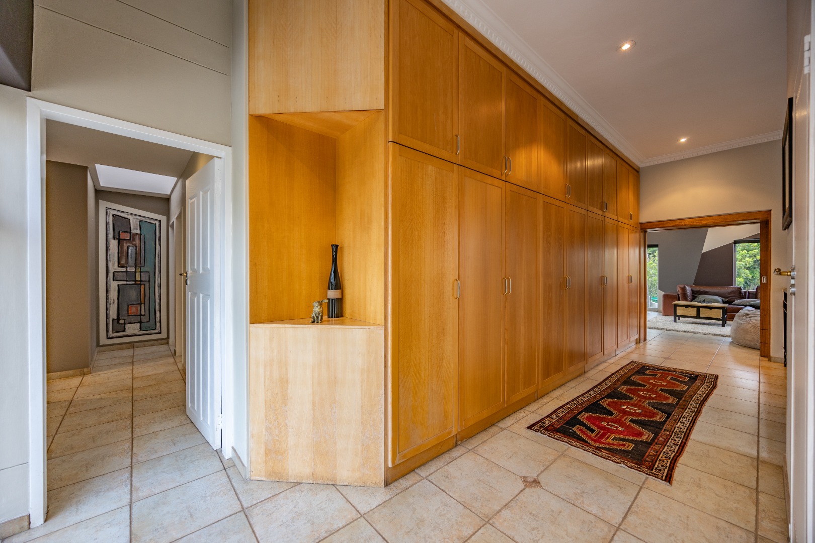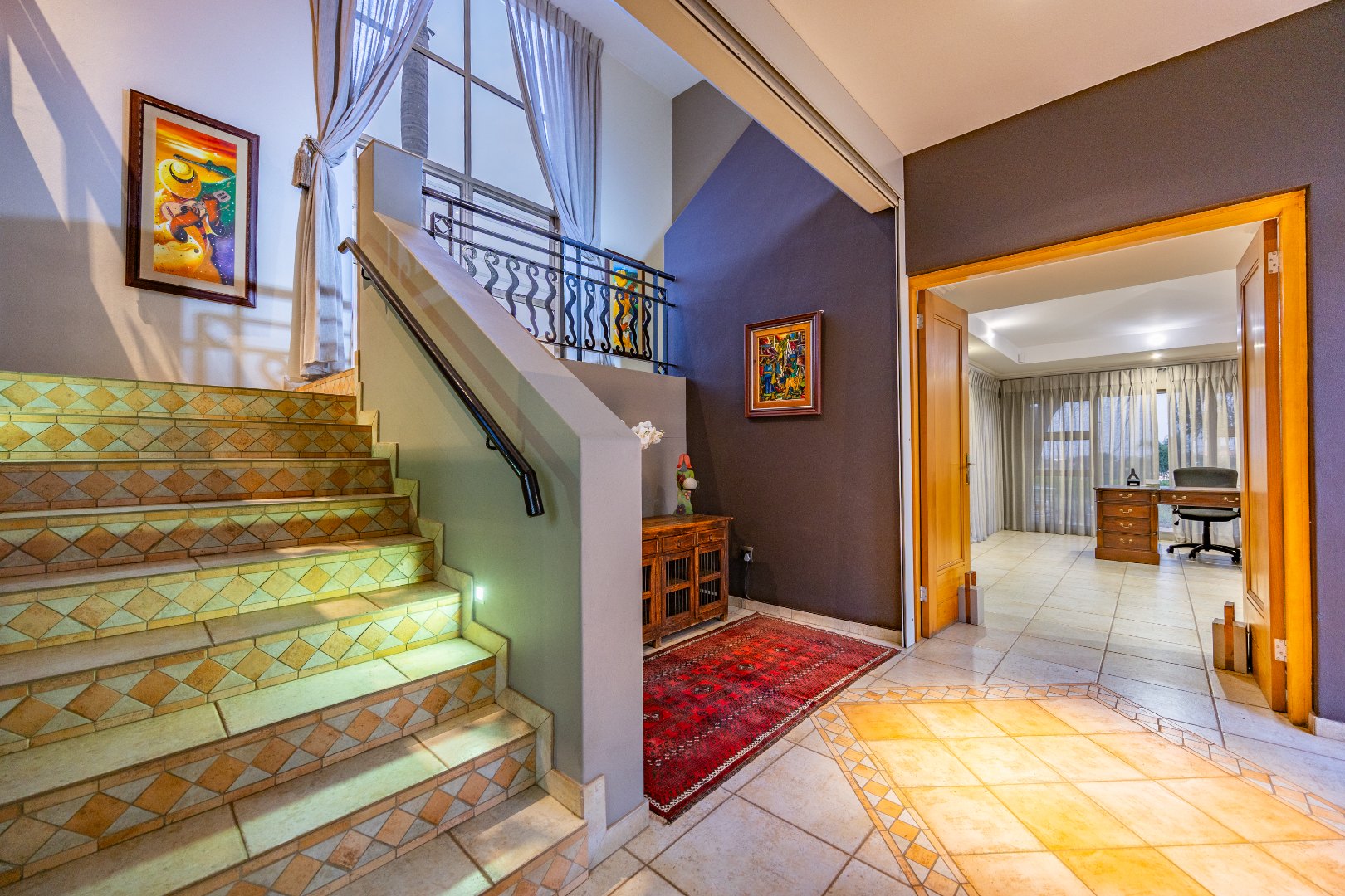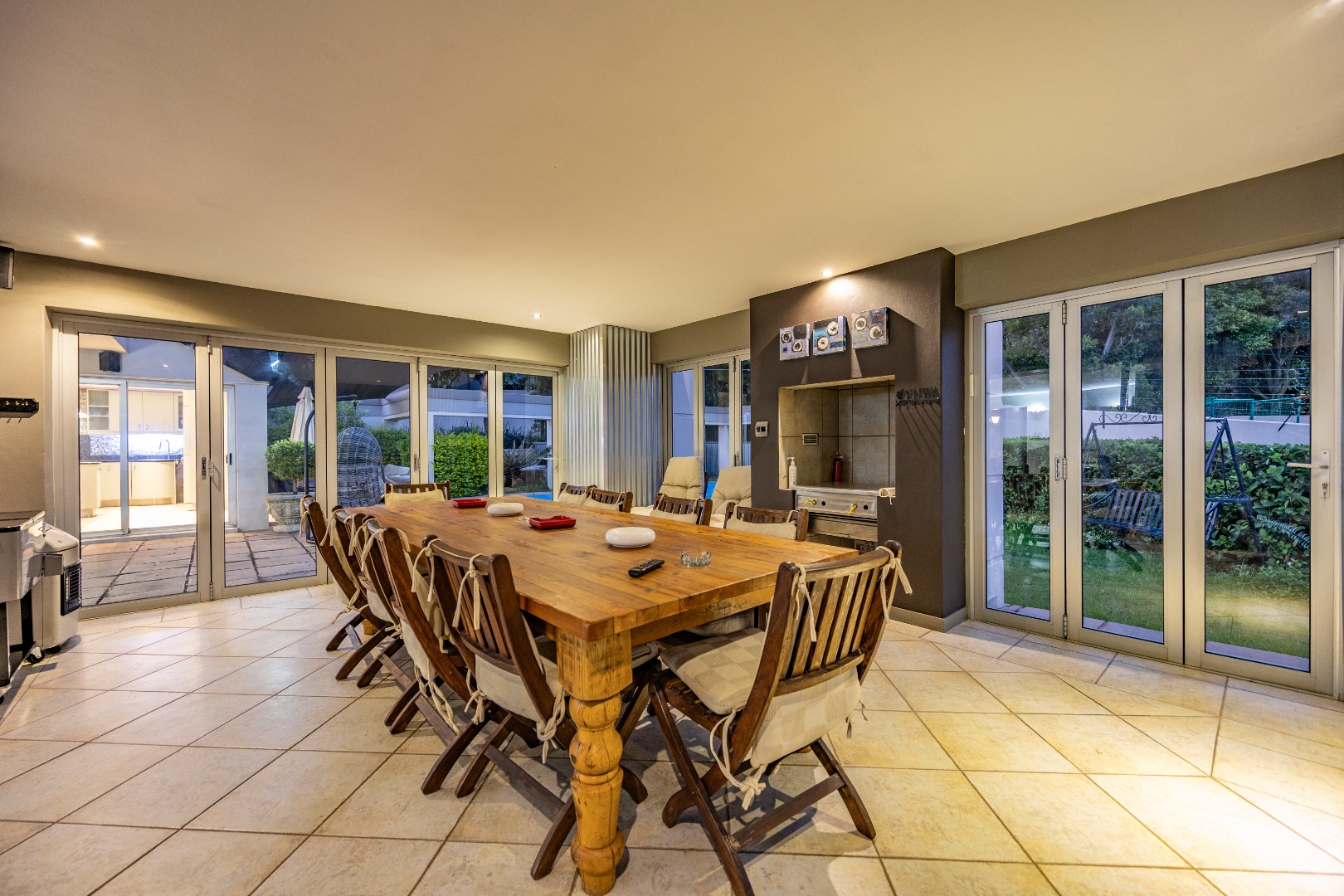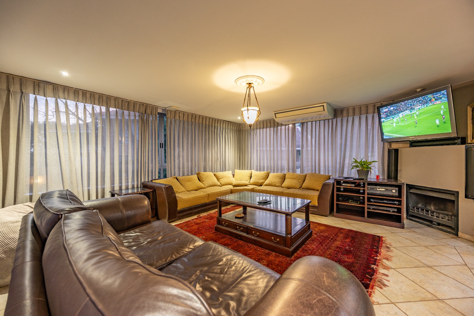 This expansive Waterkloof Ridge residence is designed for effortless living and entertaining on a grand scale. A welcoming entrance hall leads into multiple living areas including a TV room with surround sound, air-conditioning, a private study, and a fully fitted bar. The dining room flows seamlessly into a covered entertainment area with a gas braai and stack doors, creating a perfect indoor–outdoor lifestyle. Generous proportions, clean lines, and quality finishes set the tone throughout.