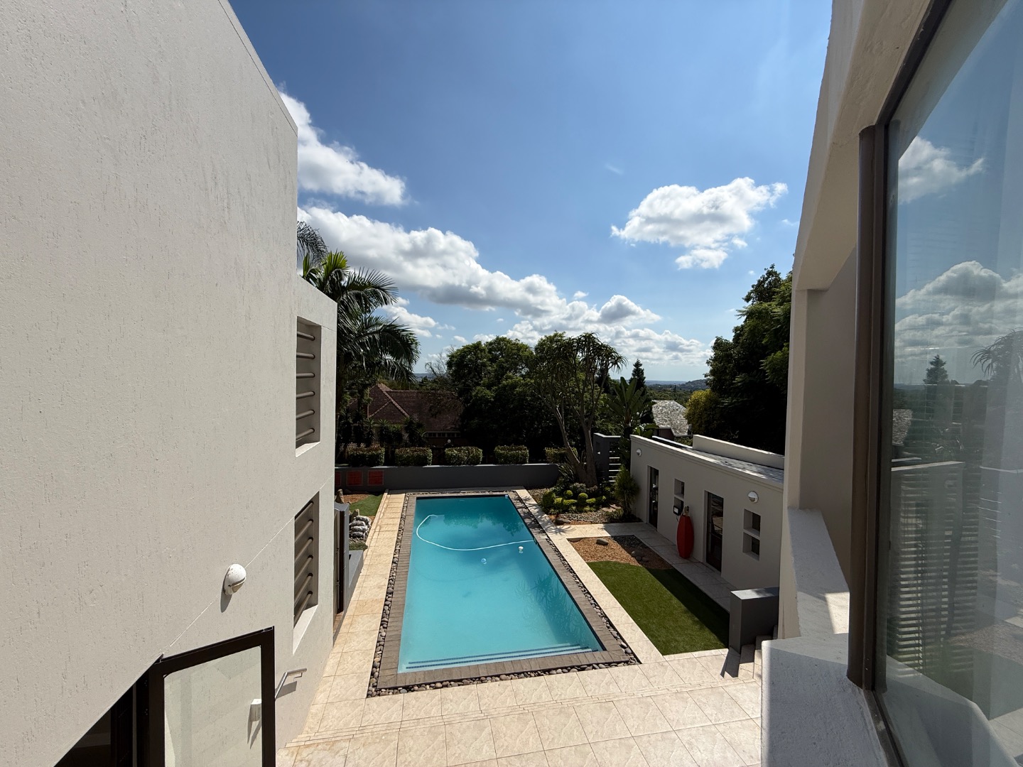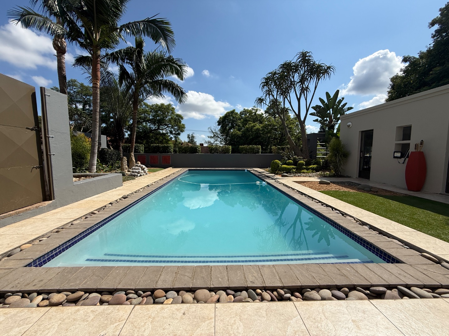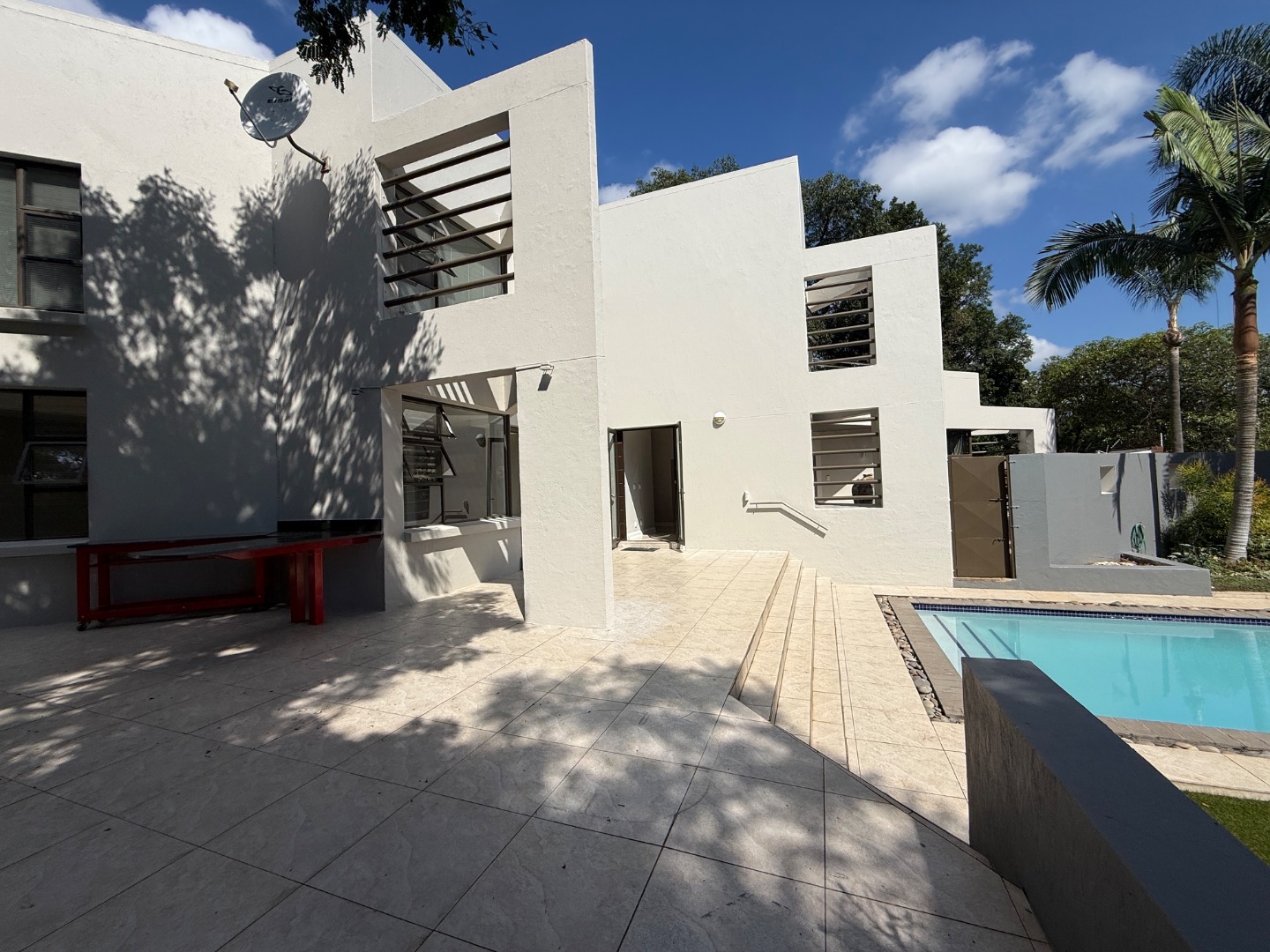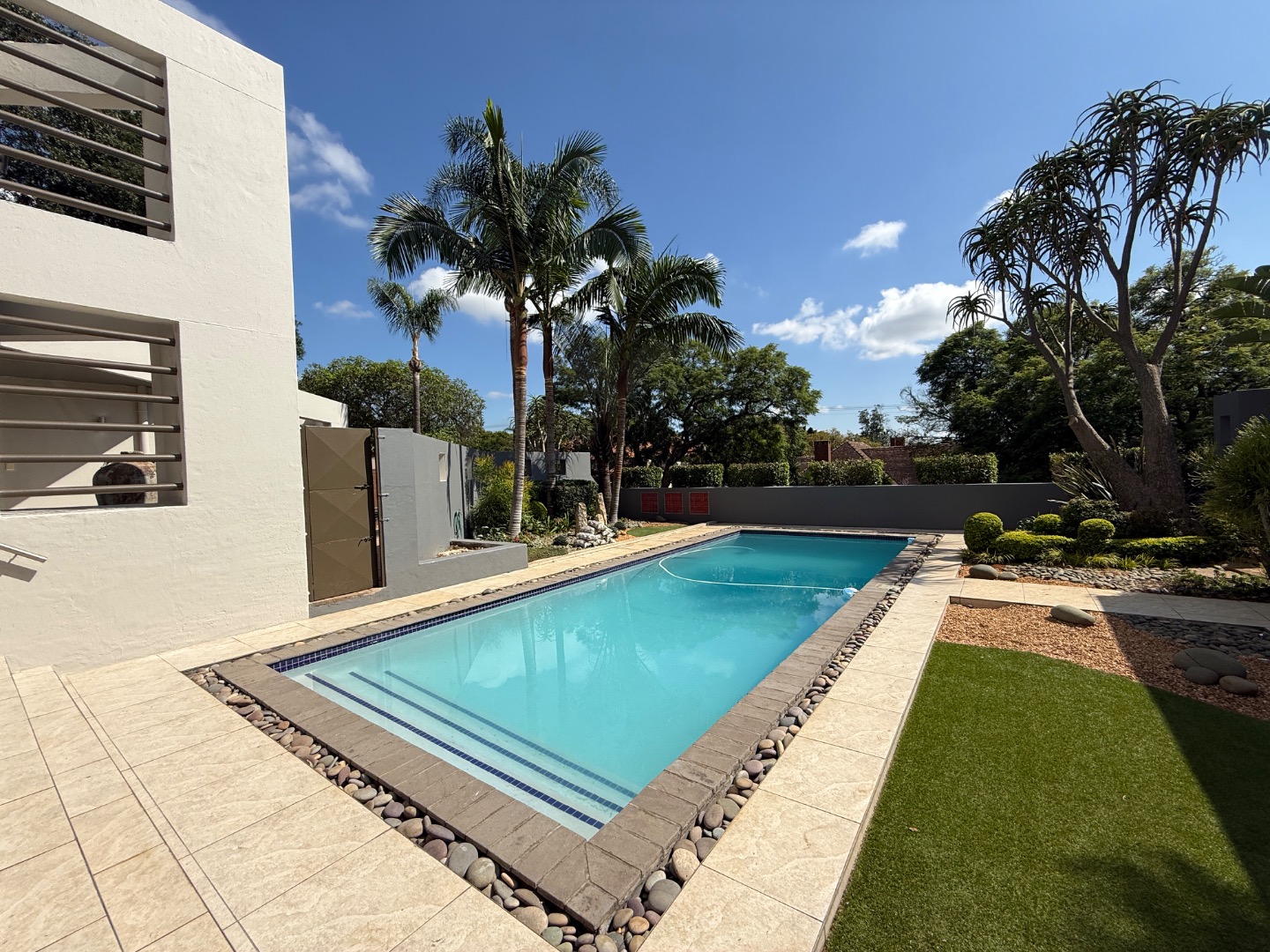 Accommodation includes four generously sized bedrooms and three modern bathrooms, one en-suite. Practical amenities further enhance the living experience, with dedicated staff quarters, domestic rooms, a separate laundry area, and ample storage.
