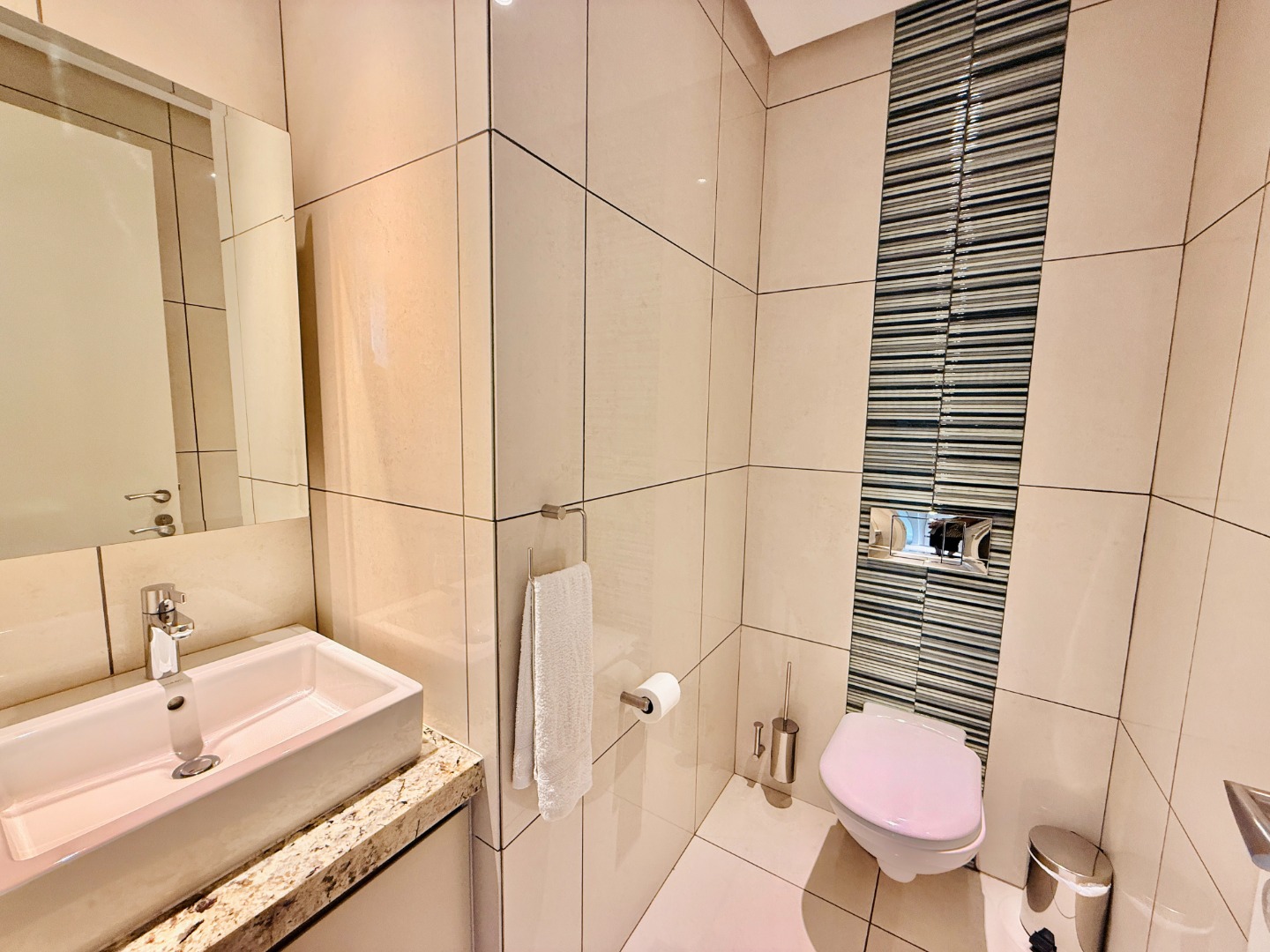 The gourmet kitchen is generously proportioned and thoughtfully designed, featuring integrated high-end appliances, a dedicated pantry, and extensive cupboard space — perfectly balancing luxury and functionality. A stylish guest toilet is conveniently positioned near the living areas, ideal for hosting.