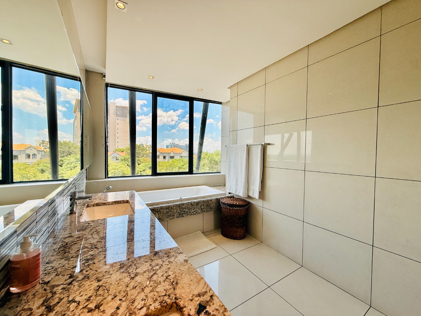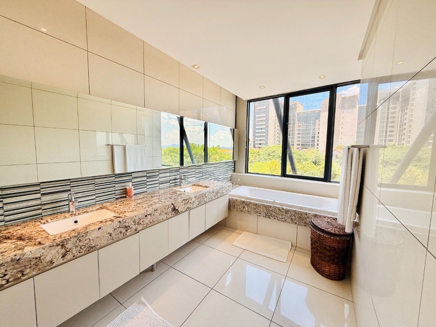 Both bedrooms are luxurious ensuite retreats, offering generous proportions, ample built-in cupboards, and newly installed modern laminated flooring, adding warmth and a contemporary finish to the private spaces. The master suite is a sanctuary of comfort, complete with a lavish full bathroom featuring a soaking bathtub, walk-in shower, double vanity, and large windows that invite abundant natural light. The second bedroom is equally well-appointed, with its own ensuite bathroom fitted with a modern shower and excellent natural light.
