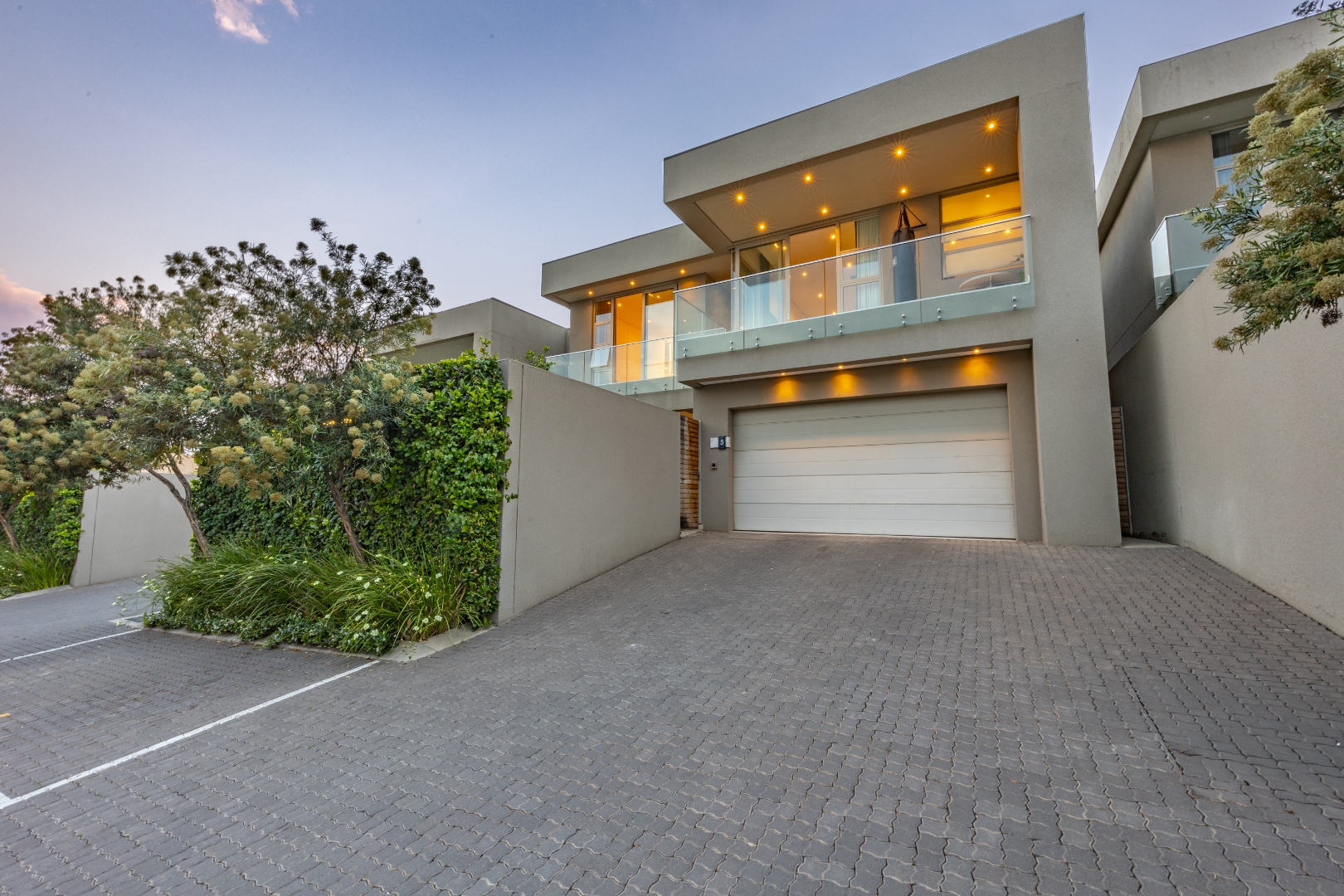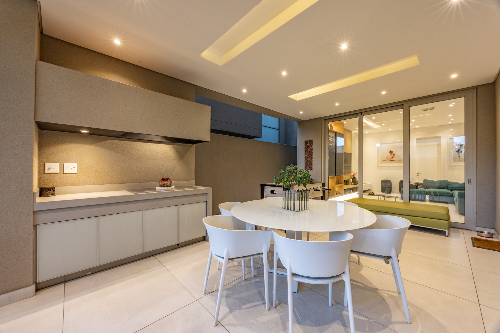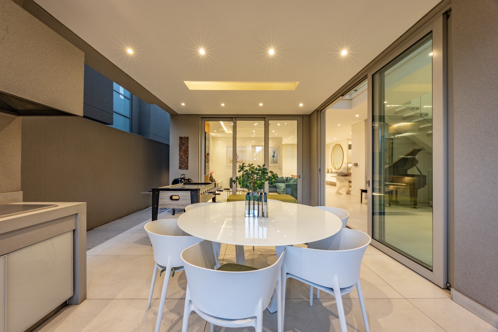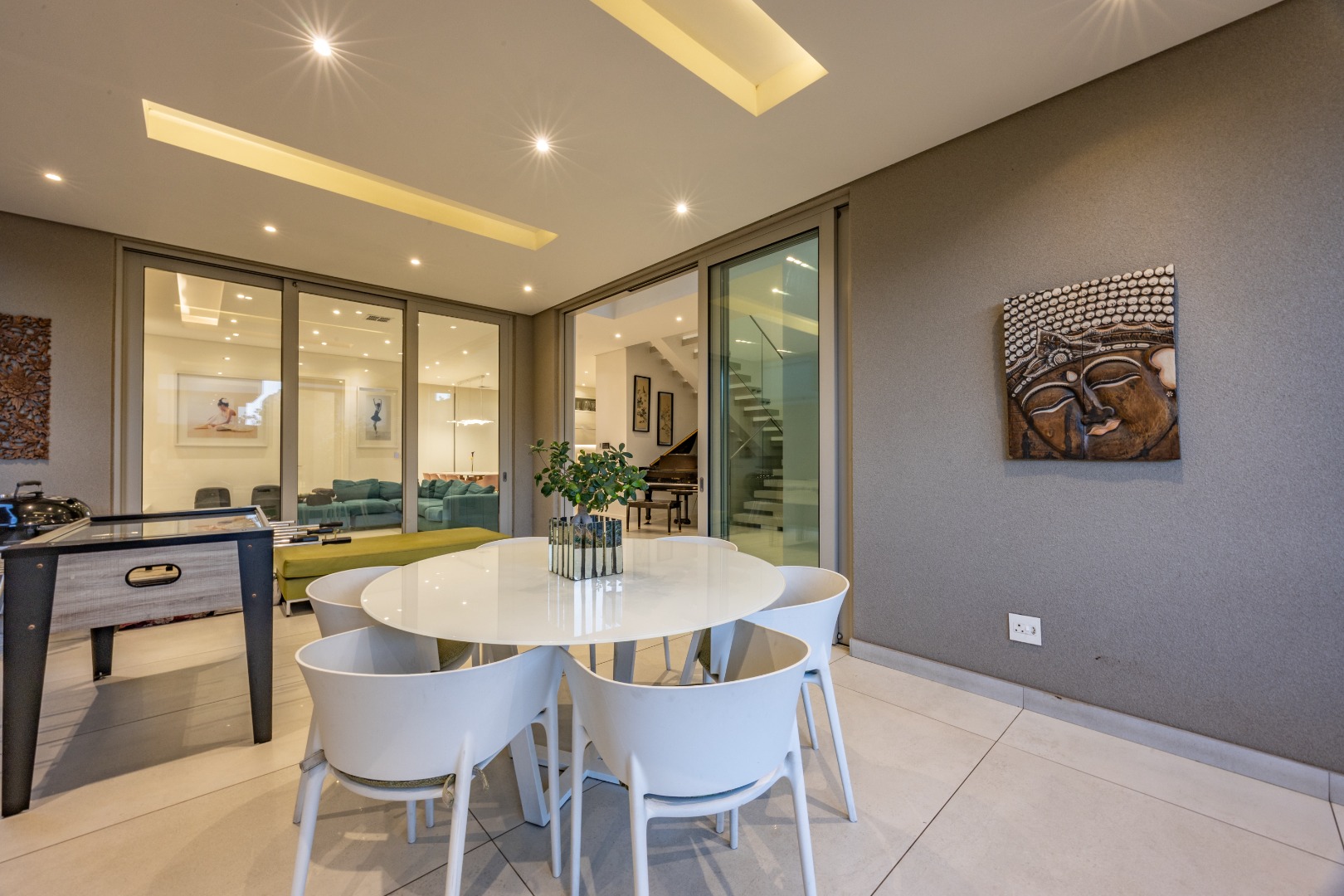 From the moment you step through the grand double-volume entrance hall, you are welcomed by natural light cascading through architecturally placed skylights, highlighting the home’s clean lines and striking floating staircase. The expansive open-plan living and dining areas exude both warmth and grandeur, beautifully furnished with contemporary pieces that balance style and comfort. Expansive glass sliding doors open onto a covered entertainer’s patio with a built-in braai, overlooking a lush private garden, perfect for hosting elegant gatherings or enjoying serene afternoons at home.