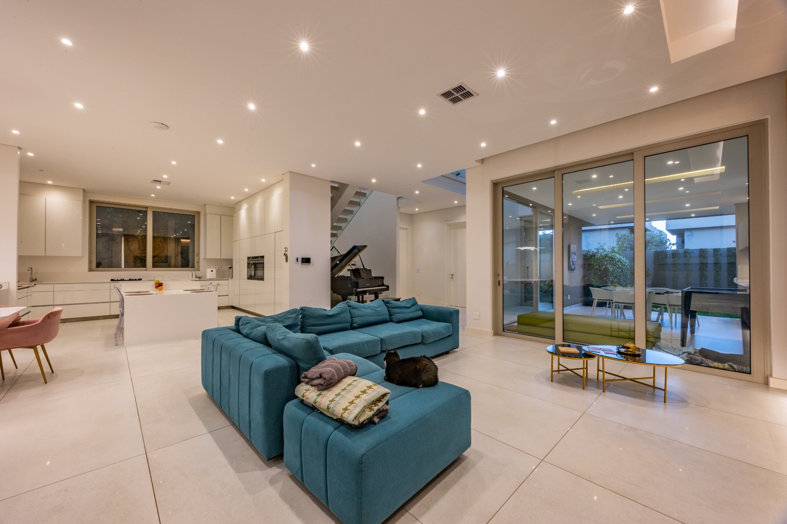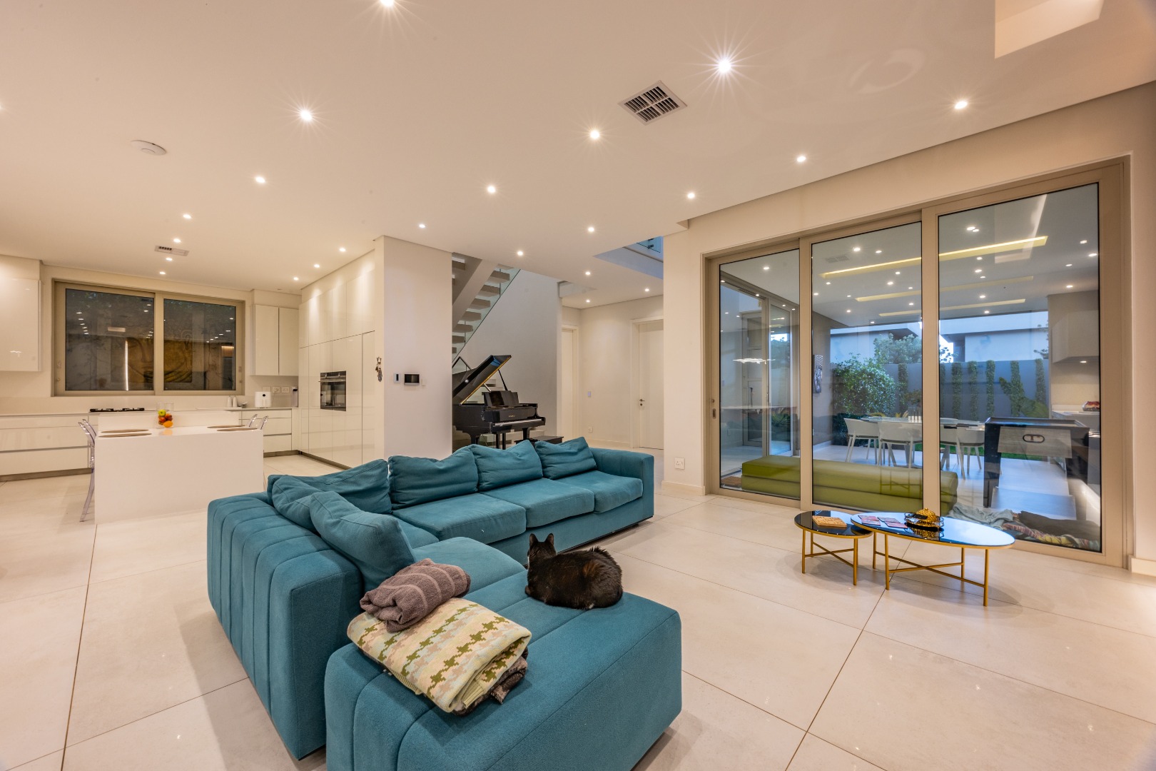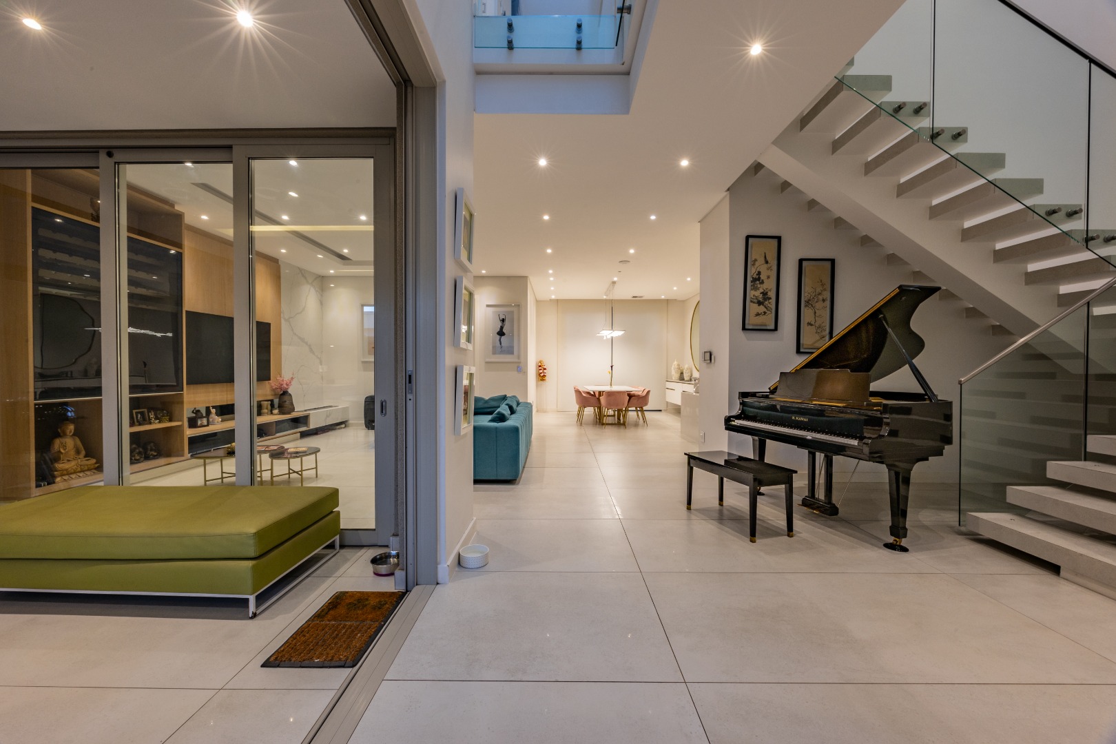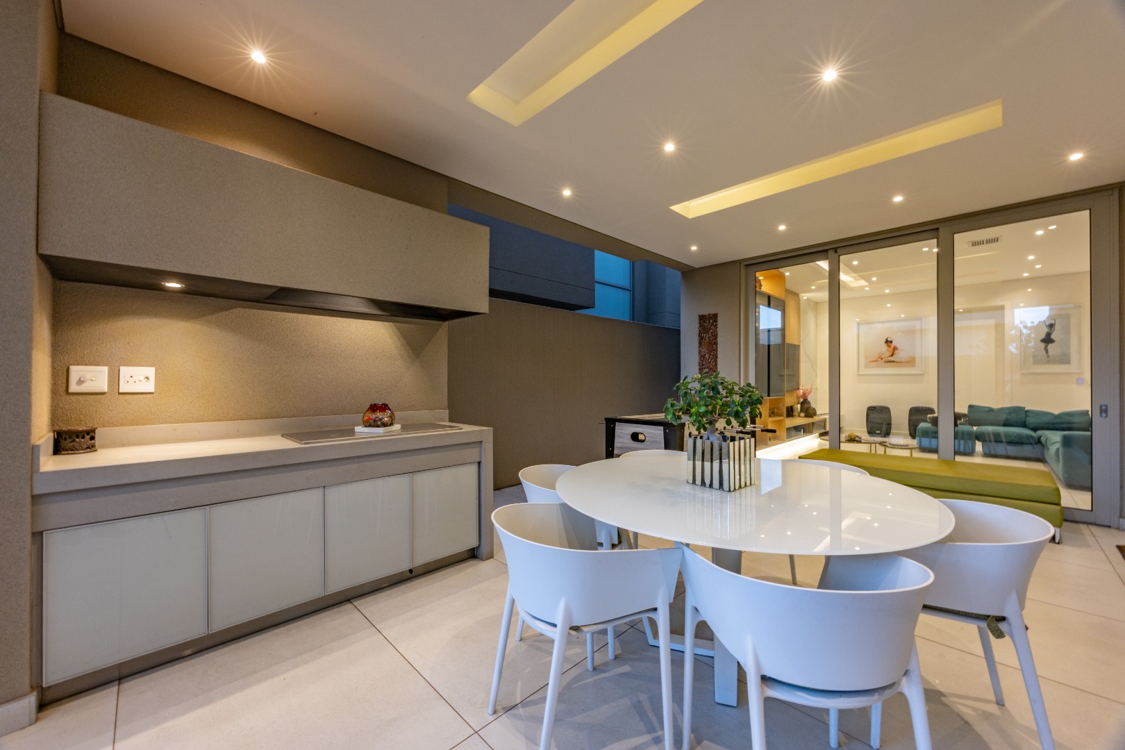 From the moment you step through the grand double-volume entrance hall, you are welcomed by natural light cascading through architecturally placed skylights, highlighting the home’s clean lines and striking floating staircase. The expansive open-plan living and dining areas exude both warmth and grandeur, beautifully furnished with contemporary pieces that balance style and comfort. Expansive glass sliding doors open onto a covered entertainer’s patio with a built-in braai, overlooking a lush private garden, perfect for hosting elegant gatherings or enjoying serene afternoons at home.