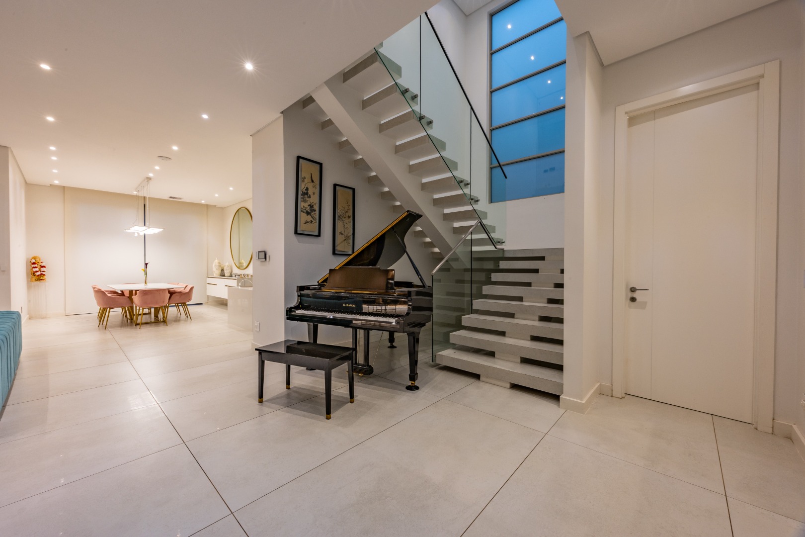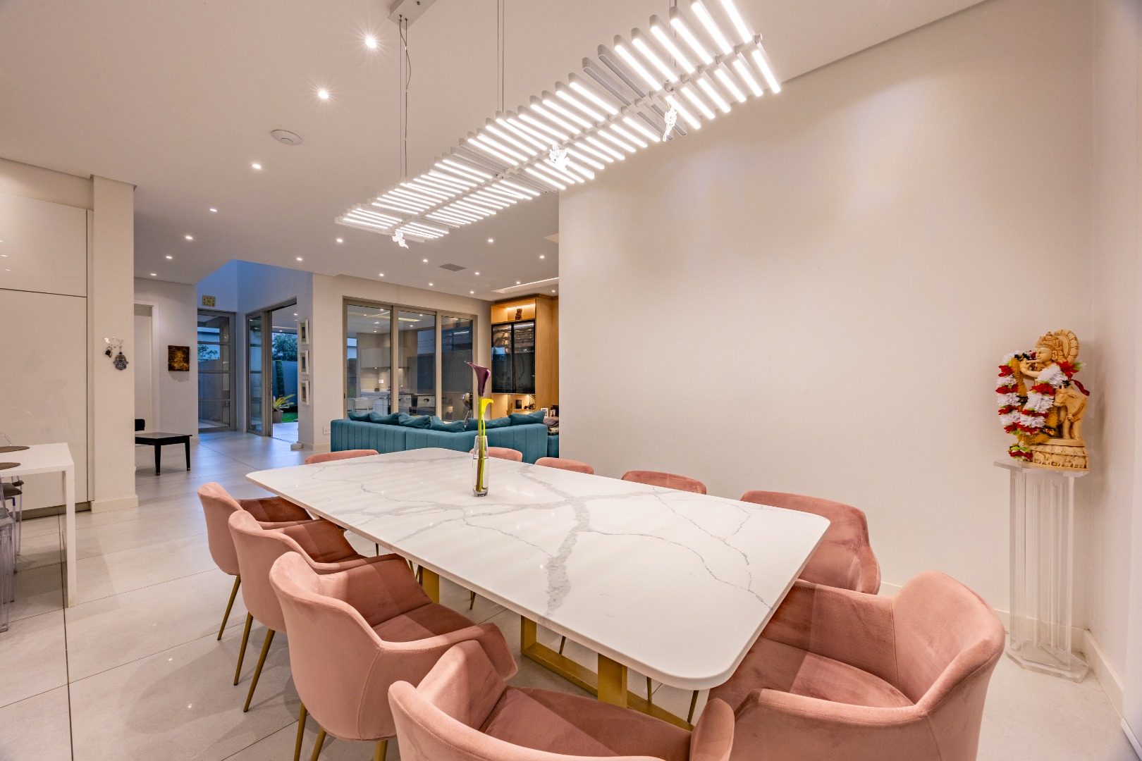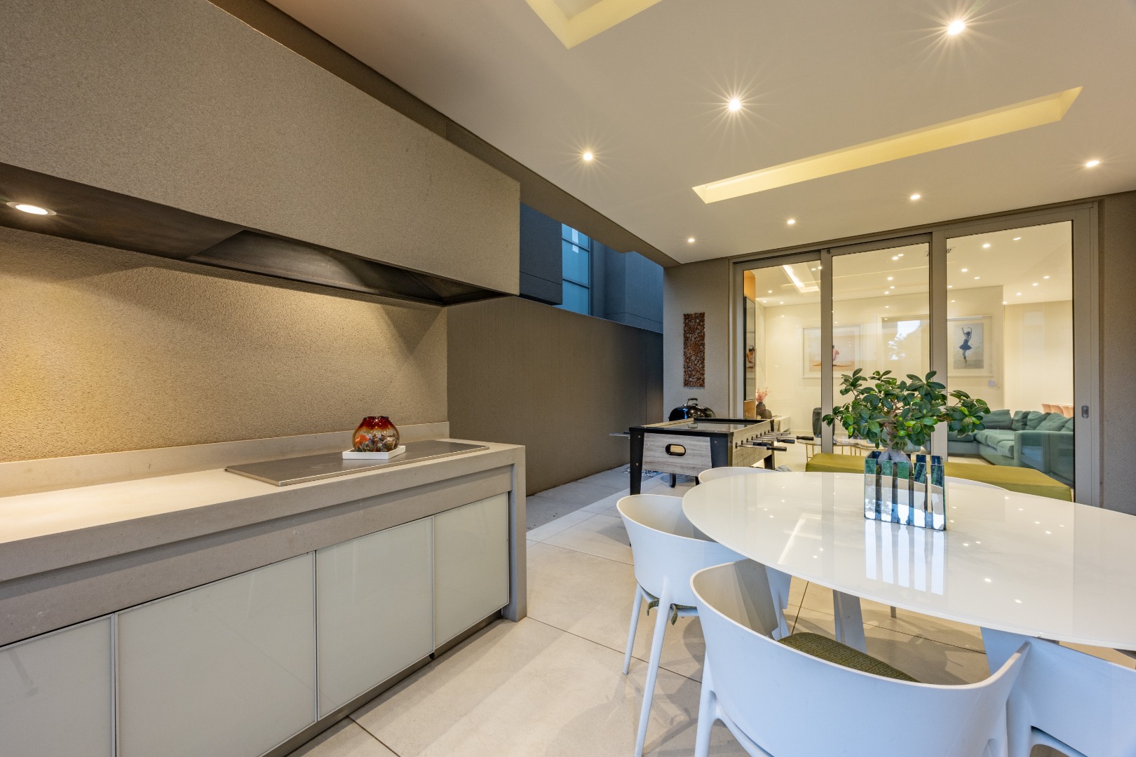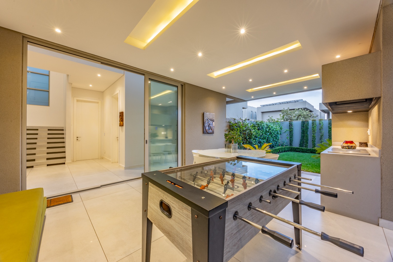 From the moment you step through the grand double-volume entrance hall, you are welcomed by natural light cascading through architecturally placed skylights, highlighting the home’s clean lines and striking floating staircase. The expansive open-plan living and dining areas exude both warmth and grandeur, beautifully furnished with contemporary pieces that balance style and comfort. Expansive glass sliding doors open onto a covered entertainer’s patio with a built-in braai, overlooking a lush private garden, perfect for hosting elegant gatherings or enjoying serene afternoons at home.