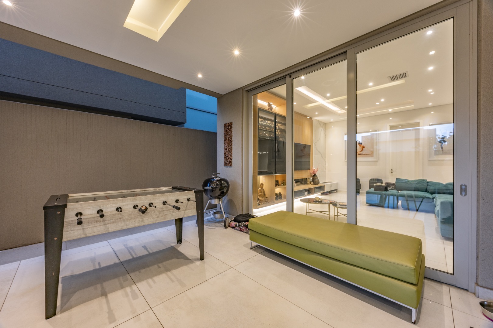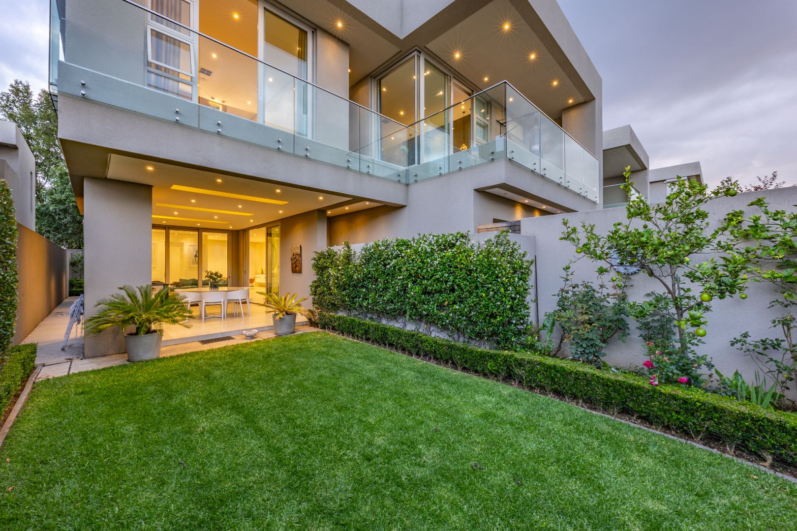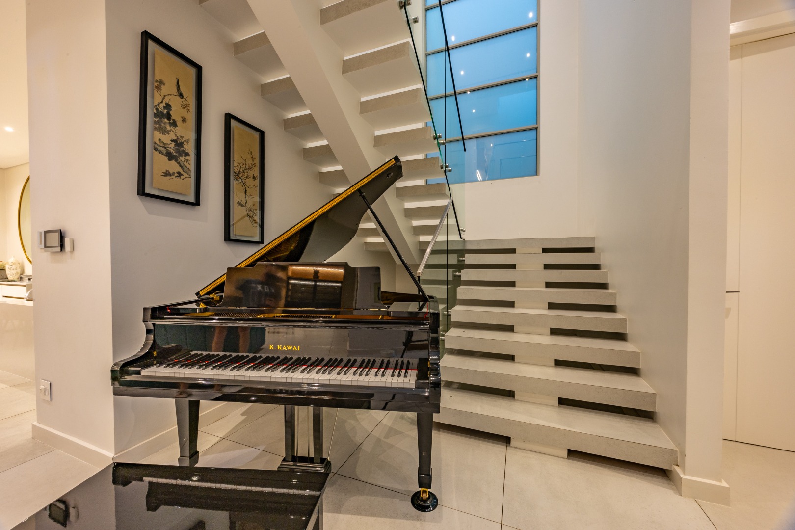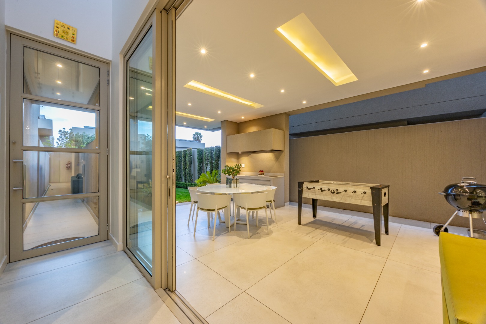 From the moment you step through the grand double-volume entrance hall, you are welcomed by natural light cascading through architecturally placed skylights, highlighting the home’s clean lines and striking floating staircase. The expansive open-plan living and dining areas exude both warmth and grandeur, beautifully furnished with contemporary pieces that balance style and comfort. Expansive glass sliding doors open onto a covered entertainer’s patio with a built-in braai, overlooking a lush private garden, perfect for hosting elegant gatherings or enjoying serene afternoons at home.
