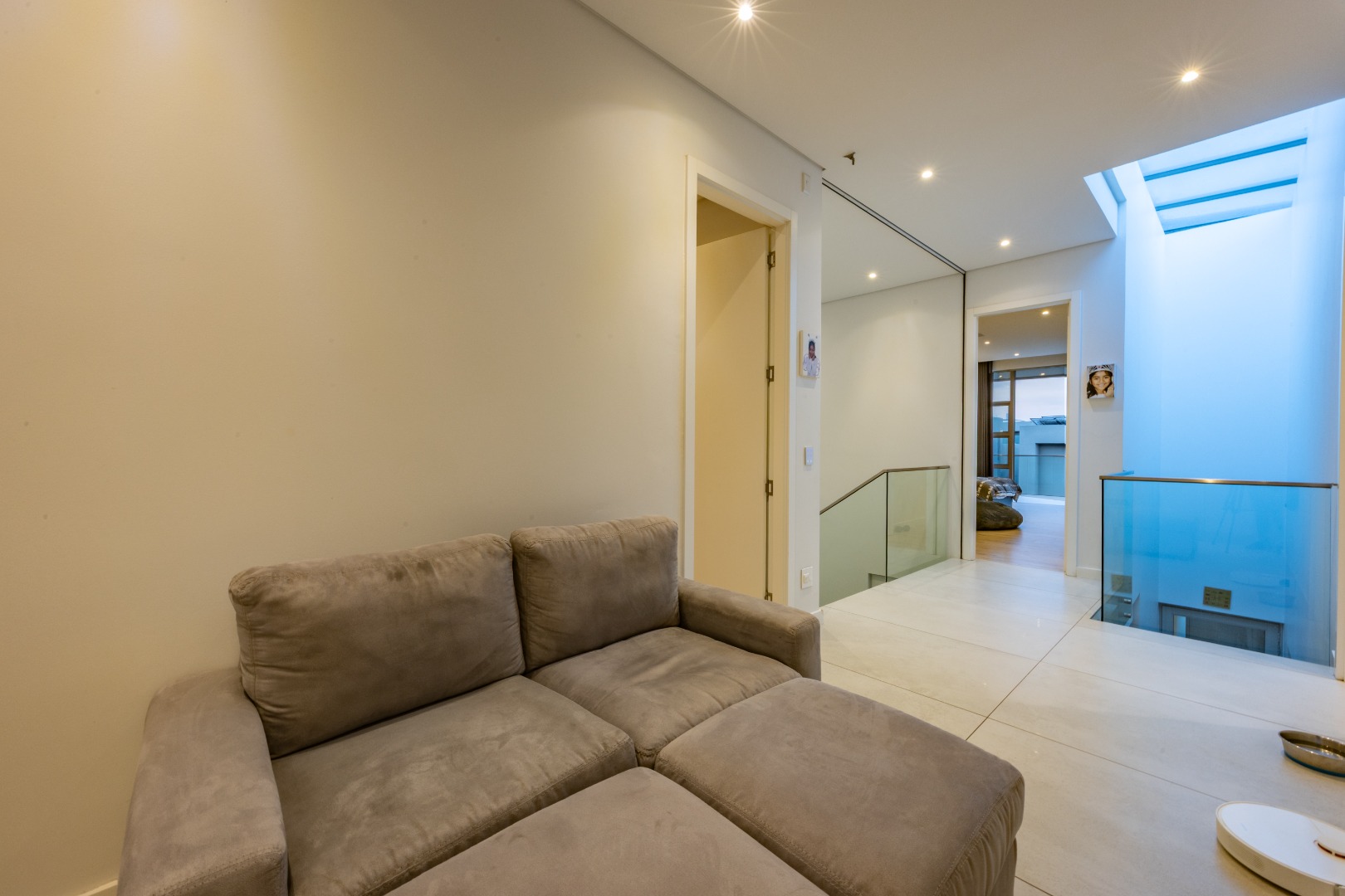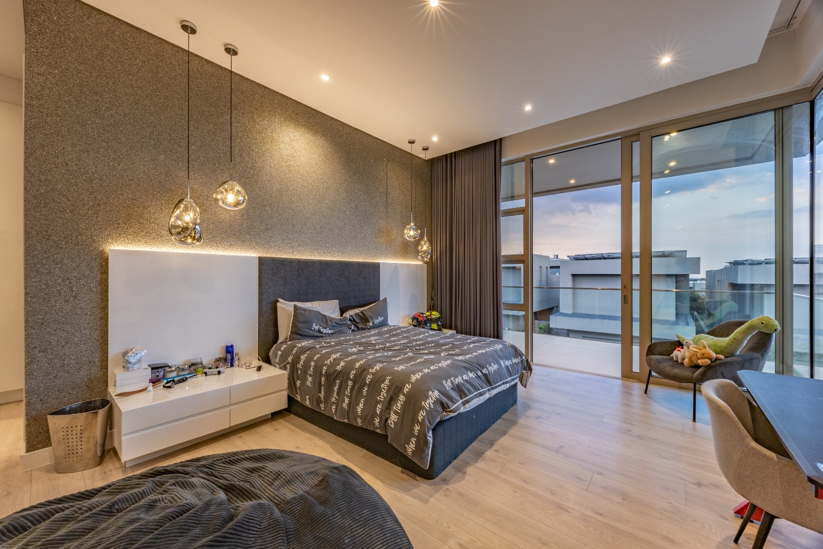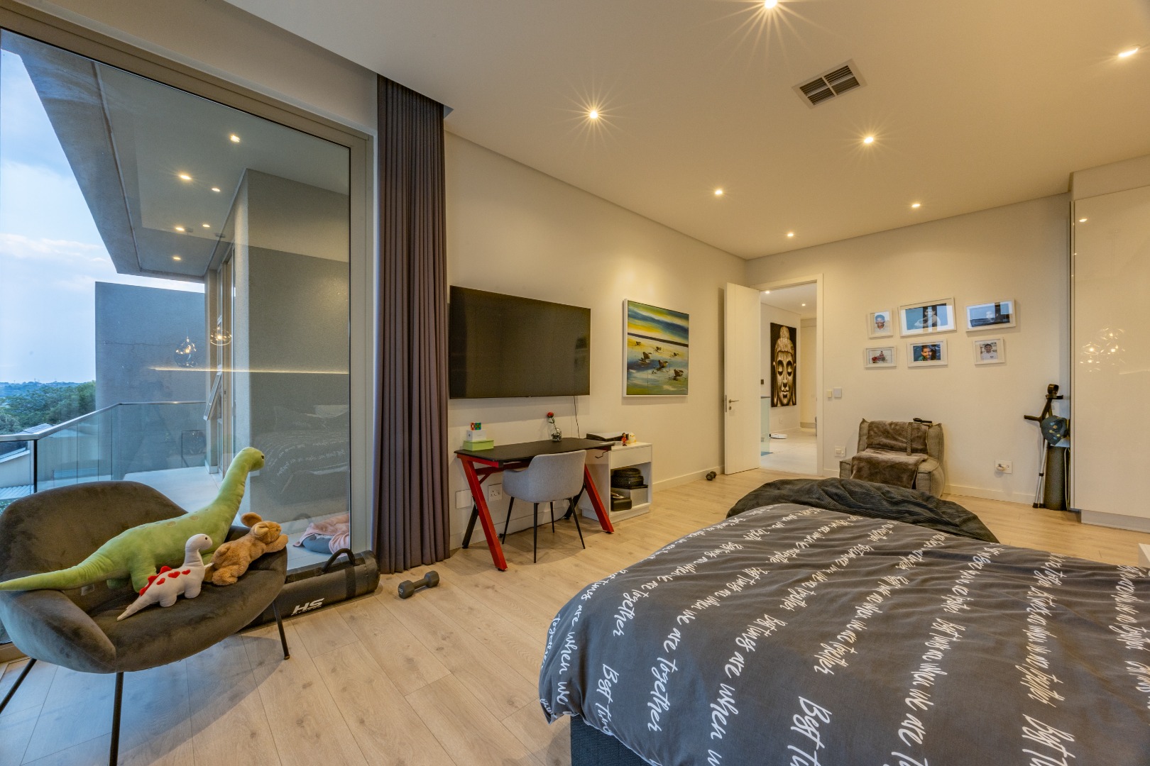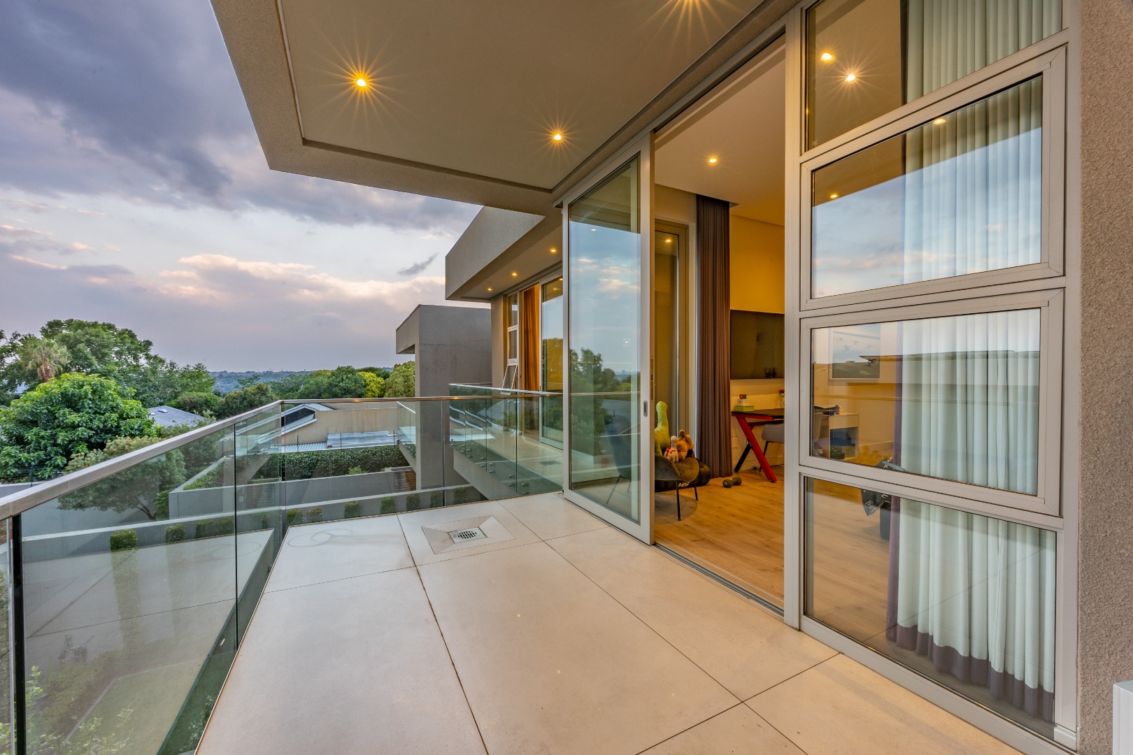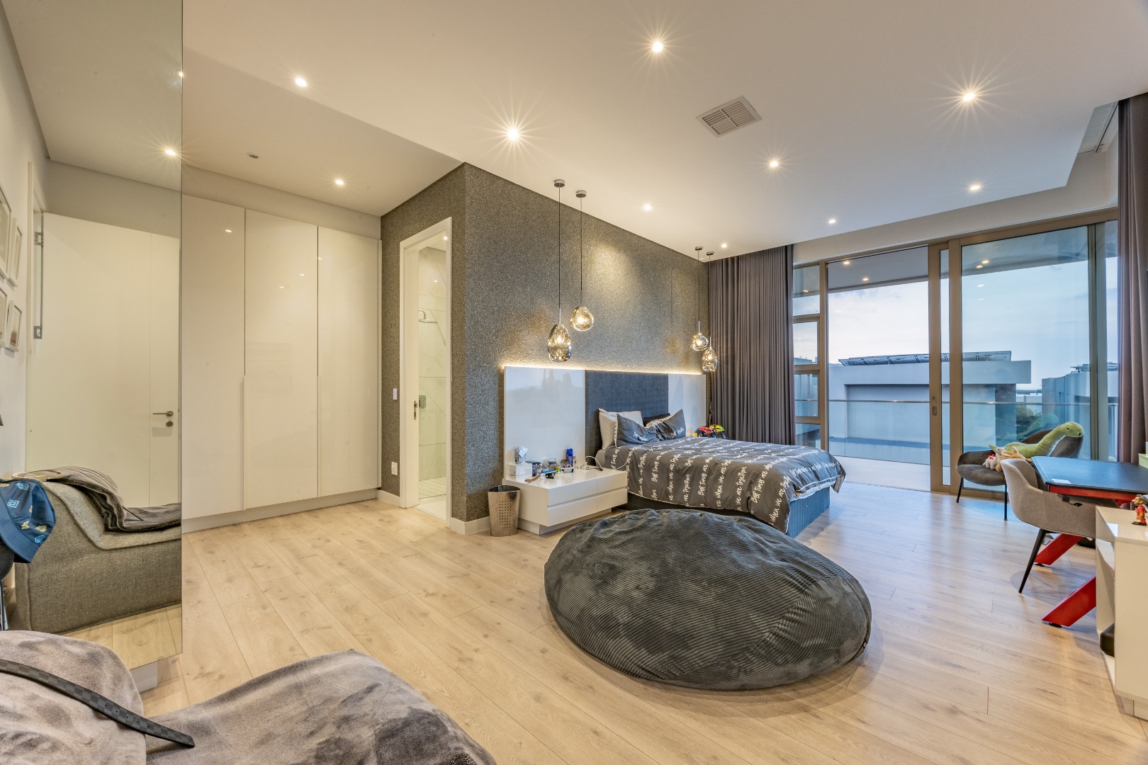 Upstairs, the luxury continues. The main bedroom suite is a true retreat, featuring a massive walk-in dressing area, an opulent full ensuite bathroom, and a private balcony framing breathtaking views of the Sandton skyline and golden sunsets. Each of the four spacious ensuite bedrooms is beautifully furnished, featuring walk-in closets, premium finishes, and abundant natural light — the result of the home’s clever design and strategically placed skylights that allow sunlight to pour in throughout the day. Two bedrooms enjoy access to expansive balconies, creating serene spaces for morning coffee or evening reflection.