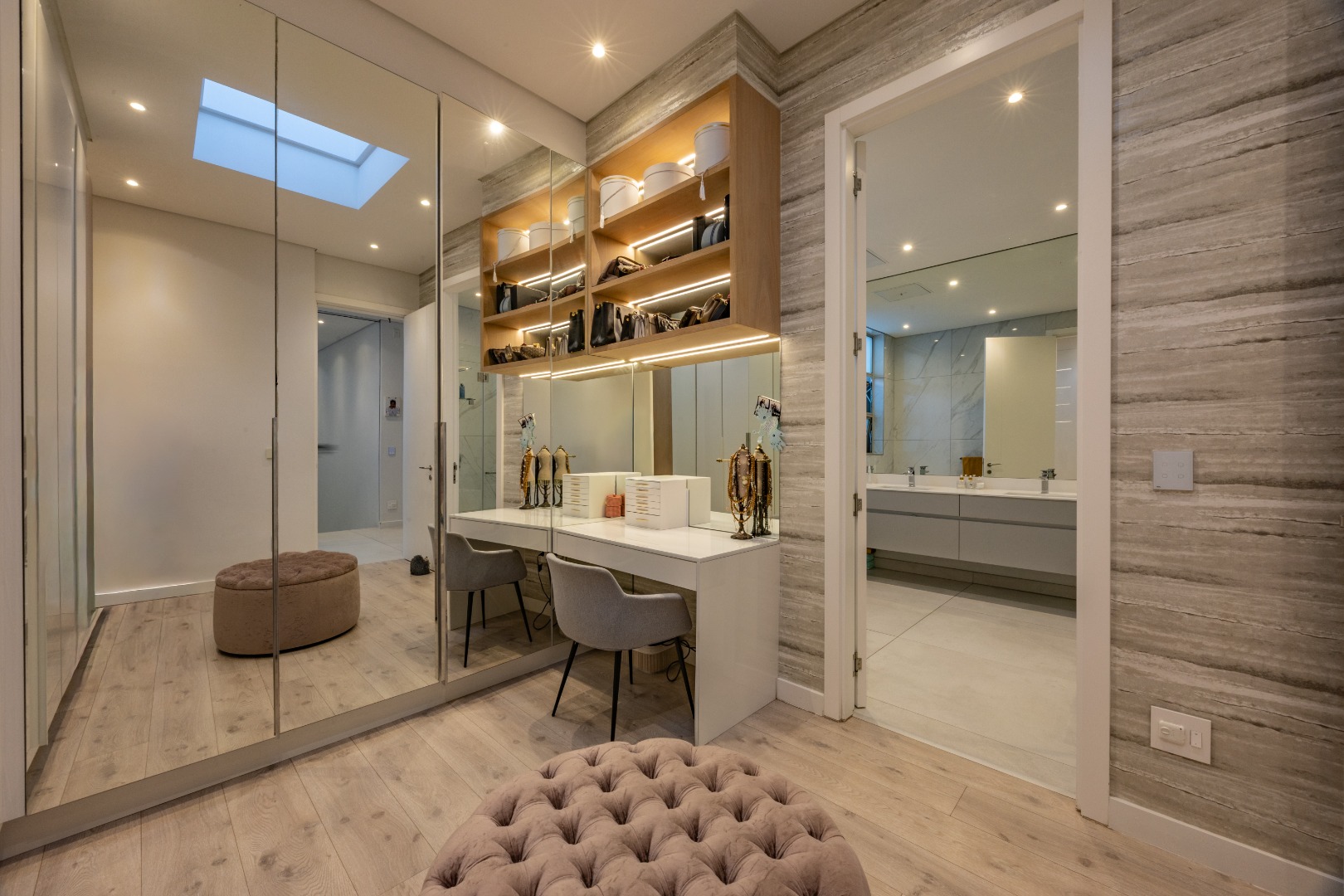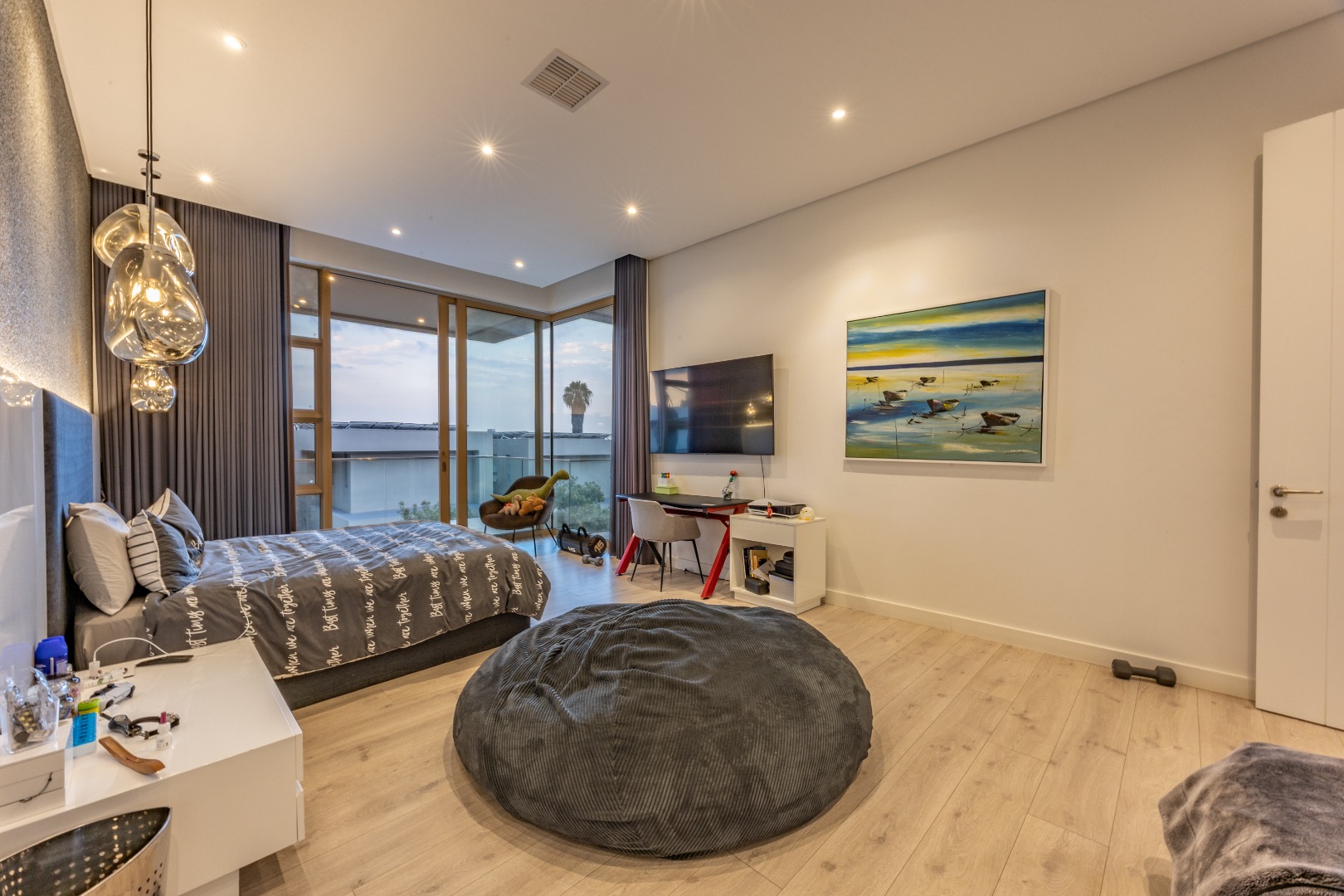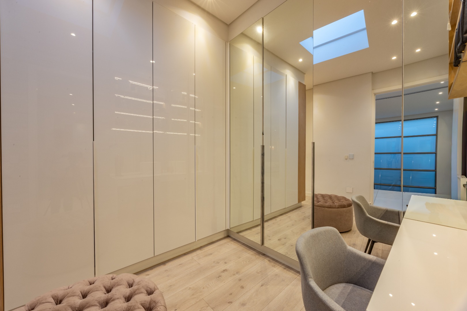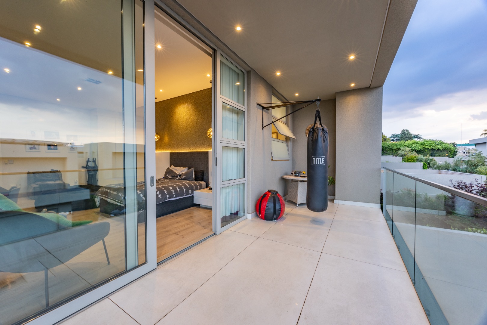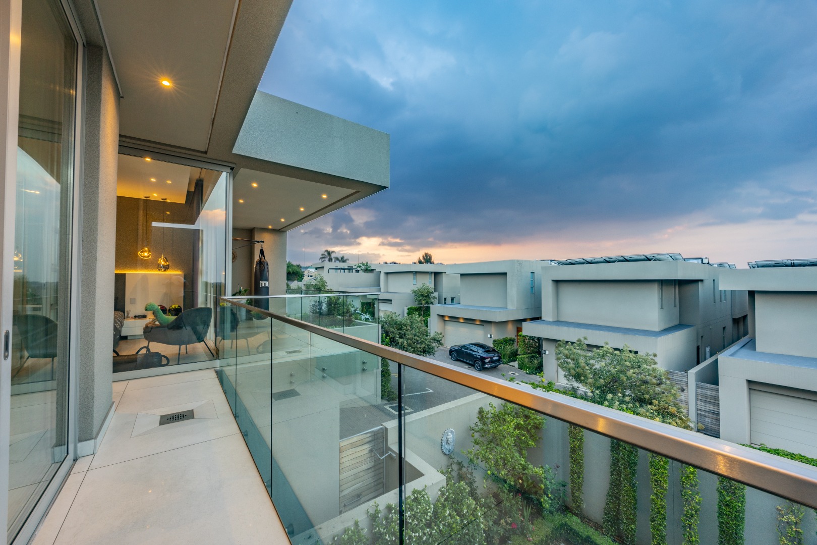 Upstairs, the luxury continues. The main bedroom suite is a true retreat, featuring a massive walk-in dressing area, an opulent full ensuite bathroom, and a private balcony framing breathtaking views of the Sandton skyline and golden sunsets. Each of the four spacious ensuite bedrooms is beautifully furnished, featuring walk-in closets, premium finishes, and abundant natural light — the result of the home’s clever design and strategically placed skylights that allow sunlight to pour in throughout the day. Two bedrooms enjoy access to expansive balconies, creating serene spaces for morning coffee or evening reflection.