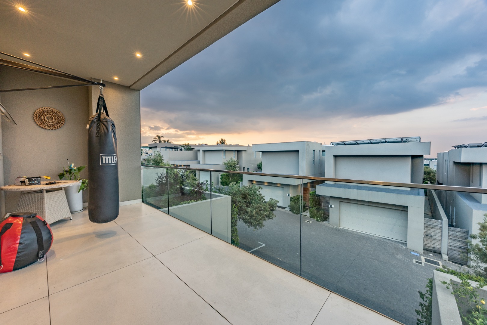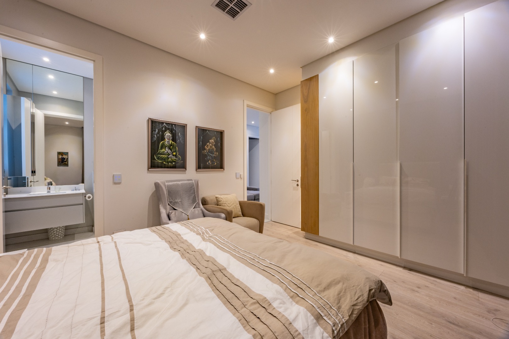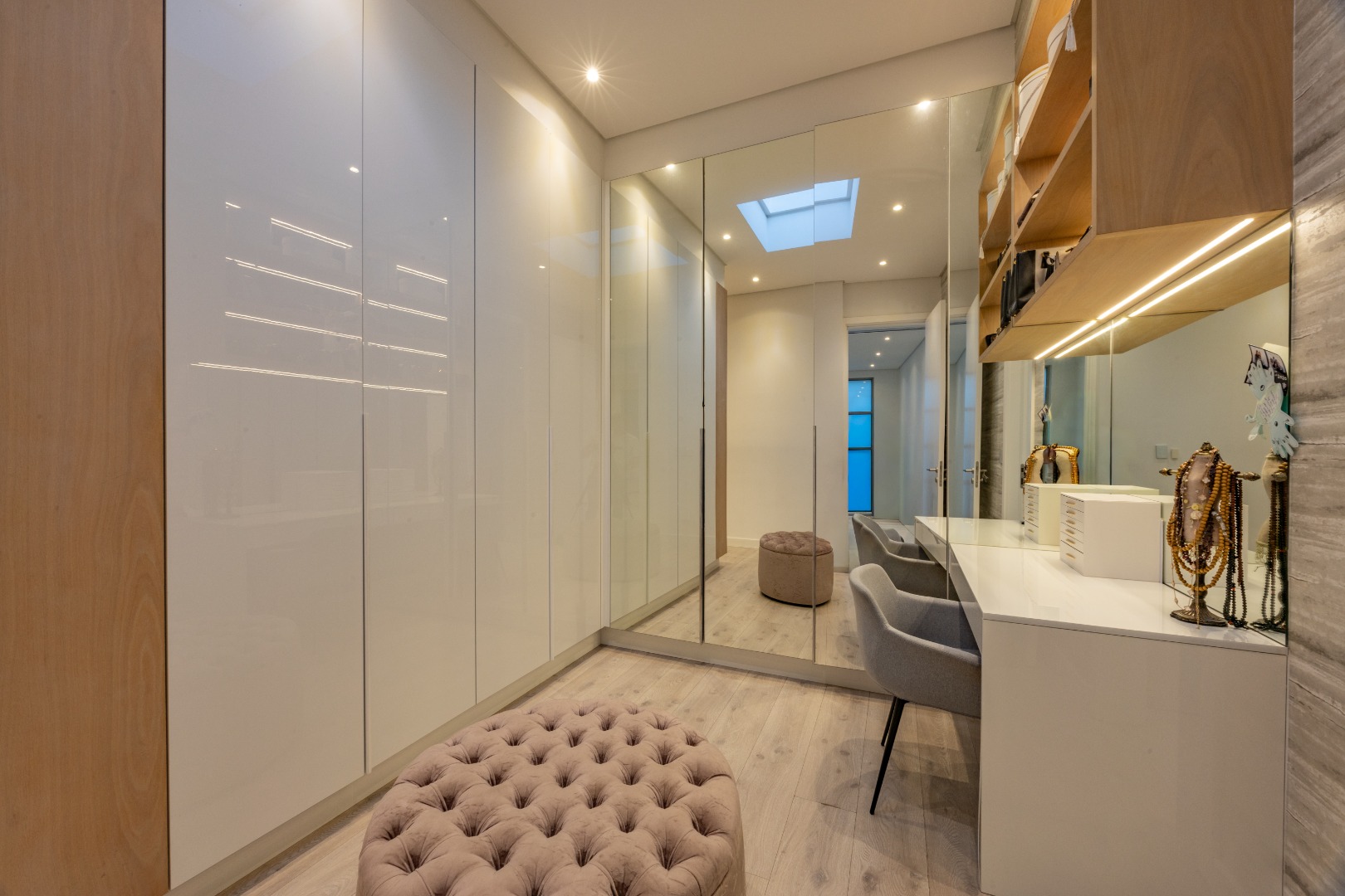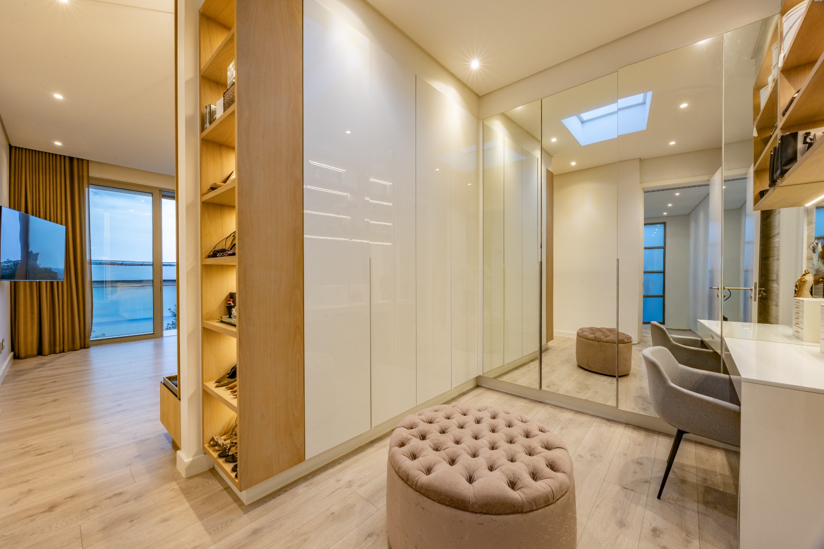 Upstairs, the luxury continues. The main bedroom suite is a true retreat, featuring a massive walk-in dressing area, an opulent full ensuite bathroom, and a private balcony framing breathtaking views of the Sandton skyline and golden sunsets. Each of the four spacious ensuite bedrooms is beautifully furnished, featuring walk-in closets, premium finishes, and abundant natural light — the result of the home’s clever design and strategically placed skylights that allow sunlight to pour in throughout the day. Two bedrooms enjoy access to expansive balconies, creating serene spaces for morning coffee or evening reflection.