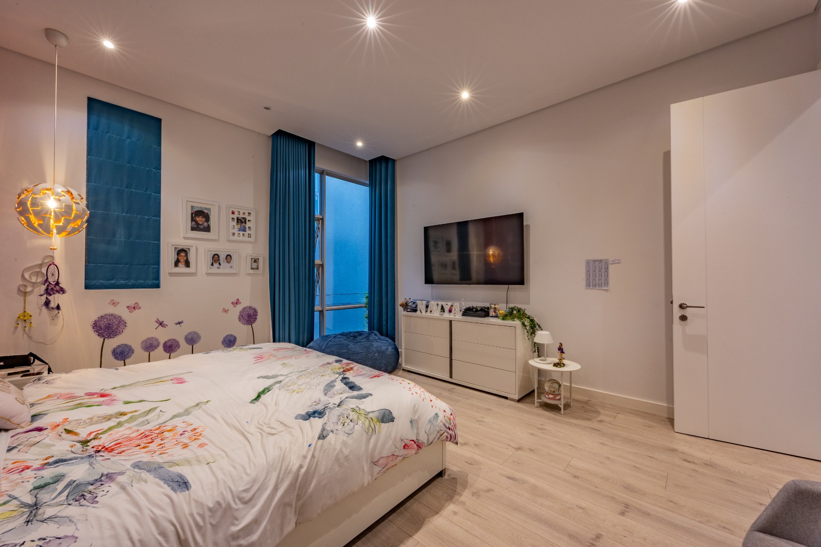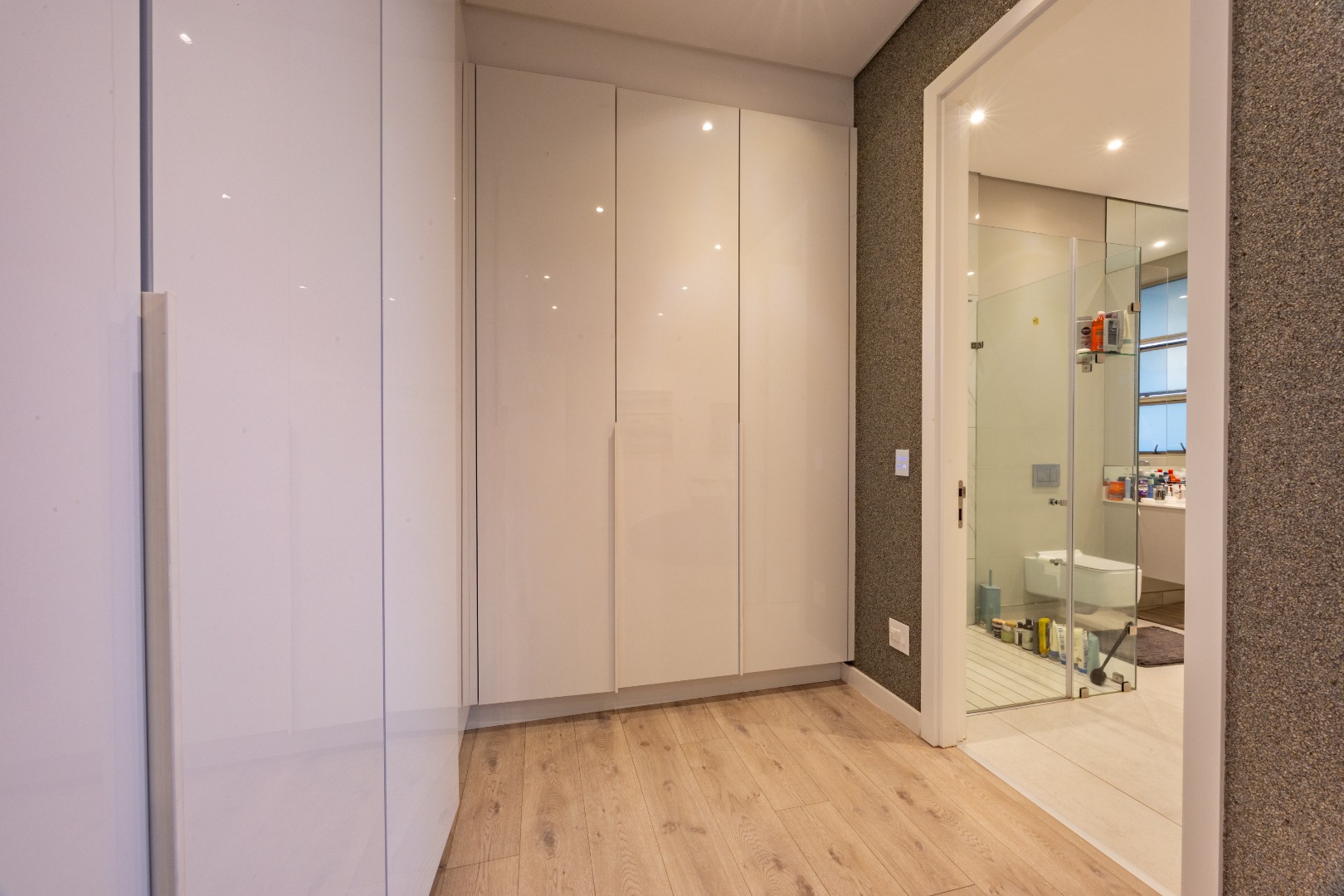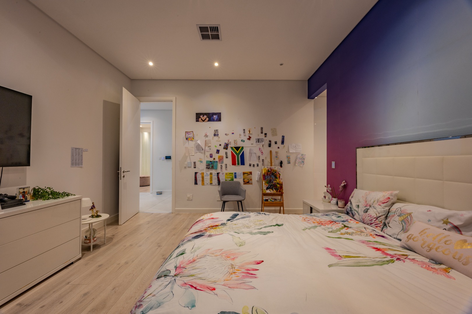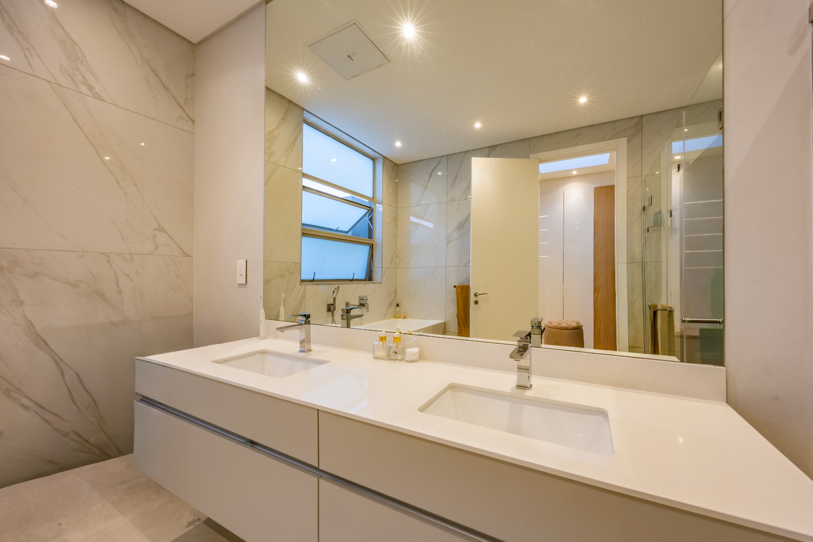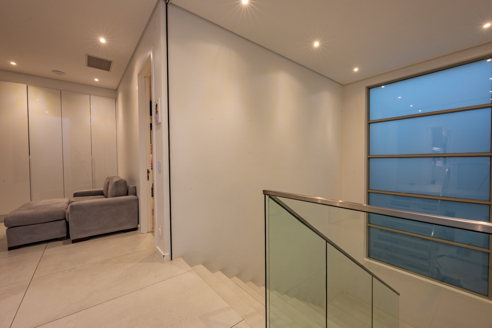 Upstairs, the luxury continues. The main bedroom suite is a true retreat, featuring a massive walk-in dressing area, an opulent full ensuite bathroom, and a private balcony framing breathtaking views of the Sandton skyline and golden sunsets. Each of the four spacious ensuite bedrooms is beautifully furnished, featuring walk-in closets, premium finishes, and abundant natural light — the result of the home’s clever design and strategically placed skylights that allow sunlight to pour in throughout the day. Two bedrooms enjoy access to expansive balconies, creating serene spaces for morning coffee or evening reflection.