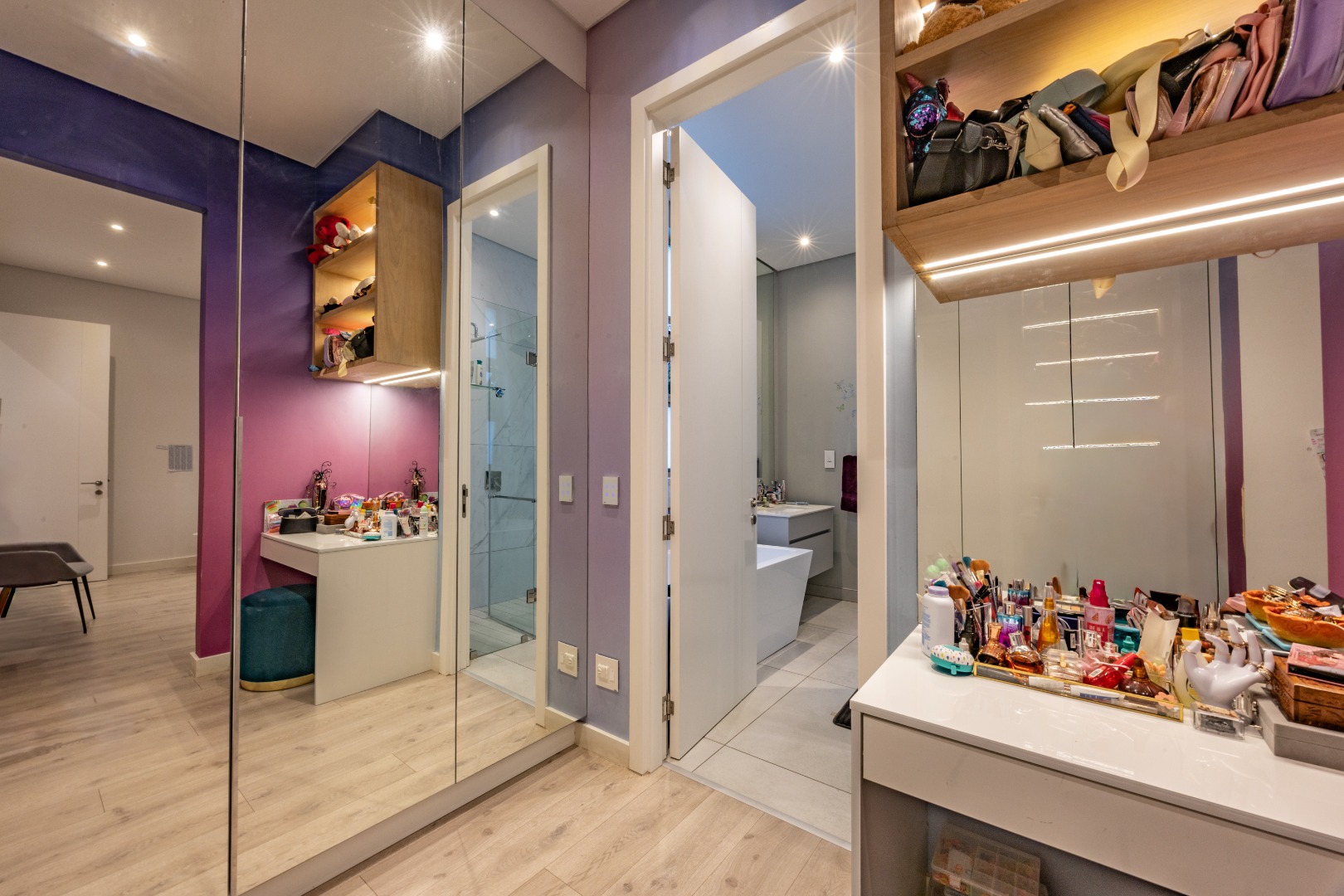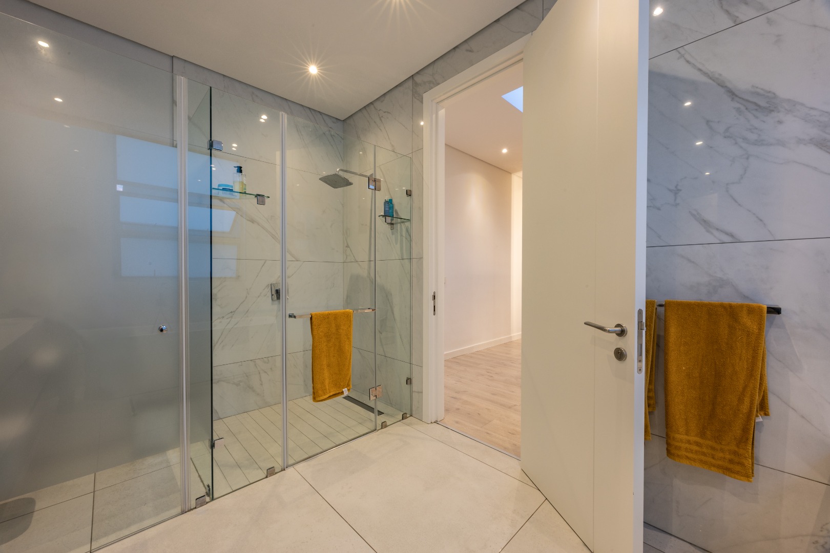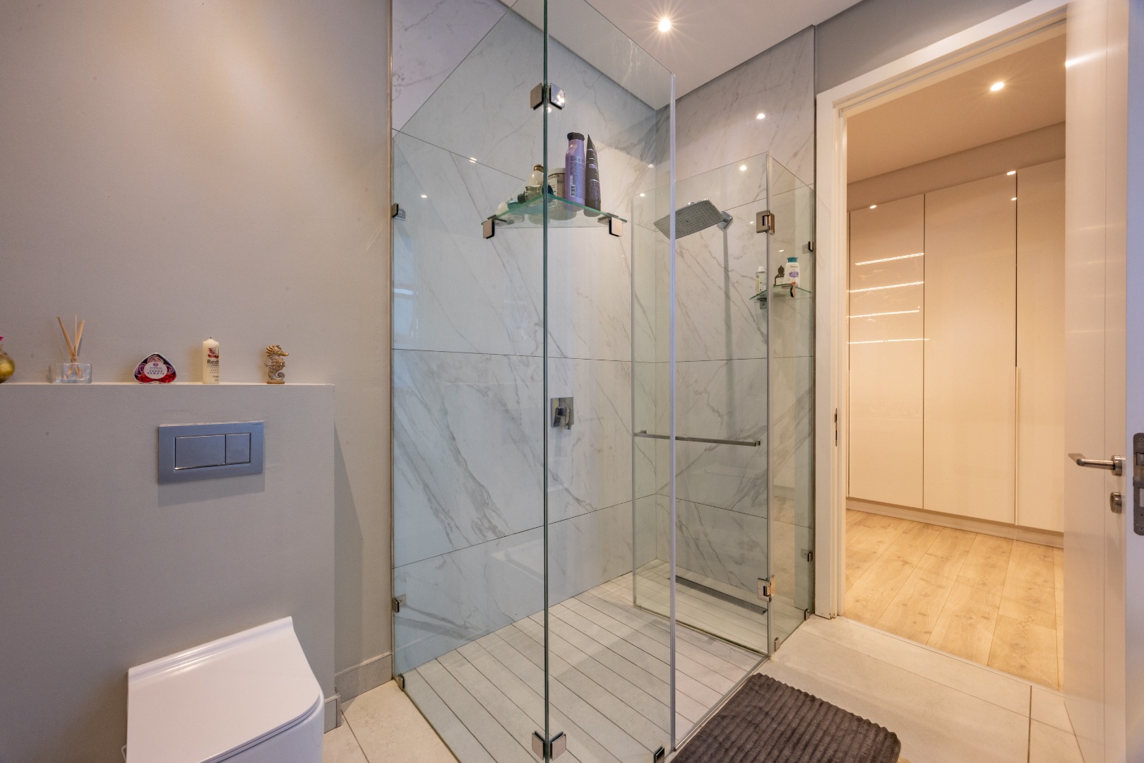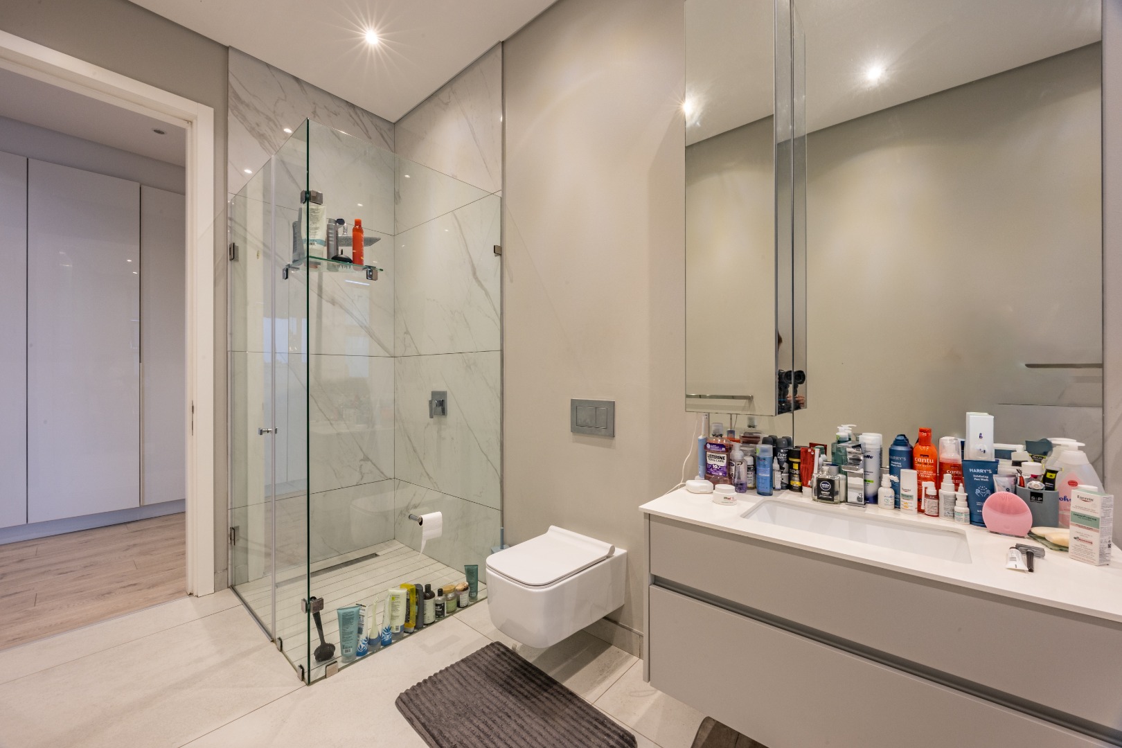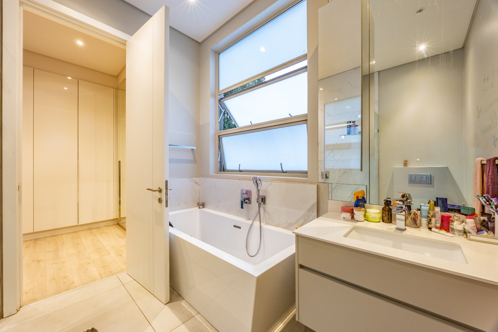 Upstairs, the luxury continues. The main bedroom suite is a true retreat, featuring a massive walk-in dressing area, an opulent full ensuite bathroom, and a private balcony framing breathtaking views of the Sandton skyline and golden sunsets. Each of the four spacious ensuite bedrooms is beautifully furnished, featuring walk-in closets, premium finishes, and abundant natural light — the result of the home’s clever design and strategically placed skylights that allow sunlight to pour in throughout the day. Two bedrooms enjoy access to expansive balconies, creating serene spaces for morning coffee or evening reflection.